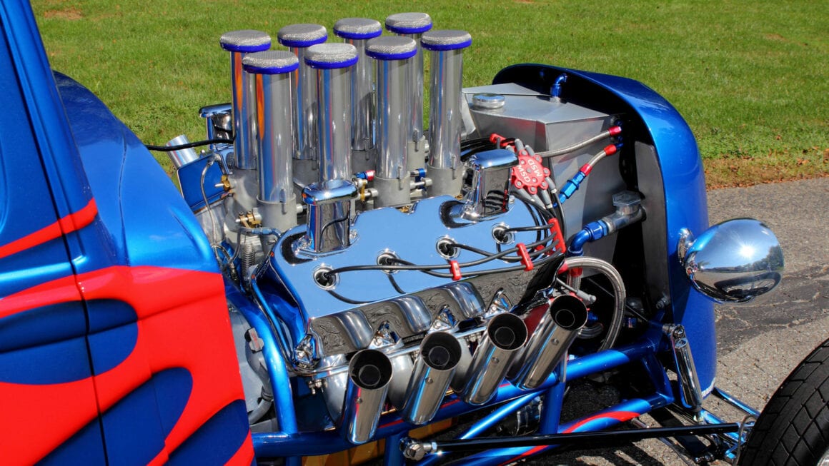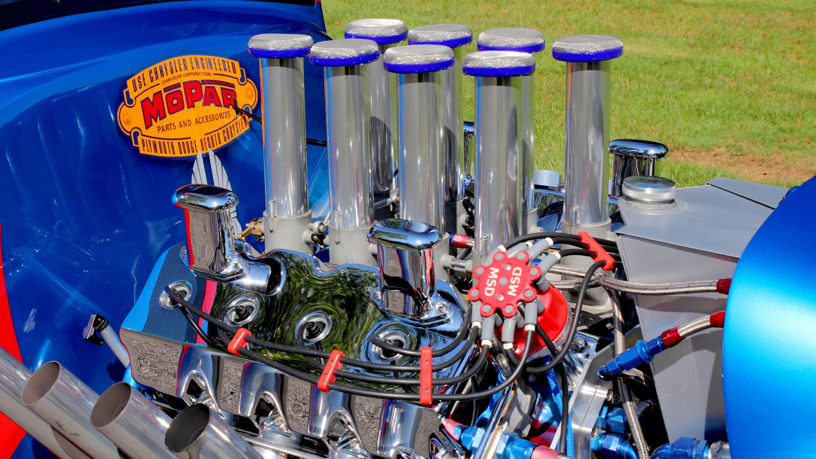 La carrosserie en acier a été personnalisée et montée sur un châssis tubulaire, mais ce qui attire le plus l’attention, c’est le moteur V8 Hemi 472ci niché entre la calandre et la carrosserie habitable dans l’empattement allongé. La compression 12:1, et les têtes en aluminium Keith Black, en sus d’accessoires chromés, de tuyaux de collecteurs de style zoomie déconcertants et d’une véritable injection mécanique Hilborn avec des hautes cheminées, sont un ode à la joie des Hot-Rodders. La transmission automatique Chrysler A727 TorqueFlite est soutenue par un pont arrière Moser de 9po avec des pièces Richmond 4.56: 1.