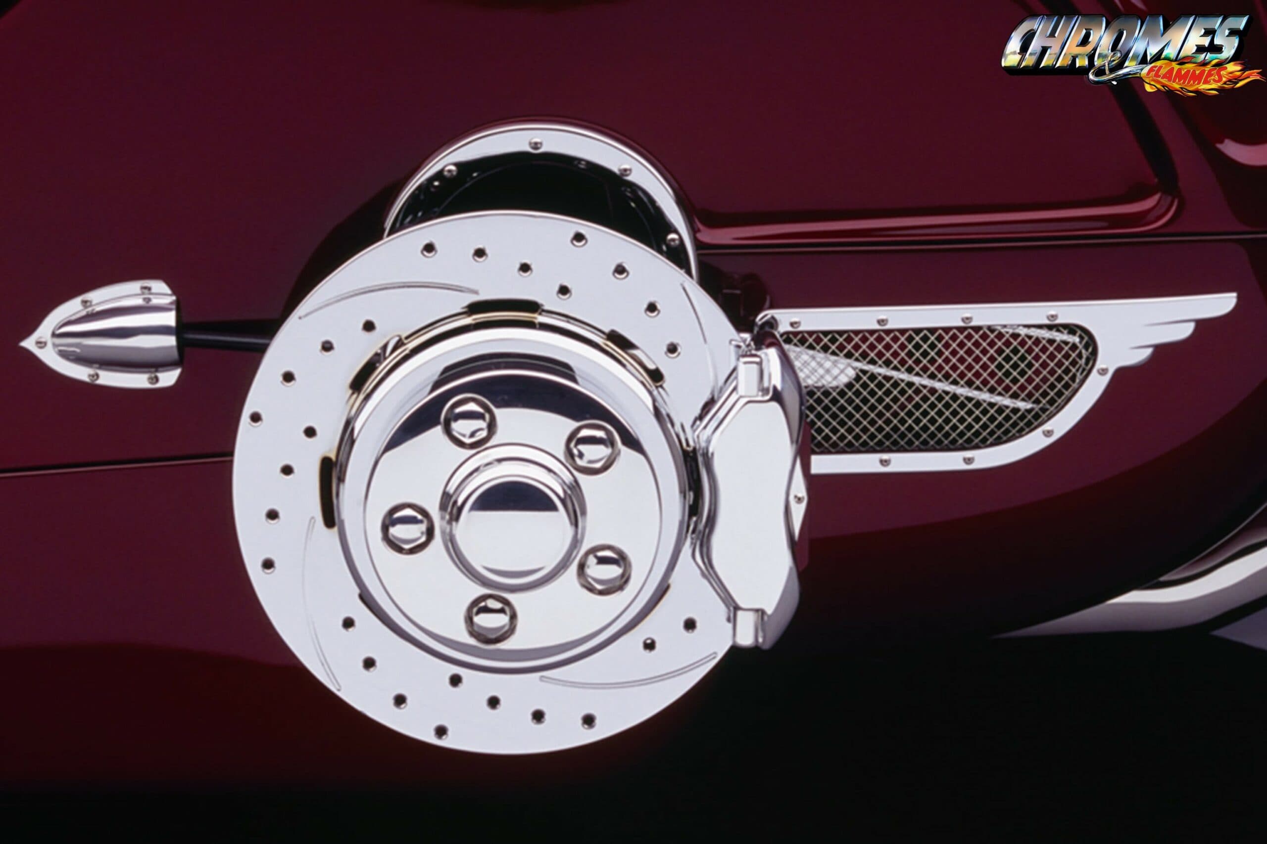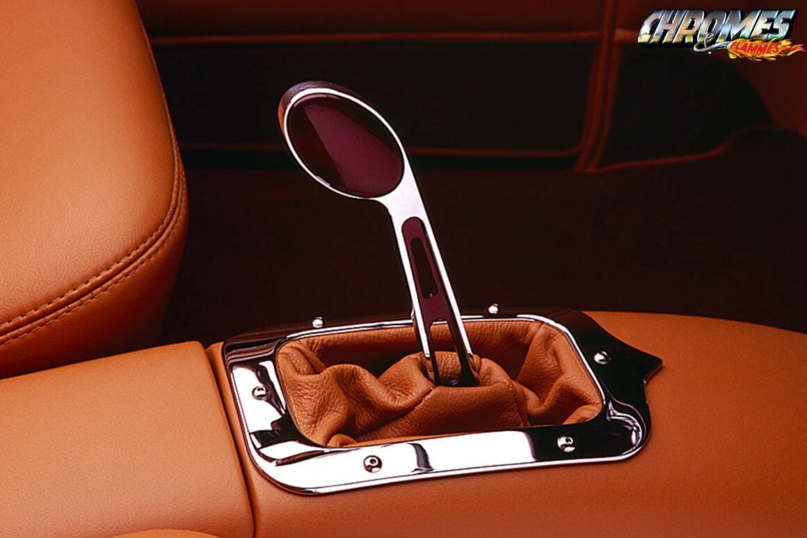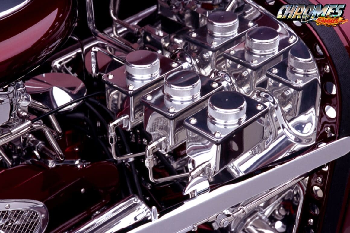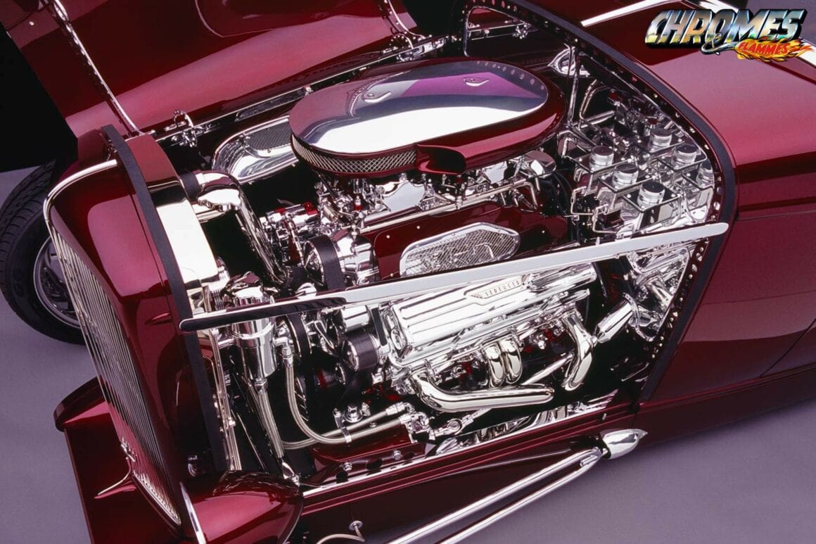 Le futur propriétaire n’aimant plus les persiennes (“louvers”) habituelles, alors l’équipe a mis au point des “ampoules de vitesse” à grillage métallique comme méthode alternative pour extraire la chaleur du compartiment moteur. Steve Moal s’est inspiré de points similaires utilisés par Duesenberg, Cord et Bugatti. Rien de moins ! Le génie à l’état pur ! Le cockpit arbore également un volant personnalisé suivant le même design Moal que les jantes, des pédales sur mesure et un superbe panneau qui abrite un ensemble d’instruments spécialement conçus par Classic-Instruments. Alors finalement, nous arrivons à la meilleure partie, le Donk ! Très souvent, les gens construisent des Hot-Rods avec les signes externes faisant allusion à une puissance massive, mais débitent ensuite l’excuse : “Je voulais quelque chose de fiable” et fourrent un moteur de tondeuse à gazon de tourbière sous le capot. Bien sûr, il sera détaillé jusqu’au bout et aura l’air d’avoir couté un million de dollars, mais c’est toujours une merde chromée sous tout ce chrome et cette peinture.