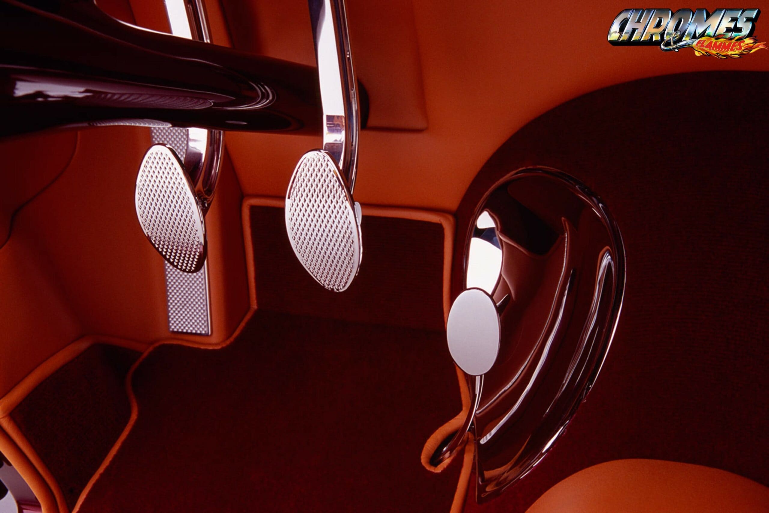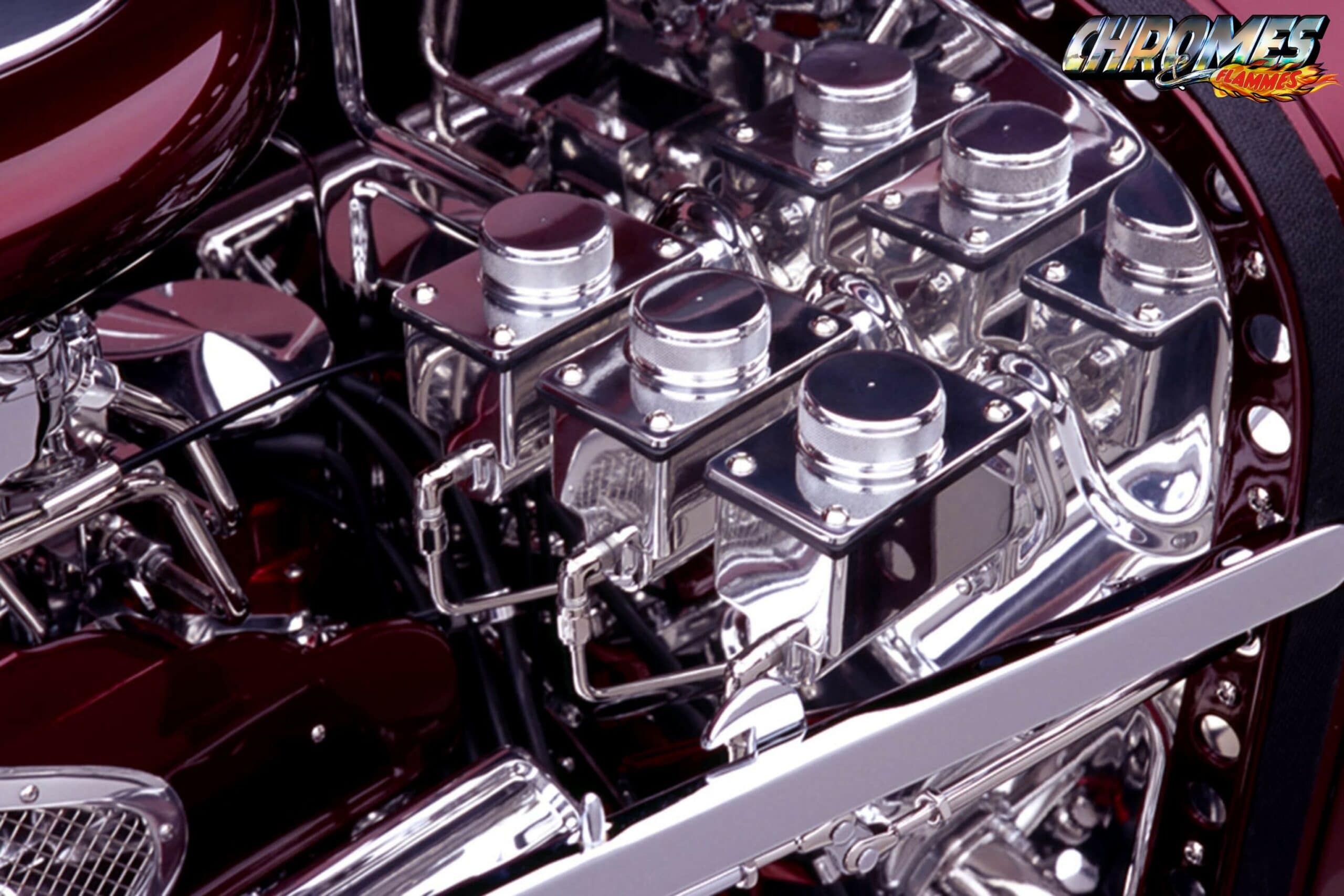 Quand j’écris “construit à la main”, je l’ai vu naître, ce Hot-Rod n’est pas seulement issu de vissages et boulonnages d’un tas de pièces achetées en magasin, cette voiture a été sculptée et façonnée “à la main” à partir d’acier brut et d’alliages divers. Par exemple, les jantes ont un design personnalisé unique de Steve Moal, taillé à partir de blocs d’alu “Billet” par Li’l John Buttera. Vous n’êtes pas impressionné ? John a également fait d’autres choses dont les couvertures des magazines “Rocker” qui comportaientuchroniquement le nom de la voiture “Sedeuced”, comme logo… Tu bailles encore mon Popu ? D’accord, je patiente, tu liras la suite à partir d’ici… Et si cela ne t’impressionne toujours pas, je t’informe avec amour et patience qu’il a également sculpté le puisard du monstre. C’est niveau Élite. Tout a été poli finition miroir pour enlever le “fraîchement fraisé” si populaire dans les années ’80. Même le châssis n’est pas ce qu’il semble. Il ressemble au monde entier comme un ensemble de rails’32, mais l’ensemble du châssis est une structure tubulaire assemblée par Moal en personne.