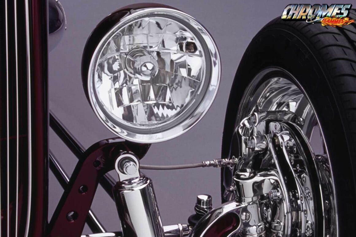 Les tubes du châssis principal ont un diamètre de 15/8 pouces et sont soudés ensemble avec des tubes de 11/4. En effet, les rails ne sont en réalité que des panneaux-masques pour cacher le châssis. L’avantage de concevoir le châssis de cette façon est qu’il est beaucoup plus léger qu’il semble lourd ! L’astuce de Ouf ! Il a été rendu légèrement plus long dans l’empattement à 110 pouces, quatre pouces de plus qu’un châssis standard de ’32. Cela a également permis de composer un équilibre de poids 50:50 hautement souhaitable pour une bonne maniabilité, mais rare dans les Hot-Rod’s qui dans beaucoup de cas sont similaires en comportement routier à des machines à laver sur roulettes. Toujours à la recherche de complexités ahurissantes, plutôt que d’utiliser la suspension avant à double bras “A” plus courante avec un emplacement d’essieu à quatre tirants réglables (que personne ne règle jamais), le concepteur a opté pour un essieu avant traditionnel percé de trous-trous, qui semble fixé au châssis avec des épingles à cheveux effilées et suspendues sur des barres de torsion au lieu du ressort transversal bien macho, de style usine d’hommes muscleux et huilés…