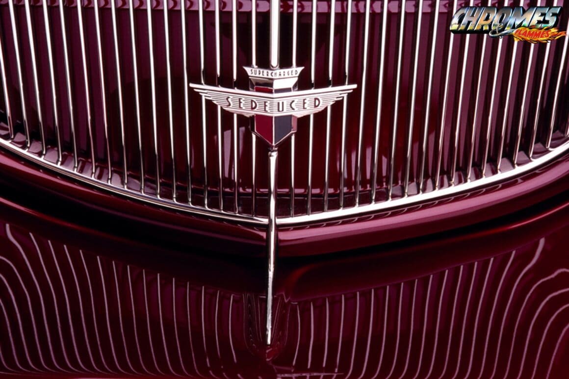 Voilà, tu n’es pas plus avancé mon Popu… Pire, je sens que ça t’énerve ! Dans le domaine de la psychologie, il est souvent fait référence au test du canard sur le plan des vices, pour souligner le renoncement à la pensée critique qu’implique cette analogie. Le test du canard est fréquemment considéré comme un cas classique de biais cognitif… Donc, je vais continuer mon œuvre savante en causant sans détour du Hot-Rod (mais lequel ?) pour en affirmer l’existence ! Pour preuve, ce Hot-Rod a une coque de calandre distinctive, une pièce de design qui est souvent décrite comme un exemple de style Art déco dont le profil épuré le définit comme un “Hot-Rod -Art-Déco” ! Celui de cet article est donc un Hot-Rod Ford’B’32 équipé d’un V8 392ci Hemi-powered de 1.000chevaux. Mais tout n’est pas comme il semble. En fait, toute la voiture a été construite “à la main” à partir de zéro par Steve Moal et son équipe nommée Moal Coachbuilders (il s’agit de sa femme Theresa et de ses fils Michael et David). Le client était d’ailleurs, vivant dans un port de pêcheurs provençaux, économisant les 200.000 US$ demandés. Le “Power for Sedeuced” est (j’allais oublier de l’écrire) surmonté d’un compresseur Whipple et d’une paire de Mighty Demons de 750cfm.