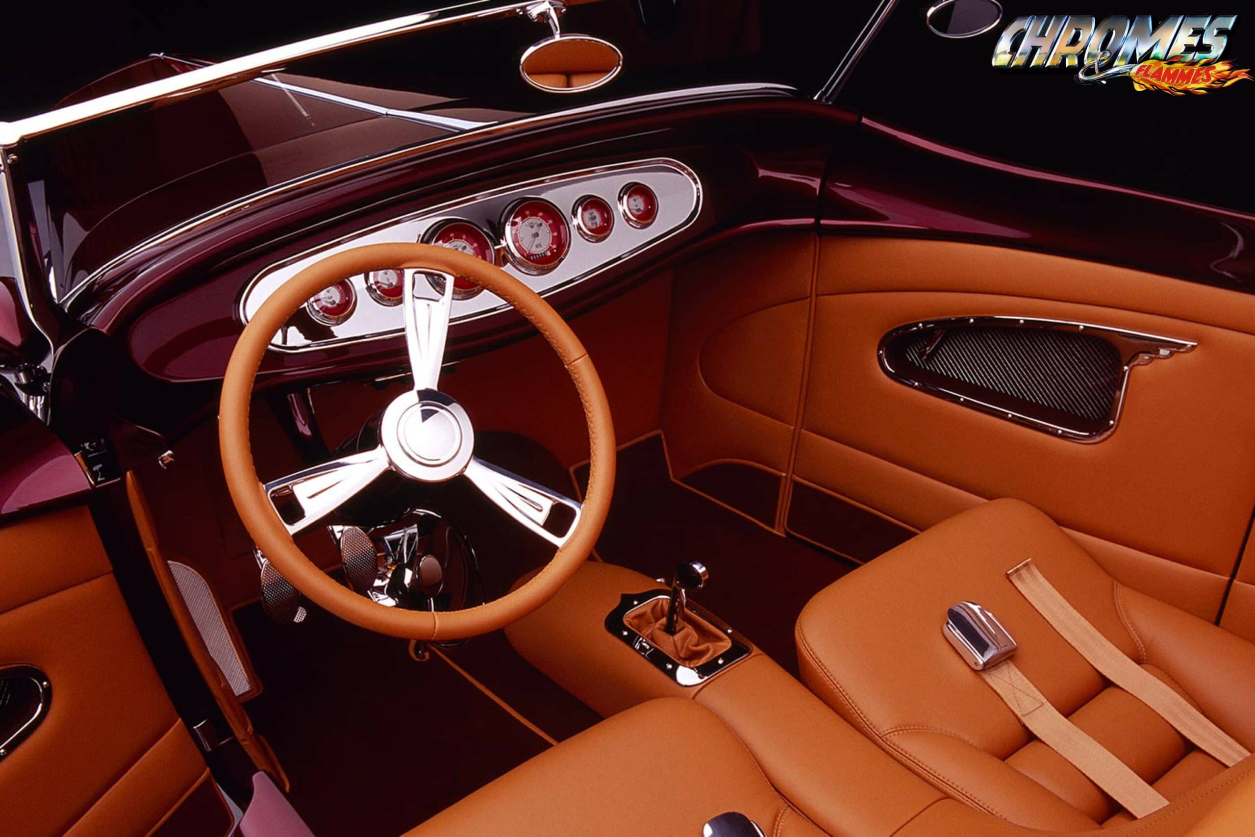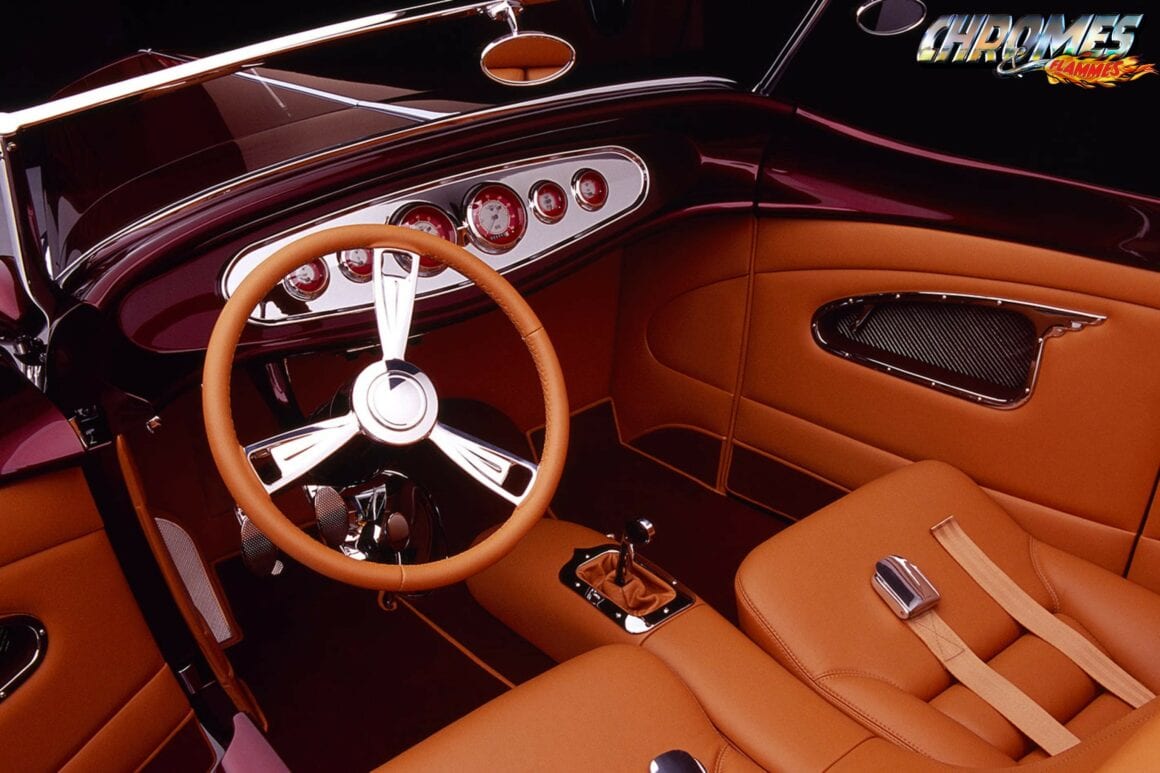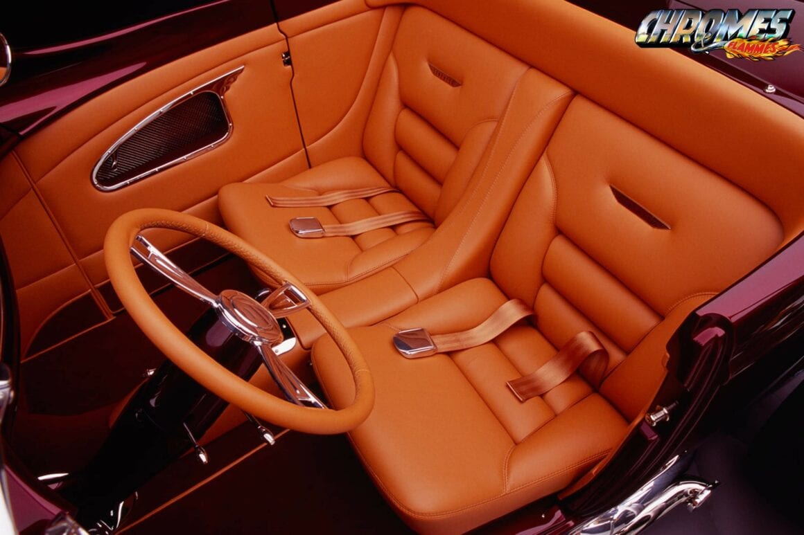 Le capot a été étiré et la calandre élargie et raccourcie. Les portes sont également plus longues ainsi que la carrosserie dont un examen attentif révèle qu’elle a été légèrement allongée. Le tout a ensuite été recouvert d’une couche impeccable de PPG Sedeuced Red Pearl par le célèbre peintre (aux USA) Darrel Hollenbeck. Les feux arrière peuvent faire ou défaire un Hot-Rod, c’est pourquoi l’équipe Moal a créé un ensemble personnalisé similaire aux larmes Ford’39 souvent utilisées. Ils ont été légèrement francisés et habillés avec un tour chromé sur mesure. Ils sont un clin d’œil très “IN” au style classique de la Ford ’39, mais sont suffisamment différents pour que les gens s’en rendent compte, du moins les “ceusses” qui prennent le temps de regarder les détails ! Un autre nom que tu vois souvent mentionné dans les histoires de Hot-Rod’s américains, mon Popu, est celui de Sid Chavers. Ses intérieurs sont parmi les plus étonnants et comptent les plus riches clochards assis dessus ! En utilisant du cuir danois teint sur mesure d’une couleur beige foncé, Sid a cousu un intérieur simple mais élégant qui contraste magnifiquement avec le rouge-burgundy profond de l’extérieur.