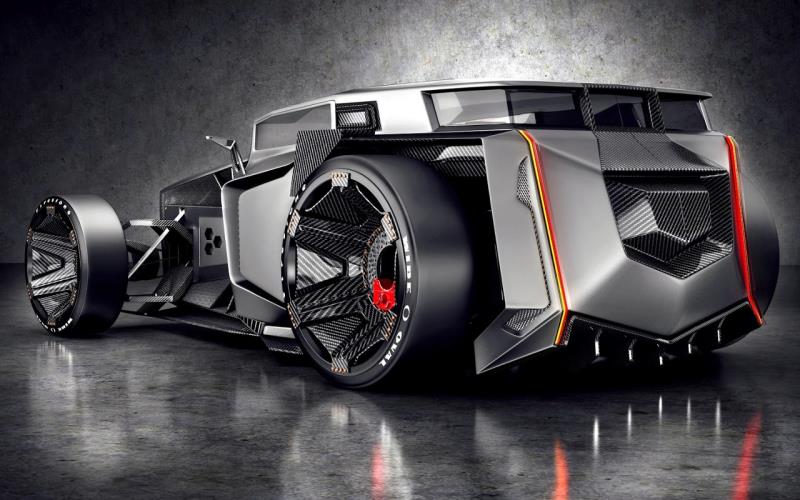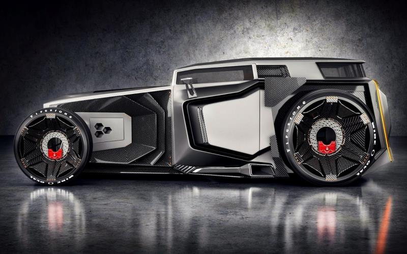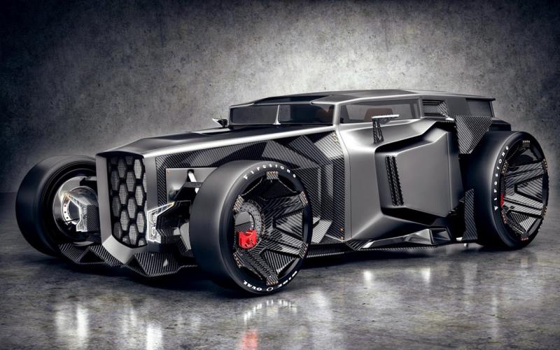 Les minuscules petites fenêtres donnent au conducteur une vue assez étriquée du monde, tandis que les massifs pans de panneaux en fibre de carbone ressemblent plus à un blindage protecteur qu’à une carrosserie élégante. Les roues sont énormes, d’au moins 30 pouces de diamètre… et comme le reste de la voiture, elles sont en fibre de carbone, tandis que le système de freinage est particulièrement étrange (des étriers montés à l’intérieur des disques, qui sont eux-mêmes montés sur des roues hubless), on ne sait pas très bien comment ça fonctionnerait en réalité… Mais ce n’est pas quelque chose pour laquelle quiconque ou quelqu’un en particulier doit ressentir le besoin de s’inquiéter à la hâte… sauf que, sans rien dire à quiconque, ce projet a été récupéré… J’ai en effet découvert plus que des similitudes entre cette création virtuelle grandiose et un Hot-Rod construit en Europe. Dès-lors, cherchant à en savoir plus, j’ai envoyé divers émails aux intéressés, responsables et irresponsables, ainsi qu’à toute une série de nains connus (ou non) pour obtenir des explications. Le lendemain, j’ai réussi à en savoir plus… “LA” vérité m’est apparue dans toute sa splendeur ! EIGHT c’est le nom de la récupération…