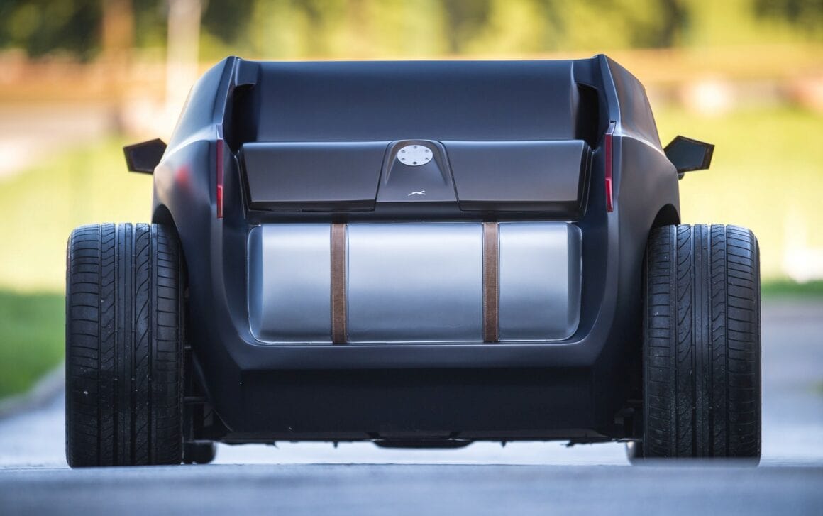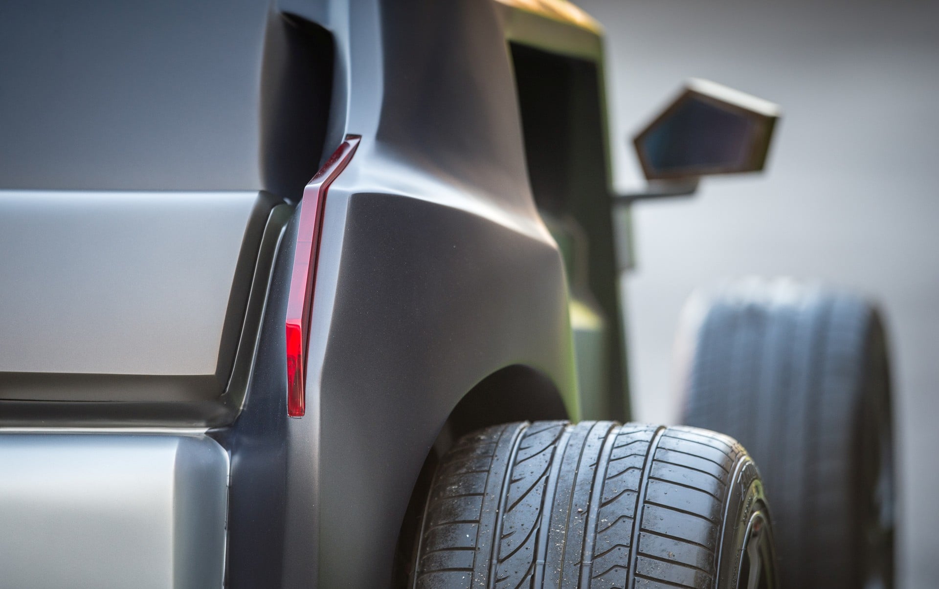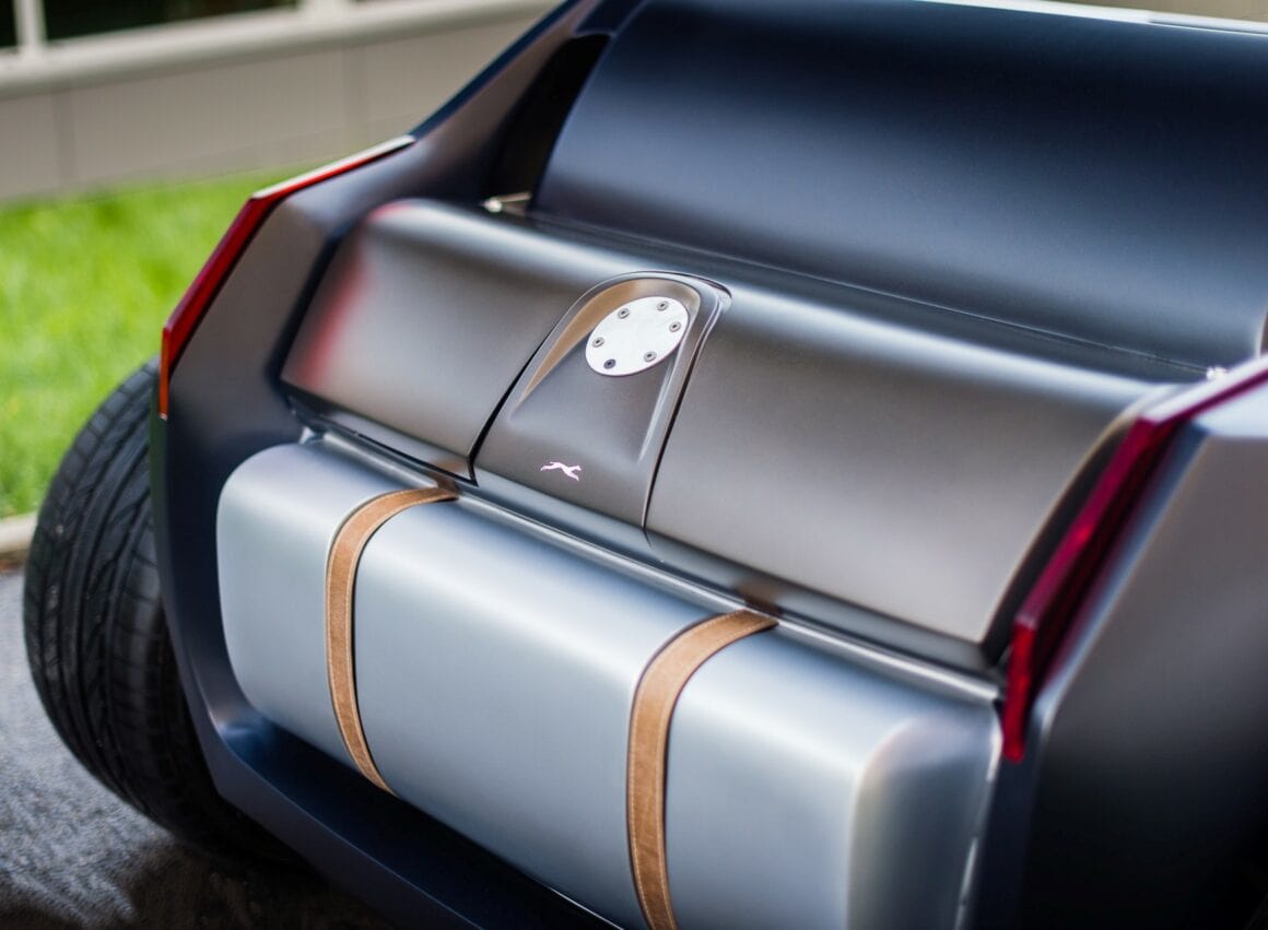 Avec chaque modèle, les élèves essaient d’expérimenter avec les matériaux et les constructions. C’est la première fois que je vois du plastique renforcé de fibres naturelles. Certains composants de l’EIGHT, tels que le boîtier du rétroviseur extérieur, utilisent du lin comme base qui est incrustée dans la résine. L’une des choses que j’aime vraiment à propos de l’école de design, c’est la façon dont elle implique non seulement les étudiants actuels qui travaillent sur le projet, mais aussi les anciens élèves. Composites 21 est une entreprise fondée par deux anciens étudiants de l’ESPERA Sbarro, spécialisée dans le travail du composite et du cuir. Ils ont fait toute la sellerie à l’intérieur du concept EIGHT. Le réservoir de carburant repose sous un capot en fibre de verre à l’arrière de la voiture et une partie du boîtier est maintenue par des sangles en cuir de la même finition que les sièges. Des dalles de plexiglas coloré avec des LED intégrées à l’intérieur agissent comme des blocs de feux arrière à l’aspect futuriste. Dans le petit espace le long des côtés du nez se trouvent des bandes de plastique translucide, sous lesquelles se trouvent des LED qui agissent comme des phares.