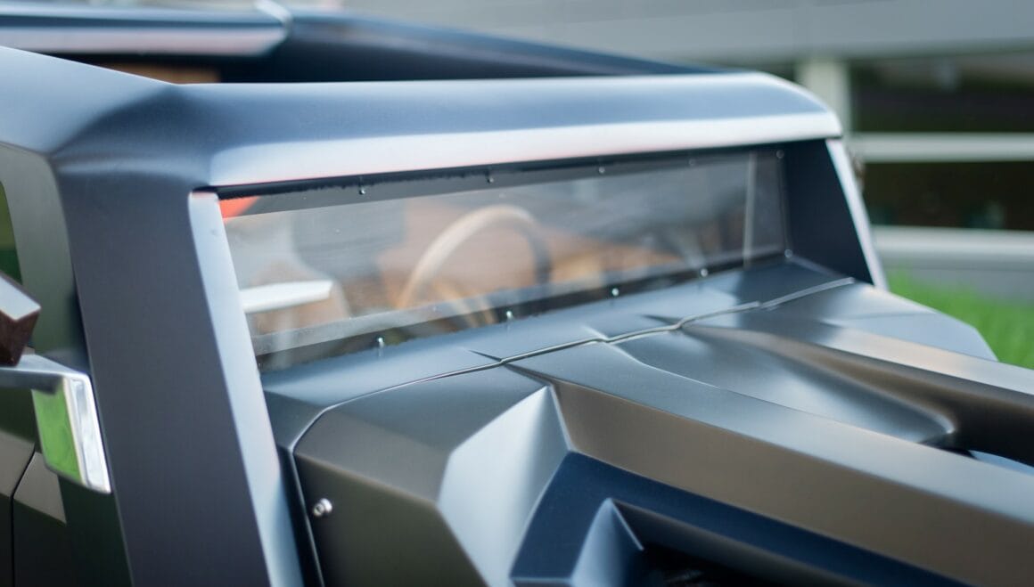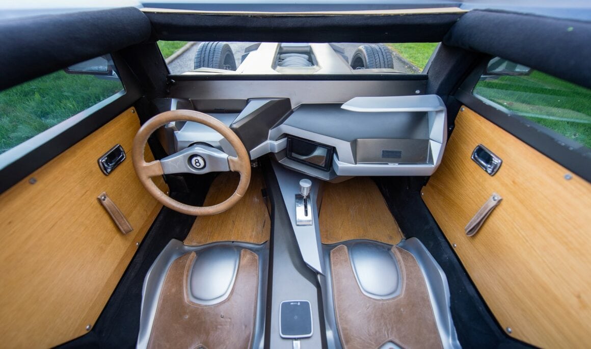 L’école de design travaille avec AVO depuis près d’une décennie et est donc bien consciente des délais d’exécution de ces projets fous. À l’intérieur, c’est une autre histoire. Les panneaux de porte, par exemple, sont fabriqués en bois véritable avec des sangles de traction en cuir au lieu de poignées conventionnelles. À l’instar de la Sbarro Grand Prix, les sièges de l’EIGHT sont des bases en fibre de verre recouvertes d’un rembourrage asymétrique en cuir cousu main qui remplace les coussins d’assise. Il n’y a pas beaucoup d’isolation des éléments dans l’habitacle, qui est un mélange de fibre de verre, de cuir et de bois. Les vitres latérales fixes et le pare-brise sont en plexiglas haute résistance. Comme il se doit, le volant est une unité personnalisée recouverte de cuir avec une boule Magic 8 au milieu. Comme cette voiture a été conçue dans le cadre d’un cocktail de démonstration technologique par Orange, il y a des supports sur le tableau de bord pour les tablettes qui peuvent être utilisés pour la télémétrie, la navigation et le divertissement. Et cette petite boîte noire au milieu est un chargeur à induction pour appareils mobiles. L’aspect haché des hot rods classiques a été conservé, bien que dans une configuration extrêmement inclinée.