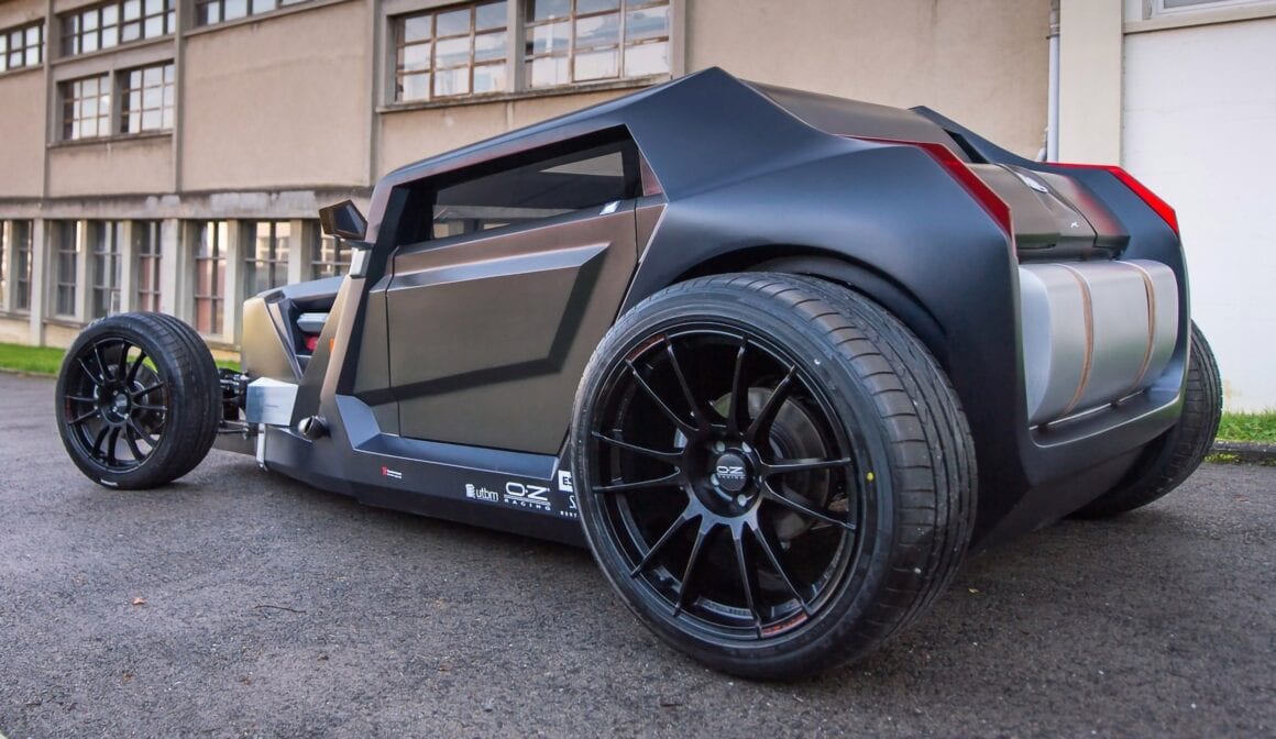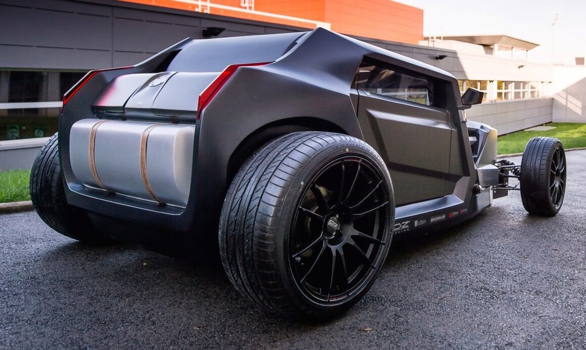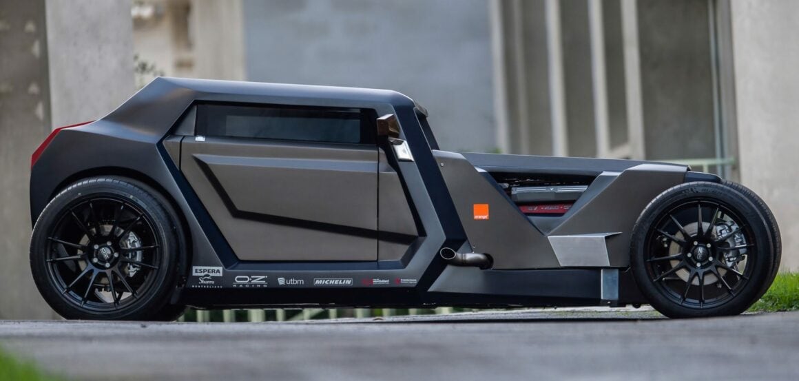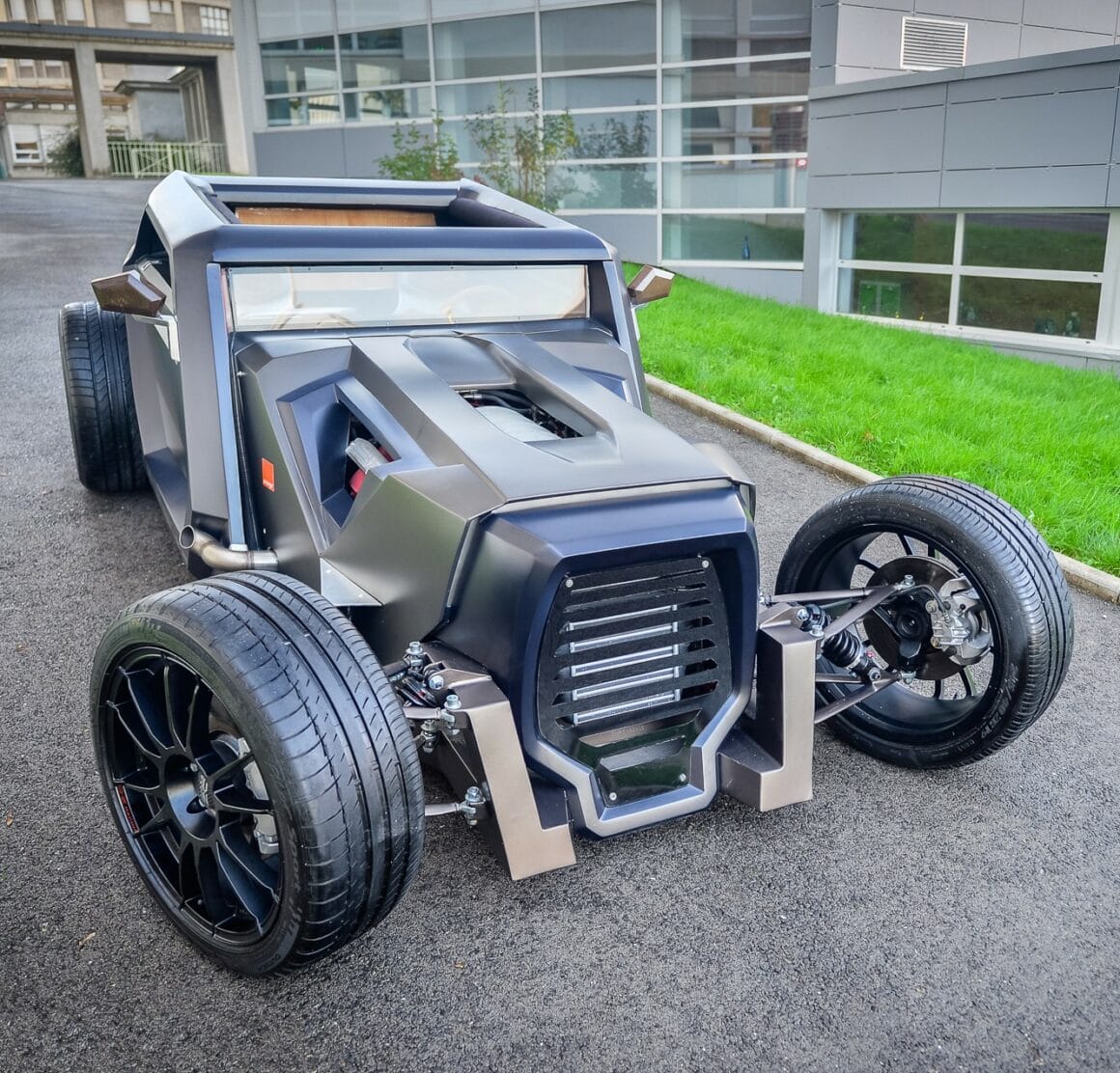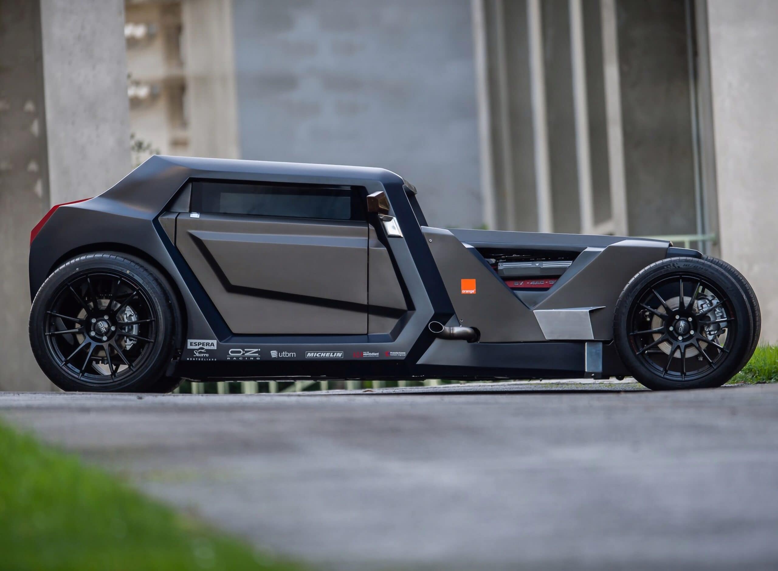 Lorsque j’ai parlé à Anthony, un enseignant de l’ESPERA Sbarro, il m’a expliqué que presque tous les groupes motopropulseurs utilisés dans les projets des étudiants proviennent d’épaves de voitures qui, autrement, seraient jetées. Pour le budget relativement faible de ces constructions, c’est tout à fait logique. Mais donner une nouvelle vocation à ces moteurs, c’est incroyablement cool. Avec l’extrémité avant du concept EIGHT bourrée de l’intercooler, le V8 aspire de l’air frais à travers des écopes en aluminium situées en dessous, dont les filtres à air se trouvent de chaque côté de la voiture. Il expire par l’intermédiaire d’échappements latéraux personnalisés fixés directement aux turbos, de sorte que le son n’est qu’une violence pure et non diluée, crachant de grandes quantités de carburant non brûlé et produisant des flammes sur le dépassement. En l’absence de toit ou de vitres scellées sur l’EIGHT, vous pouvez entendre le V8 hurlant et les turbos sifflants plus clairement que jamais lorsque vous tirez dessus, pneus arrière en feu (Michelin Pilot Sports 245/40ZR19 AV et Bridgestone Potenza RE050A 305/35ZR20 AR montés sur jantes OZ Racing Ultraleggera)…