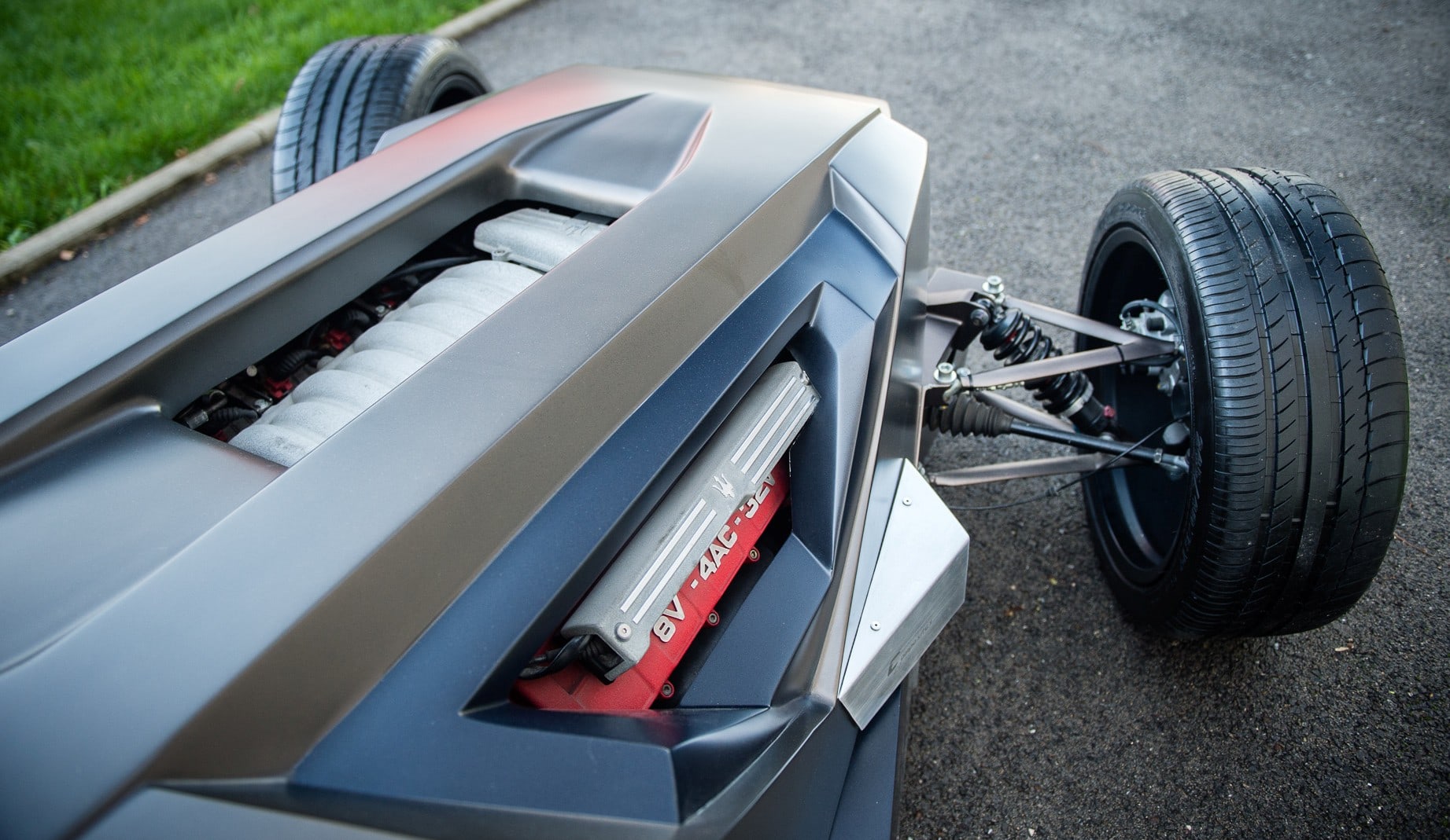 Le fondateur de l’école de design et légendaire designer automobile Franco Sbarro voulait vraiment que Michelin sur la voiture à l’approche du prochain Salon de l’auto de Genève, mais Michelin n’a pas été en mesure de fournir les pneus qui s’adapteraient aux roues arrière dans un délai aussi court, de sorte que la voiture a conservé les arrières Bridgestone. Ce sont les mêmes pneus que ceux qui équipent normalement une Ferrari 599 GTB Fiorano. Comme tous les autres concepts Sbarro, sous l’EIGHT se trouve un châssis tubulaire auquel est fixée une peau en fibre de verre, le châssis et la peau étant fabriqués en interne. Il y a ensuite des sections d’acier supplémentaires attachées au cadre tubulaire comme ce renfort à l’avant où les composants de suspension sont montés, ce qui agit comme une armure pour le châssis et prête également à l’aspect agressif de la voiture. Les concept-cars n’ont généralement pas besoin de rouler, mais les étudiants voulaient qu’il s’agisse d’un prototype fonctionnel. Au cours de la phase de développement, ils ont envoyé leurs plans pour la voiture à AVO Performance – une société spécialisée dans les unités de suspension personnalisées – qui a fabriqué une unité personnalisée pour l’EIGHT.