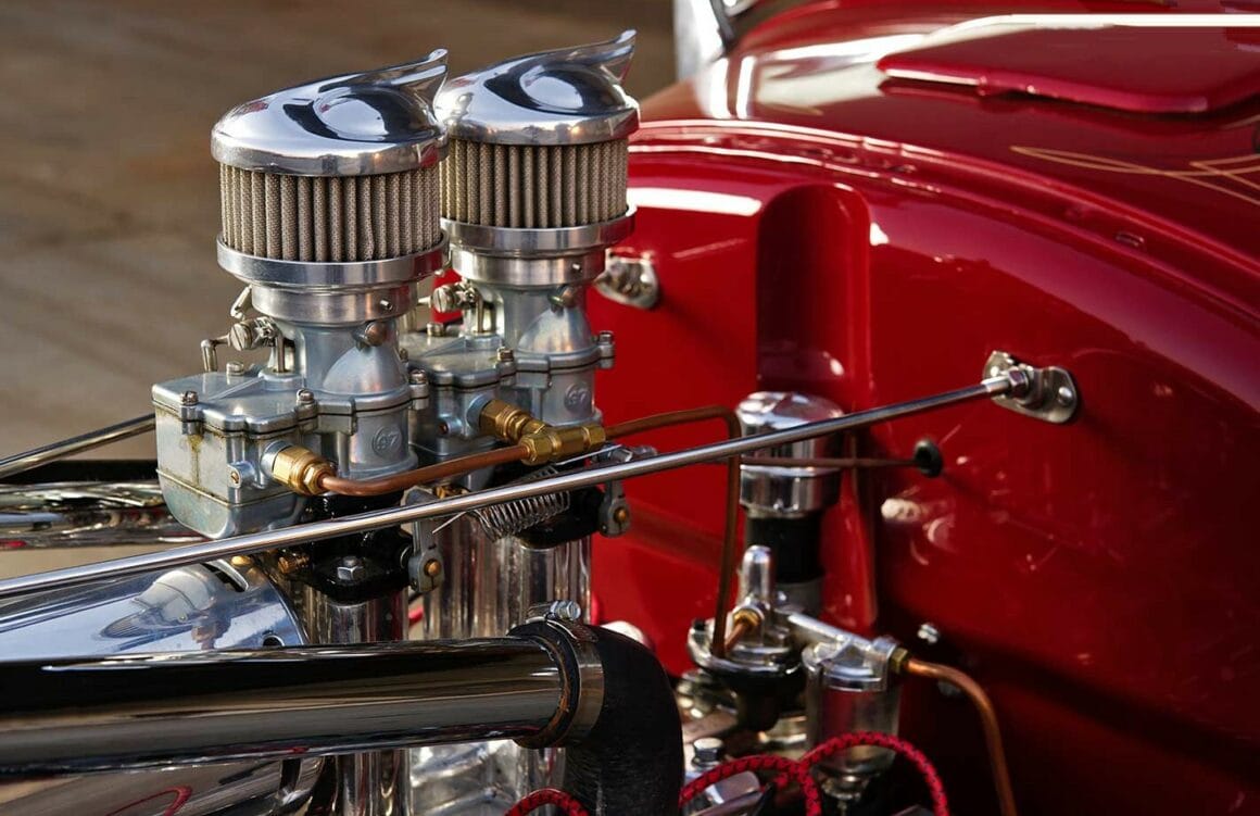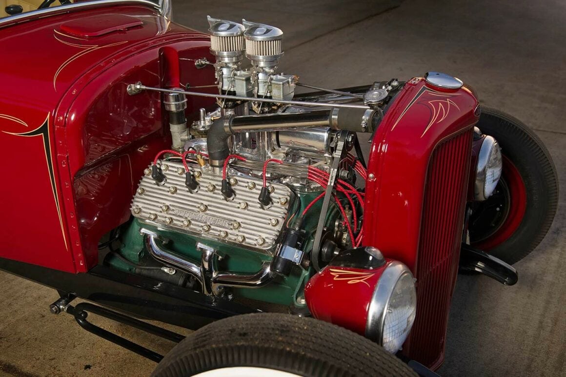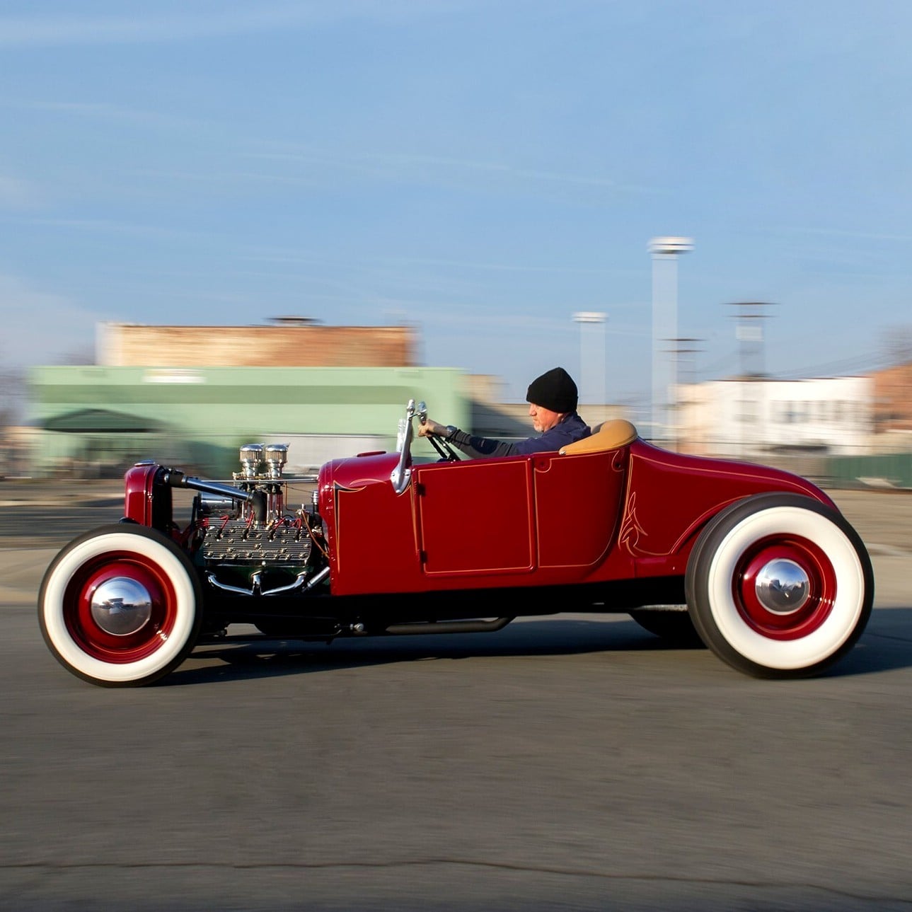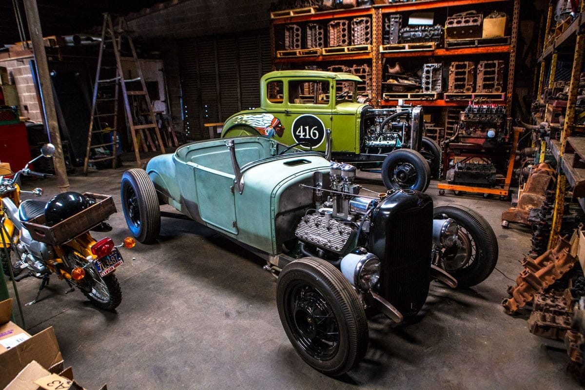 Pour en terminer, voici quelques infos sur le Hot Rod vedette de cet article : Moteur : Ford V8 Flathead 276ci de 1948 dénommé Ford-59AB / Carburateur : Twin Big 97s / Culasses : Offenhauser 425 / Radiateur : Walker / Échappement et collecteur : Speedway modifiés / Allumage : Distributeur Stromberg E-Fire / Shift’Box : Ford 1939 avec engrenages / Différentiel : Mercury 1941 avec Qwick Change Mike Moore / Amortisseurs : Pete & Jake’s / Direction : Vega cross-steer / Freins : MT Car Products Lincoln drums / Jantes : Ford 1940 ; 16×4 f, 16×4.5 r / Pneus : Cokéfaction 4.50-16 (f), 7.00-16 (r)