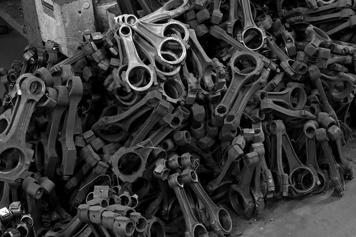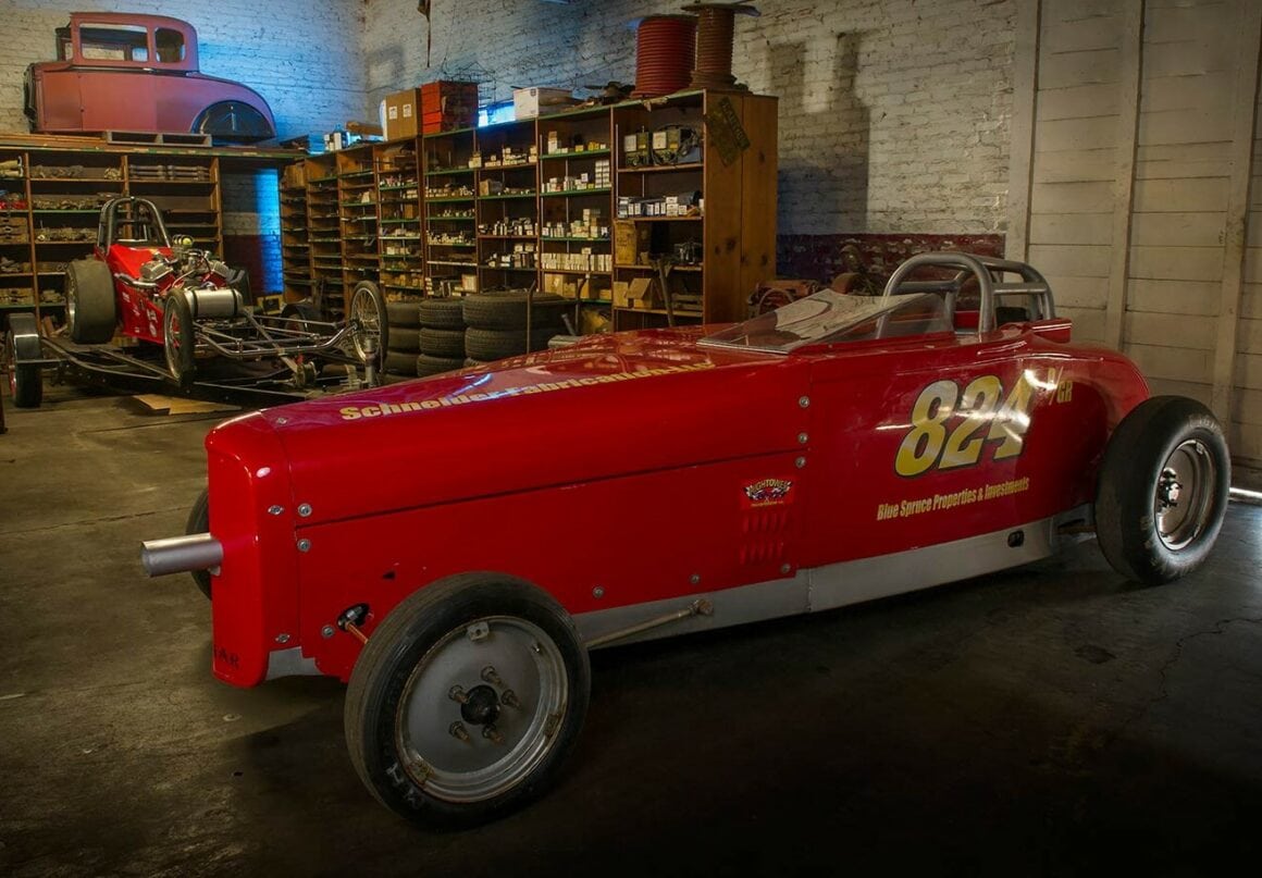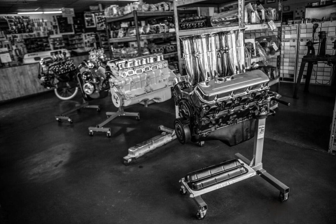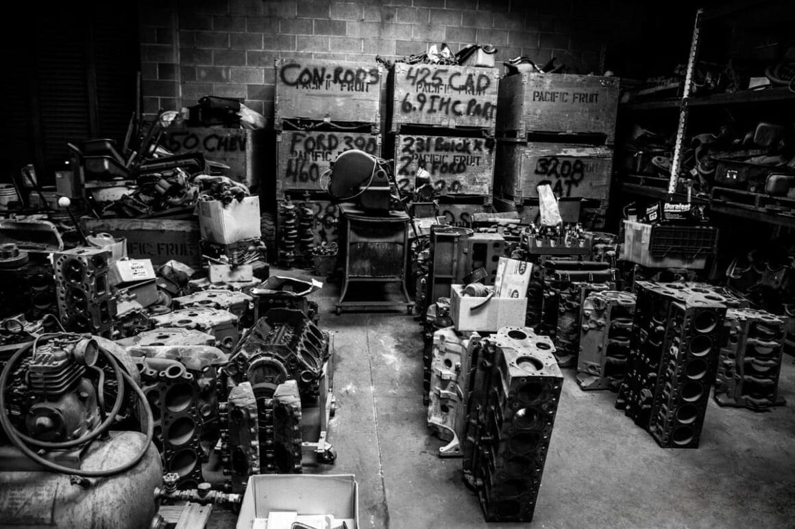 C’est un changement “old Era” par rapport aux ateliers ultra-modernes climatisés, quoique généralement les ateliers d’anciennes sont crades… Je ne sais si c’est volontaire pour accentuer le coté “vieilles bagnoles” qu’on y vien faire “retaper”... Sans doute car lorsqu’il s’agit de vraies restaurations, les ateliers sont “nickels étincelants, ultra-modernes et chers”… L’atelier d’usinage est l’endroit où Tim McMaster passe la majorité de son temps. Des décennies de collecte de blocs moteurs, de pistons, de bielles, etc… sont toutes stockées sur des étagères industrielles.