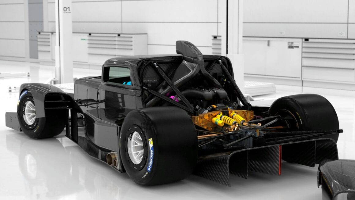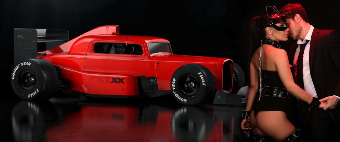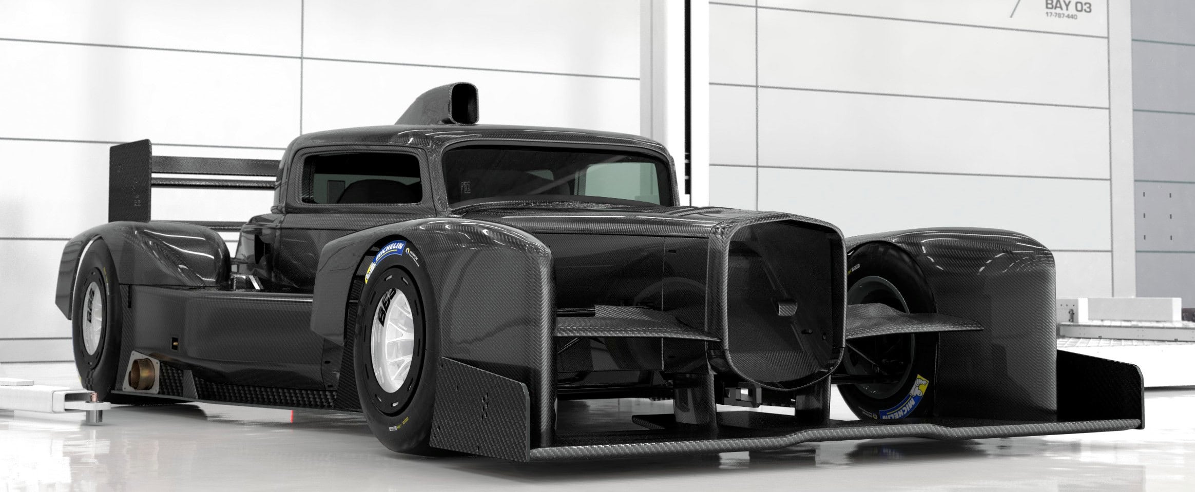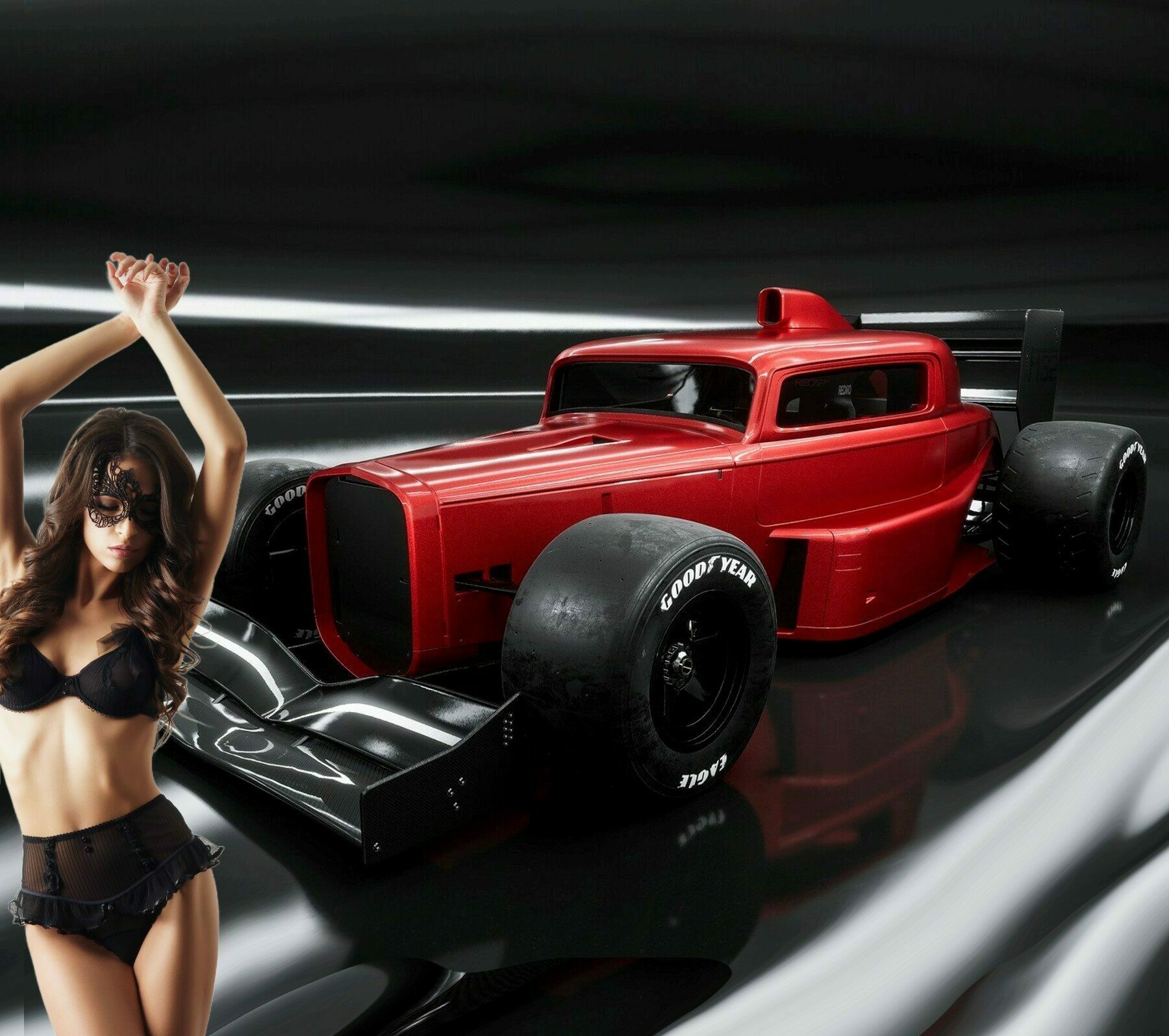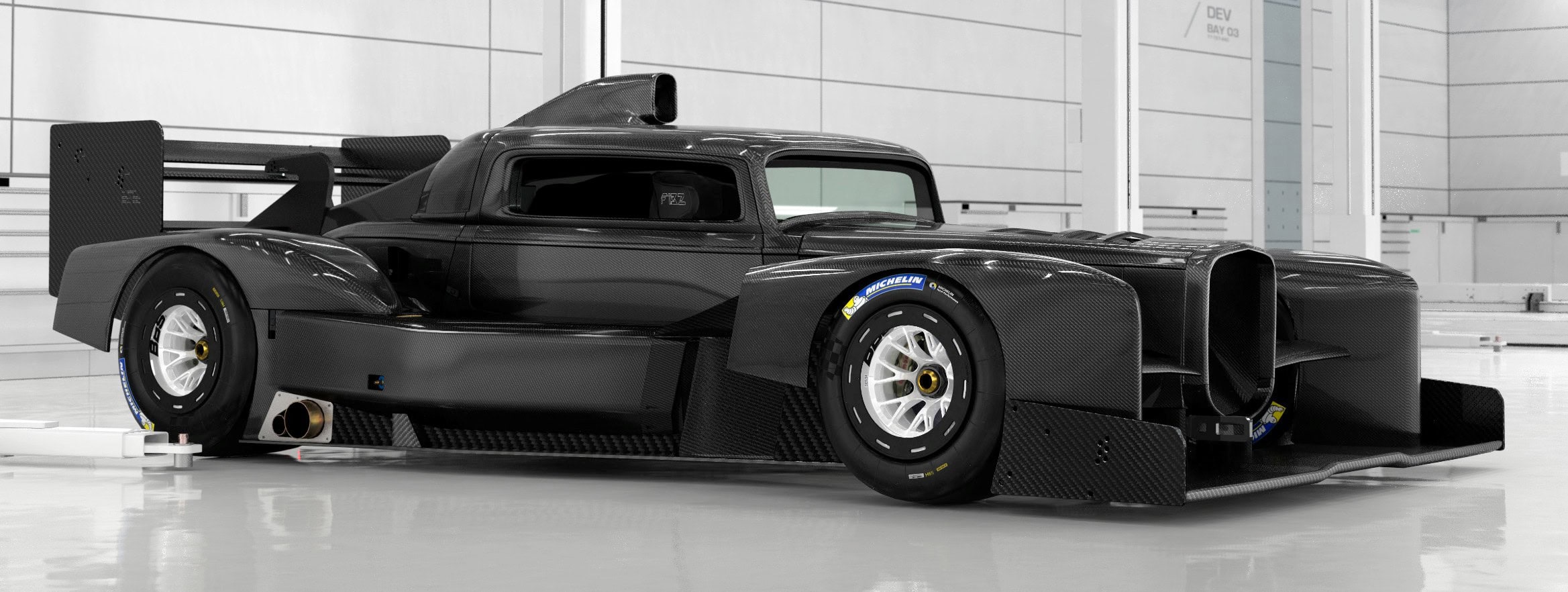 1980, le choc ! Dragsters au Mans avec Chromes&Flammes ! Du jamais vu ! 200.000 spectateurs payants ! Le départ d’une Saga ! Presqu’un demi siècle plus tard une idée surgit dans ma tête alors que je discute avec “Platon”, mon Robot “IA” qui m’assiste à améliorer ce Web-Site. Quoi donc ? Créer un Top Hot Rod au look comme s’il était destiné aux fameuses 24h du Mans 2026… L’imaginaire étant sans aucune limite, je m’inspire des deux Hot Rod’s avant-gardistes “Sbarro New Âge” et “Flying Brick Russian Street Rod” que j’ai publié, et qui disposent de carrosseries aérodynamiques “sauvages” pour les courses LMP, des machines totalement folles qui, en plus, s’attaquent en classe “Unlimited” à la course de côte internationale de Pikes Peak (USA). J’ai imaginé que ce serait un nouveau départ au bord de la fin (j’affiche 76 ans et je commence à le sentir aux articulations)… J’ai considéré que les deux mondes apparemment disparates des Hot Rod’s américains Vintage et des voitures de course modernes, devaient pouvoir bien fonctionner ensemble. De surcroit, il n’y a rien de mieux que le caractère sinistre du coupé Ford ’32 façon Hot Rod, surtout une fois qu’il a eu son toit surbaissé (Top Chop) pour créer cette fameuse esthétique de gangster emblématique. Ce projet oblige principalement à acquérir plus de compétences, quoique mon Robot “Platon” IA est au Top des connaissances…