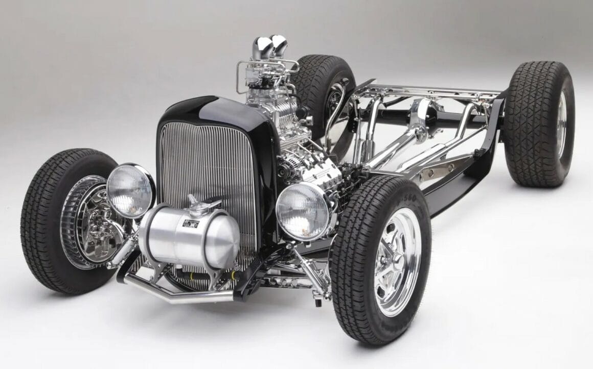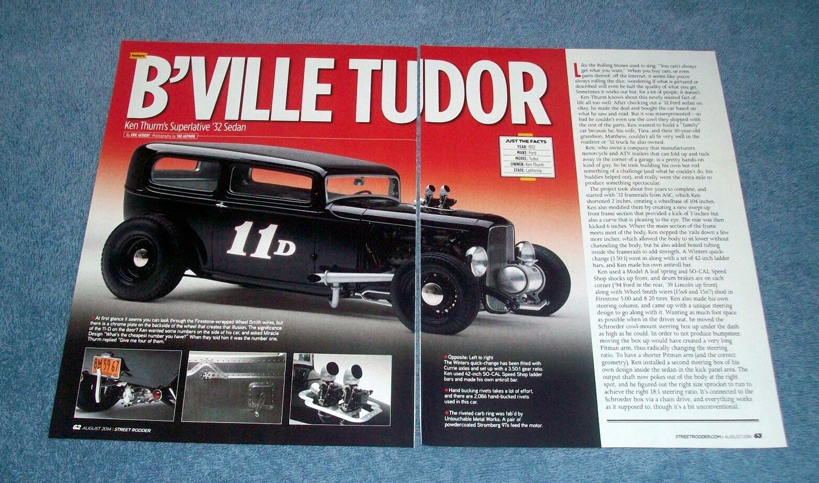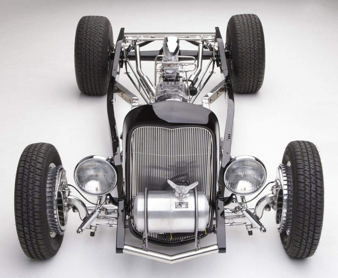 Le projet a duré environ cinq ans et a mal commencé avec un Hot-Rod qu’il a acheté chez Exclusive Impex à Fort Lauderdale pour compte d’un ami Français… Le Hot-Rod n’est jamais arrivé au Havre, dans le même style que la narration ci-avant… Sauf que Ken, habitant la Floride, informé par son ami Franchouillard, s’est rendu direct chez New-Roar avec une bande de Hot-Rodder’s survoltés et enragés. Ils ont déboulé avec des outils intimidants et ont chargé sur remorque le Hot-Rod qui aurait du être livré. Affaire conclue très cool avec un peu de baston pour payer le dérangement… L’affaire faite, Ken a prévenu son ami Français que le Hot_Rod était clinquant mais pas roulable, que cela nécessiterait des frais et des pièces introuvables en France, que donc l’idéal était de faire un deal entre eux sur 15.000 dollars, ce que le Français a accepté préférant cela à un deal de récupération à perte, tout heureux de ne pas avoir tout perdu… Et donc Ken a décidé de refaire le Hot-Rod dans les règles… Ken a d’abord utilisé un ressort à lames modèle A et des amortisseurs SO-CAL Speed Shop à l’avant, et des freins à tambour à chaque coin (Ford ’94 à l’arrière, Lincoln 1939 à l’avant) ainsi que des jantes fils Wheel Smith (15×4 et 15×7) chaussés de Firestone 5.00 et 8.20. Ken a également refabriqué sa propre colonne de direction et imaginé une conception de direction unique.