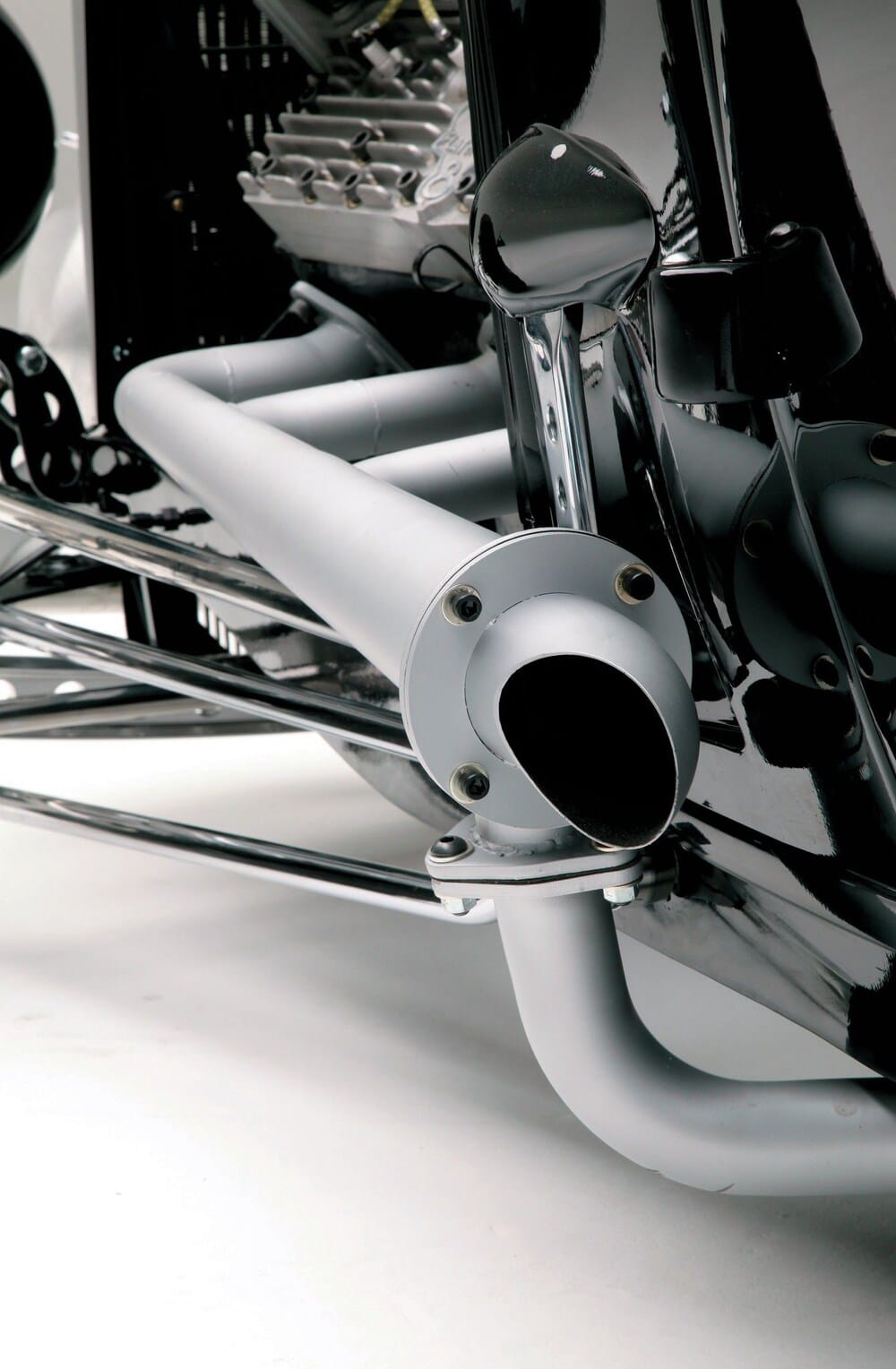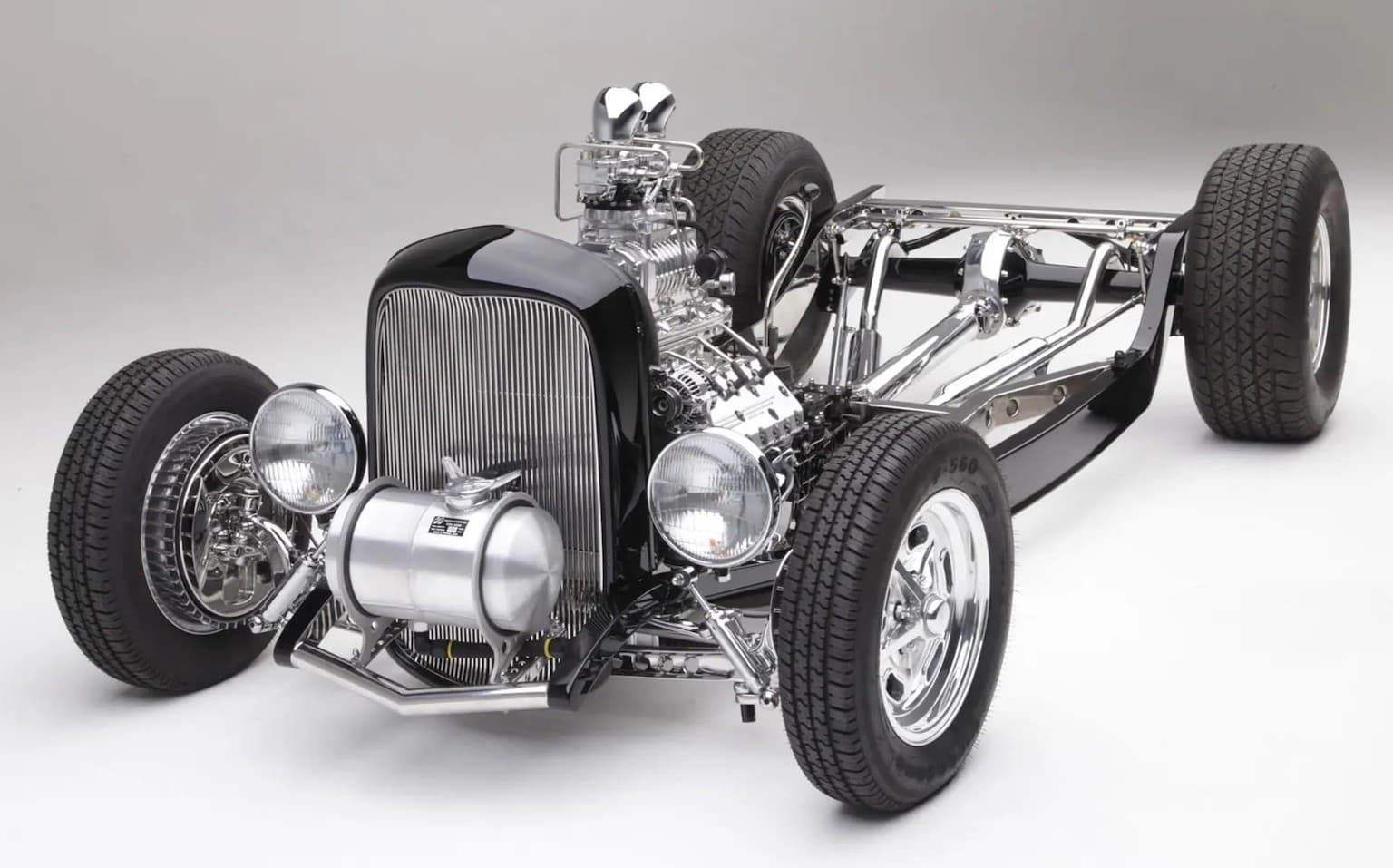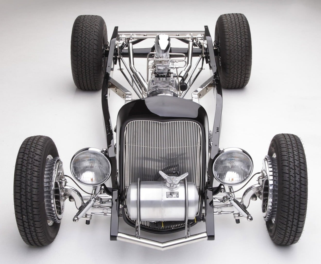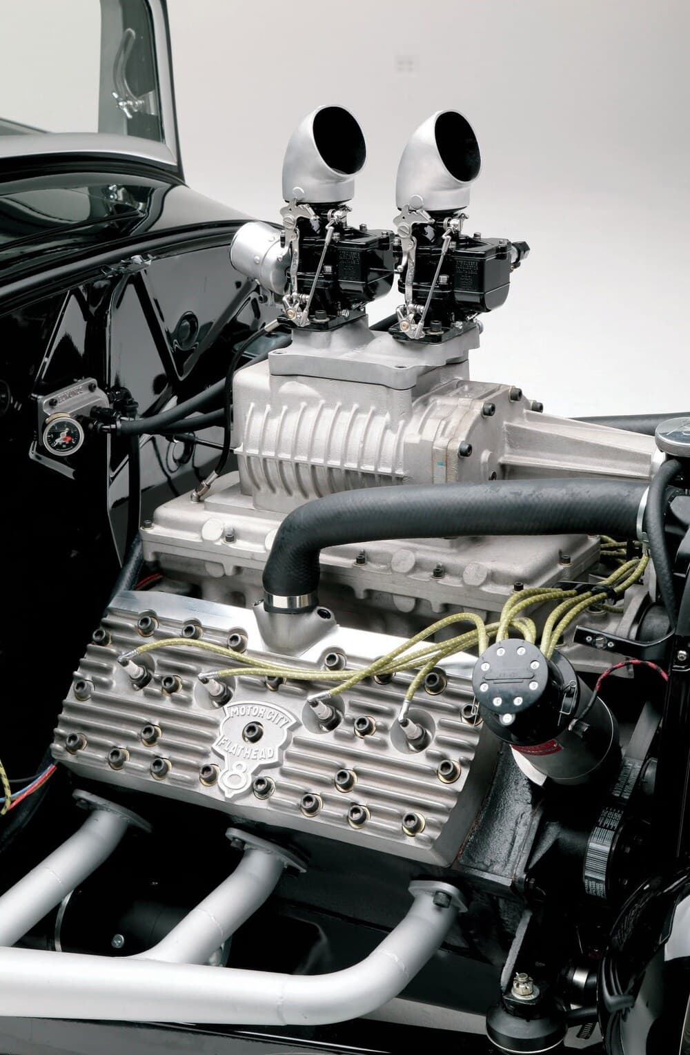 Au cours de la phase de maquette de la construction, Ken avait un V8 Flathead avec une paire de têtes Ardun boulonnées, mais il a changé d’idée et a opté pour un V8 286ci Flattie usinée par BEP Racing Engines. Ken a assemblé le moteur avec un vilebrequin SCAT, des pistons Ross, un arbre à cames Isky 400jr et a installé des pistons de chez Motor City Flatheads avec un taux de compression de 8: 1. Pour alimenter le V-8, Ken s’est tourné vers Tom Roberts Design à Ventura pour l’admission spéciale qu’ils ont compensée pour le Flathead. Amener “l’essence” est un chemin long et sinueux. Cela commence lorsque Ken ouvre le bouchon pour remplir le réservoir Moon situé à l’avant de la calandre. Derrière la calandre se trouve une pompe à carburant de 190 gph qui pousse l’essence vers un autre réservoir de 14 gallons à l’arrière de la voiture via une ligne (il y a aussi un interrupteur à bascule qui alimente la pompe située derrière la calandre). Lorsque la pompe à carburant est allumée, un solénoïde ferme le tube de ventilation du réservoir d’essence principal. Il y a aussi une ligne de retour qui remonte au réservoir. Et il y a une autre petite pompe à carburant qui alimente le moteur. . Sur le dessus du moteur, une paire de Stromberg 97 mélange l’essence et l’air, et une magnéto Vertex et des fils fournissent l’étincelle.
