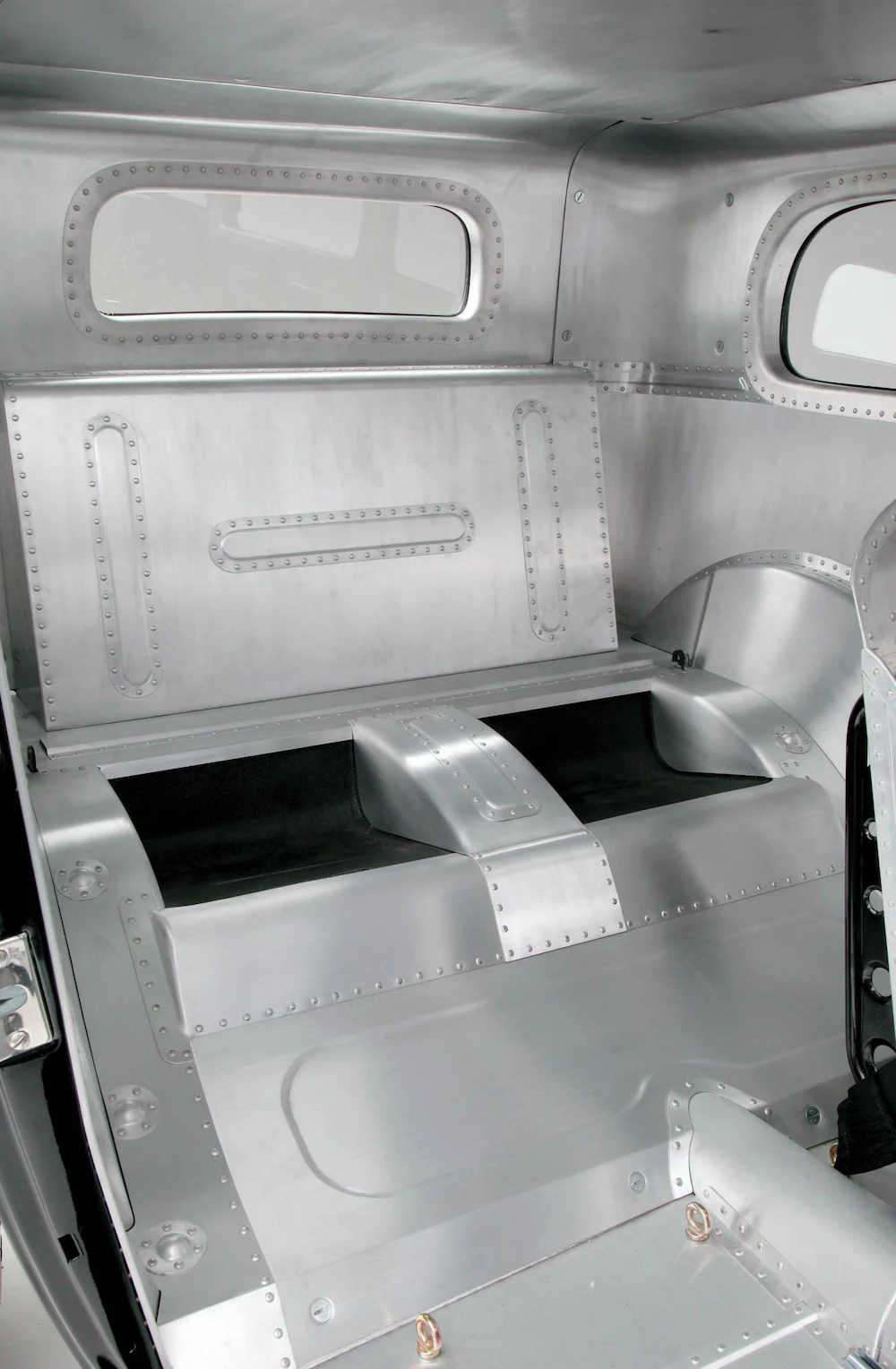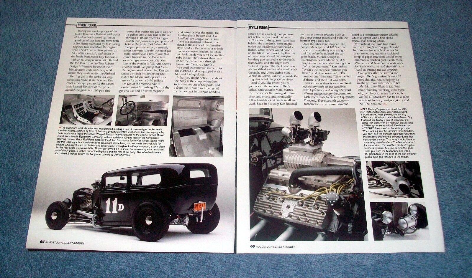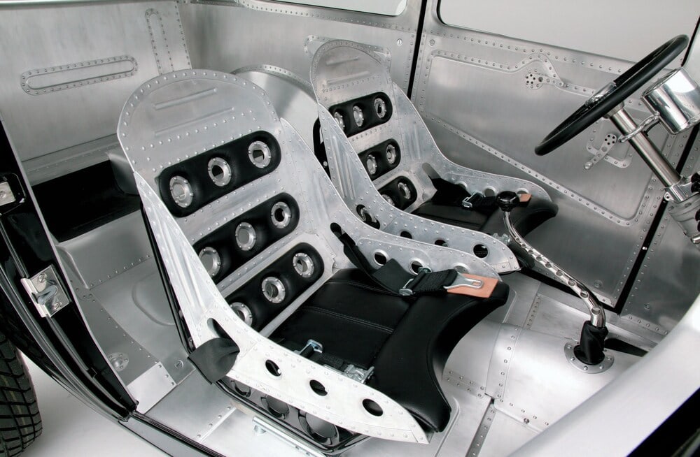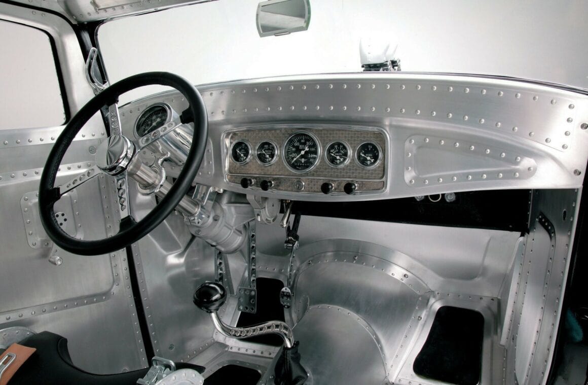 Untouchable Metal a refait l’intérieur pour Ken en utilisant des tôles d’aluminium et des rivets, et finalement 2.086 rivets “à la main” ont été utilisés. De retour dans son atelier, Ken a terminé les sections intérieures (telles que les pièces d’angle supérieures) et a également construit les sièges de type bombardier B17 Stratofortress. Une fois la fabrication arrêtée, Jeff Sherman s’est assuré que tout était droit et plat avant de repeindre le Hot-Rod en noir brillant. Miracle Design à Huntington Beach a ajouté le graphique “11-D” sur les portes qui n’a aucune signification autre que le montant total du cout de la re-transformation de 11.000 dollars. À l’intérieur de la voiture, il y a un travail minimal de rembourrage sur les sièges de Kiwi Upholstery, et les compteurs Stewart-Warner occupent l’insert de tableau de bord en aluminium fabriqué par Knecht Equipment Company. Il y a une sixième compteur – un tachymètre – dans une nacelle en aluminium boulonnée à la colonne de direction faite maison, qui est surmontée du volant Sprint à quatre branches. Tout au long de la construction, Ken a trouvé que l’usinage que Scott Longnecker avait fait pour lui était inestimable. Ken dessinait quelque chose sur une serviette de papier et Scott lui rapportait une pièce finie. Matthew aime plaisanter avec Ken et pense à s’éclater dans la folie de son grand-père… Il est déjà accro !