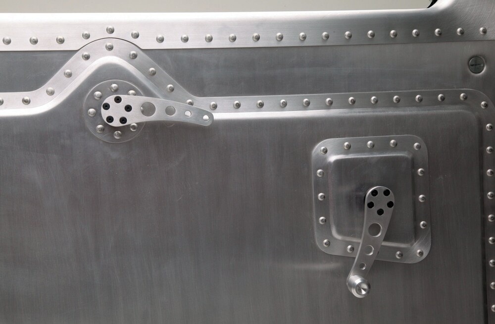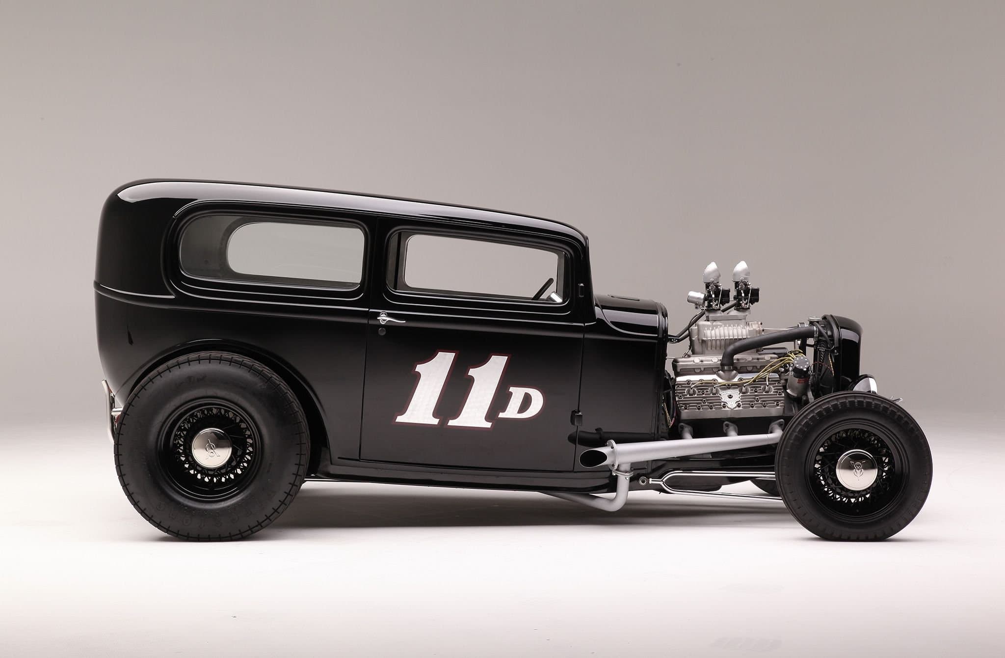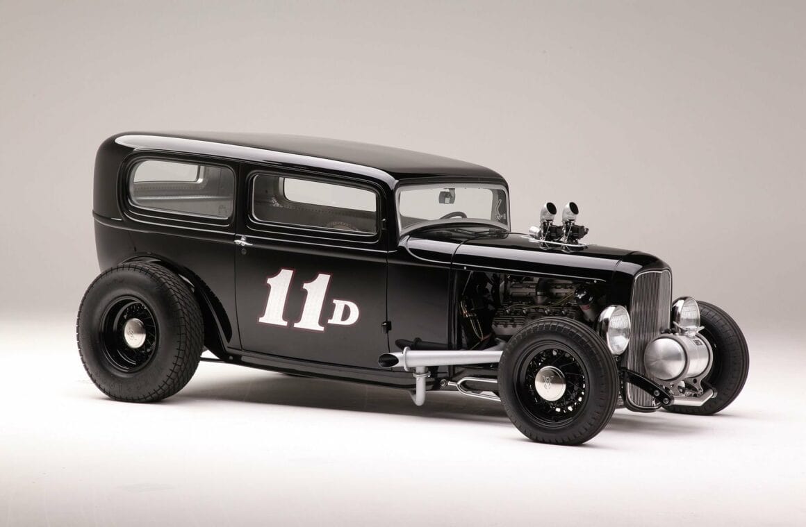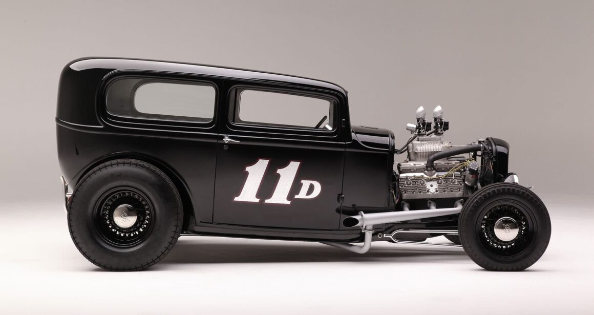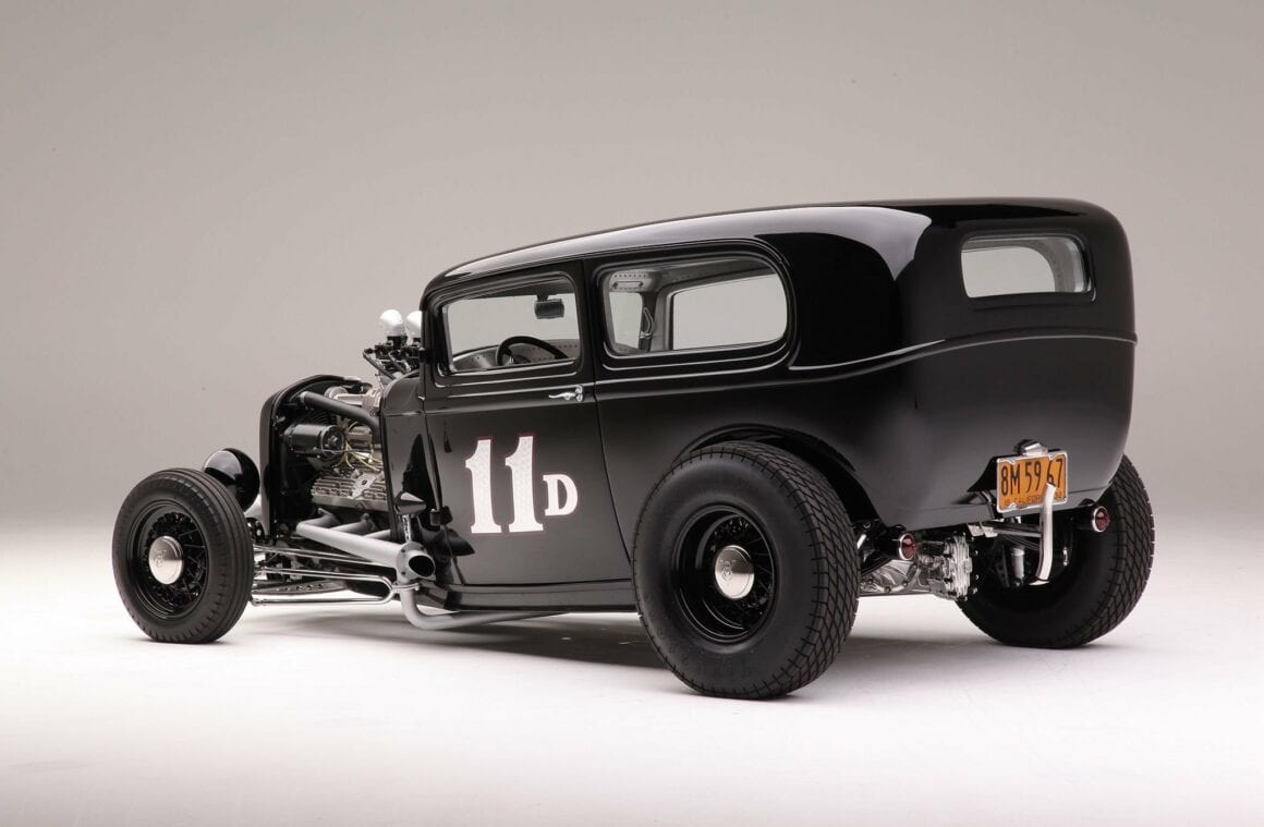 Untouchable Metal a refait l’intérieur pour Ken en utilisant des tôles d’aluminium et des rivets, et finalement 2.086 rivets “à la main” ont été utilisés. De retour dans son atelier, Ken a terminé les sections intérieures (telles que les pièces d’angle supérieures) et a également construit les sièges de type bombardier B17 Stratofortress. Une fois la fabrication arrêtée, Jeff Sherman s’est assuré que tout était droit et plat avant de repeindre le Hot-Rod en noir brillant. Miracle Design à Huntington Beach a ajouté le graphique “11-D” sur les portes qui n’a aucune signification autre que le montant total du cout de la re-transformation de 11.000 dollars. À l’intérieur de la voiture, il y a un travail minimal de rembourrage sur les sièges de Kiwi Upholstery, et les compteurs Stewart-Warner occupent l’insert de tableau de bord en aluminium fabriqué par Knecht Equipment Company. Il y a une sixième compteur – un tachymètre – dans une nacelle en aluminium boulonnée à la colonne de direction faite maison, qui est surmontée du volant Sprint à quatre branches. Tout au long de la construction, Ken a trouvé que l’usinage que Scott Longnecker avait fait pour lui était inestimable. Ken dessinait quelque chose sur une serviette de papier et Scott lui rapportait une pièce finie. Matthew aime plaisanter avec Ken et pense à s’éclater dans la folie de son grand-père… Il est déjà accro !
