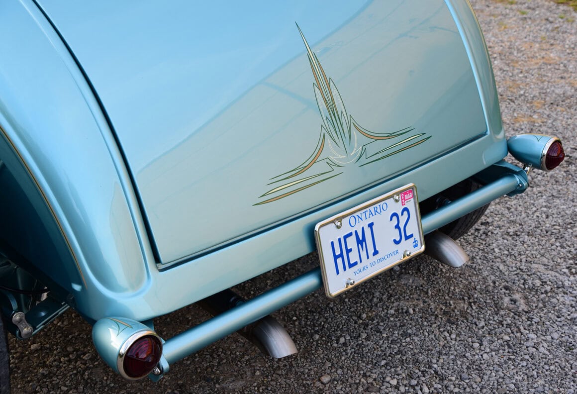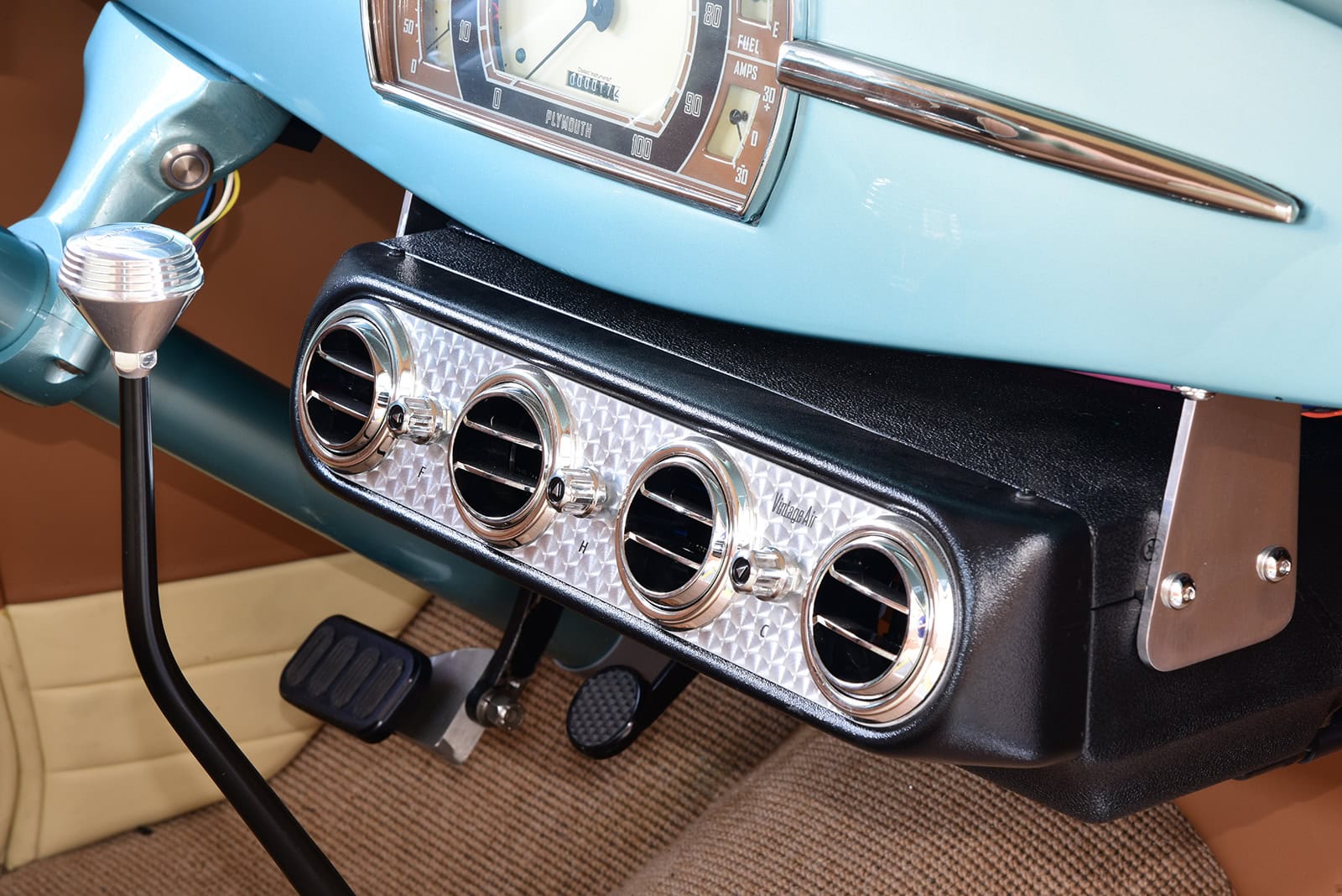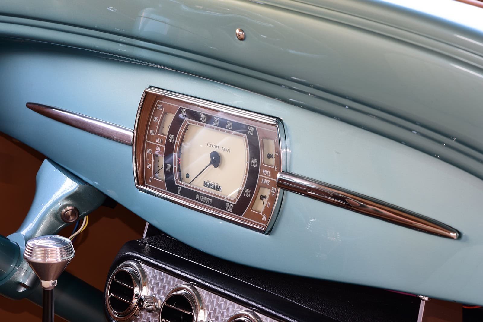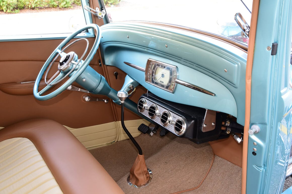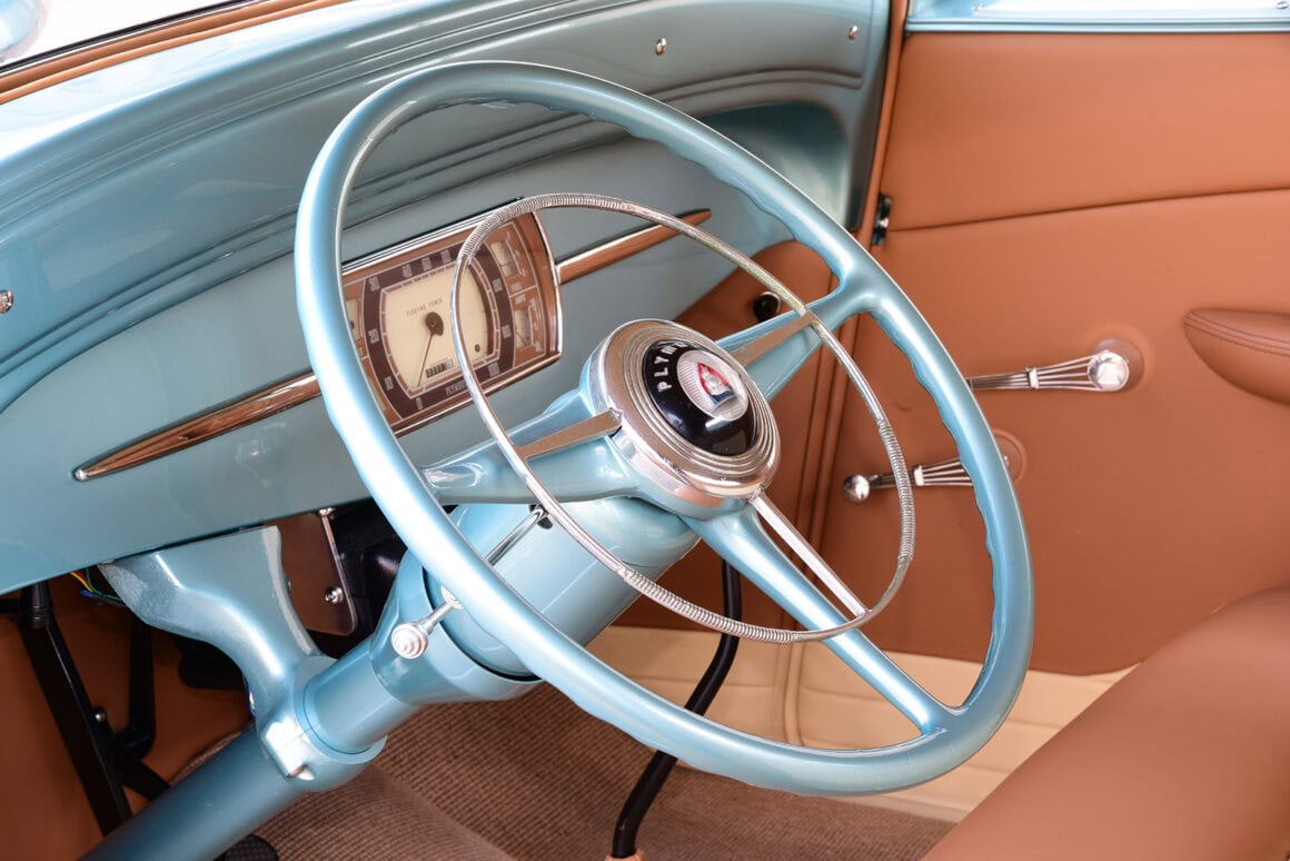 Quoi sont-ils ? Purée d’marde, z’en avo rien à faire. J’vous l’écrit quand même… Des Quick Fuel Q-Series 750-cfm couronnés d’une cuillère BDS. De pluche, avec l’état dégradé de la tôle de la Plymouth, il fallait un vrai maître carrossier pour tout ramener à la vie. Rob Allison de Pinhead Metal Craft à Elmira, Ontario, Canada, s’est attelé à la tâche… Bin dans son temps… Quand est v’nu le temps de donner au coupé une élégance subtile, la femme de Paul, Raquel, a choisi la teinte Ford Seafoam Green de PPG… Pour une allure qui corresponde au reste de la construction, le tableau de bord a été lissé et traité avec un tableau de bord Dodge’36 rafraîchi, converti en Plymouth par l’équipe de Classic Instruments pour surveiller les signes vitaux. Un volant Plymouth de 1946 restauré par Vintage Performance a été monté sur une colonne inclinable idididit pour tracer le parcours…
