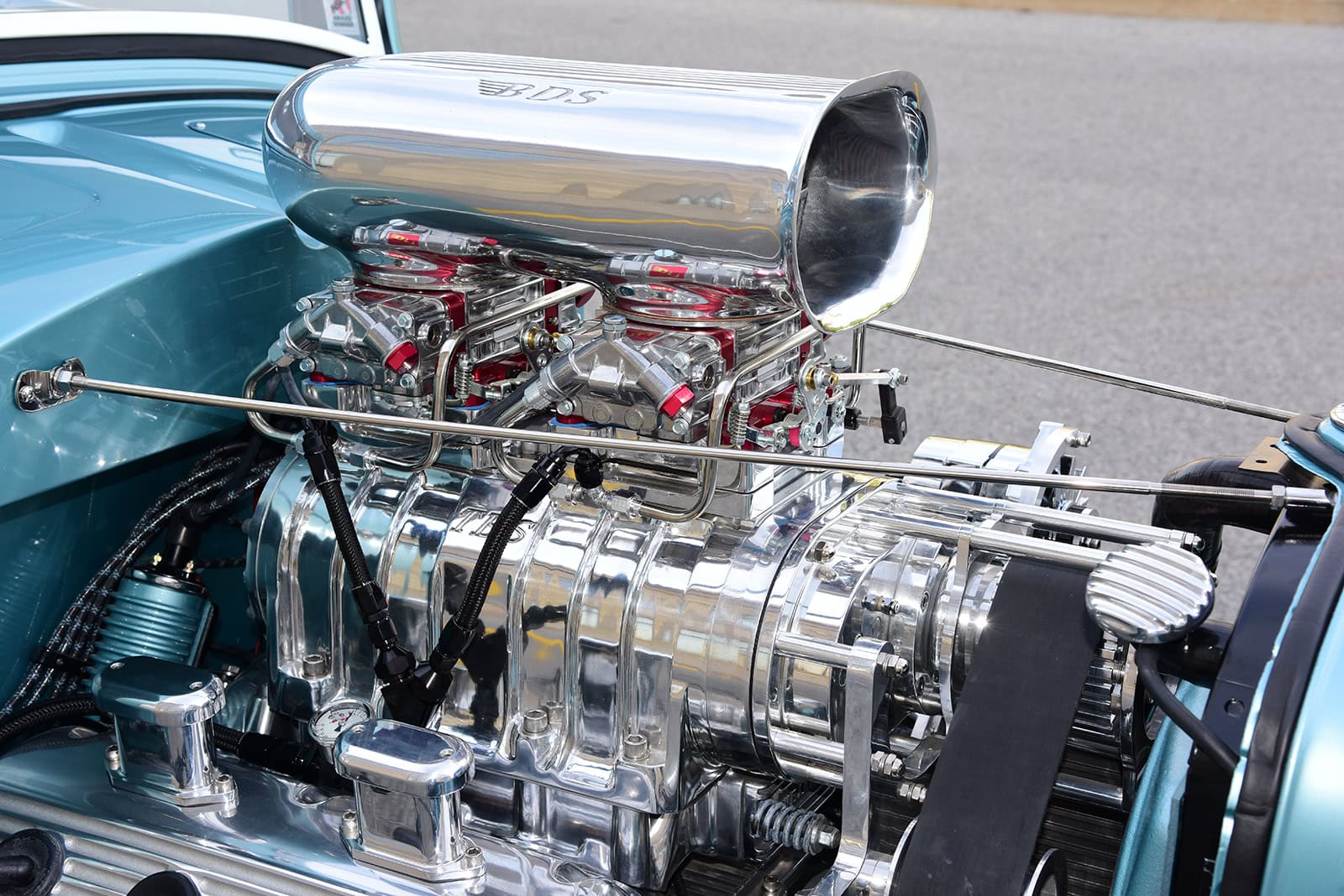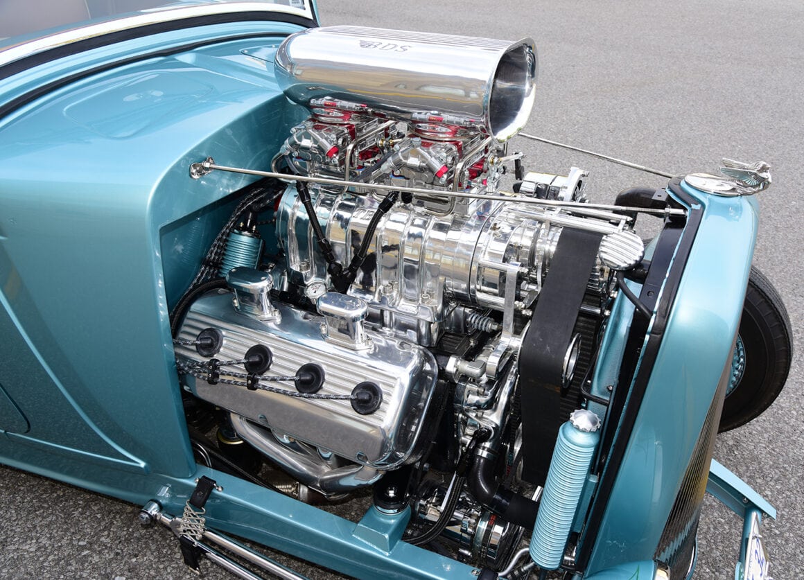 Y mettent aussi celles des putes rencontrées et baisées au rabais ainsi que les retranscriptions de notes avec les prix payés… C’est chiant… C’est pour en avoir des bibittes toute la journée… De l’autre coté de l’Atlantique, cela aide à obtenir des pubs et des putes au rabais, mais en franchouille, y a rien de semblable… L’utilité de ces descriptifs est d’avoir de la pub et des pièces gratuites en contrepartie, en Franchouille, y a rien de tel… J’ai donc décidé de passer ces lignes… et simplement survoler le moteur car ça vous fait baver… En l’occurrence c’est un V8 Hemi vintage 354ci acquit chez Big Al’s Toy Box de Gaylordsville, dans le Connecticut, qui avait été oublié dans la carcasse abandonnée d’une Dodge Hemi 1956 cracheuse de feu. Un bloc 354ci a été massé à la perfection un coït s’est déroulé avec une admission Weiand portant un compresseur 6-71 aidant à la respiration profonde d’une paire de carbus…