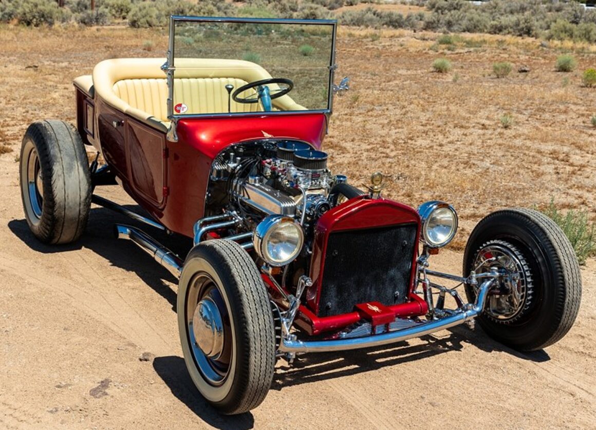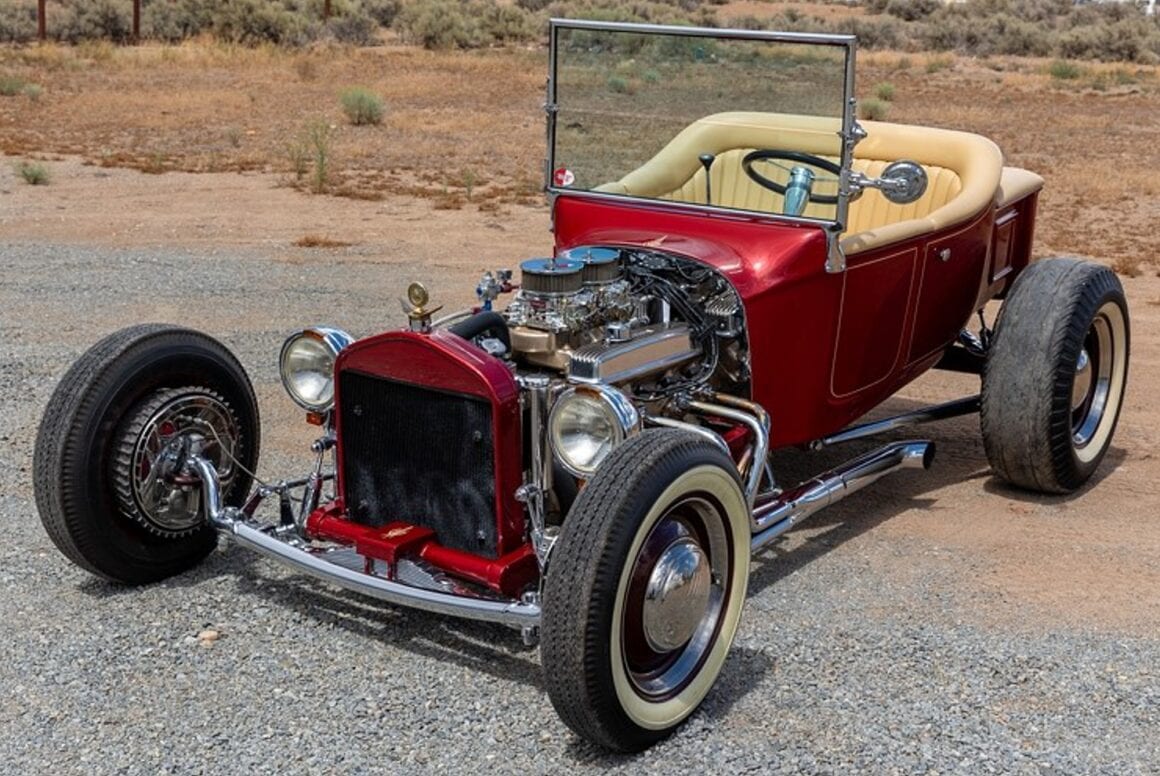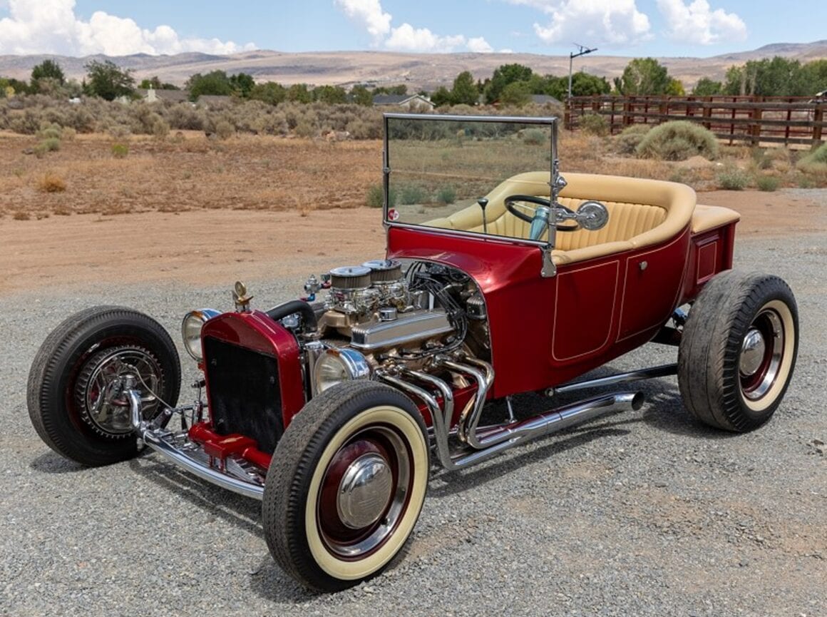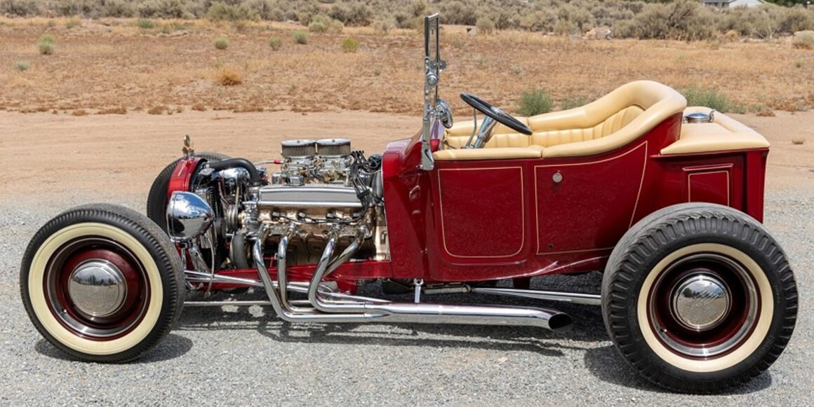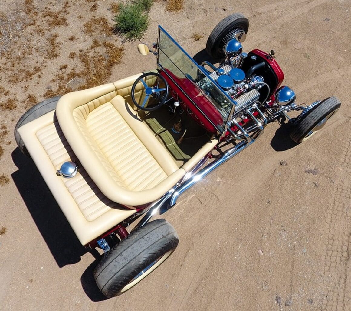 Cette Ford est un roadster T-Bucket construit à partir de zéro qui a été inspiré par une construction achevée par le père du vendeur lorsqu’il était au lycée. La carrosserie en fibre de verre est montée sur un châssis en caisson de 3×2po sur mesure, et le Hot Rod roule sur une suspension personnalisée avec une extrémité avant suicide, un essieu abaissé Magnum de 4po, des tiges de rayon Total Performance, un ressort avant SuperSlide et un ressort Posies Model A à l’arrière. Les roues décalées de 16po Vintiques sont montées sur des freins Wilwood à tambour Buick à l’avant et des tambours Lincoln à l’arrière.
