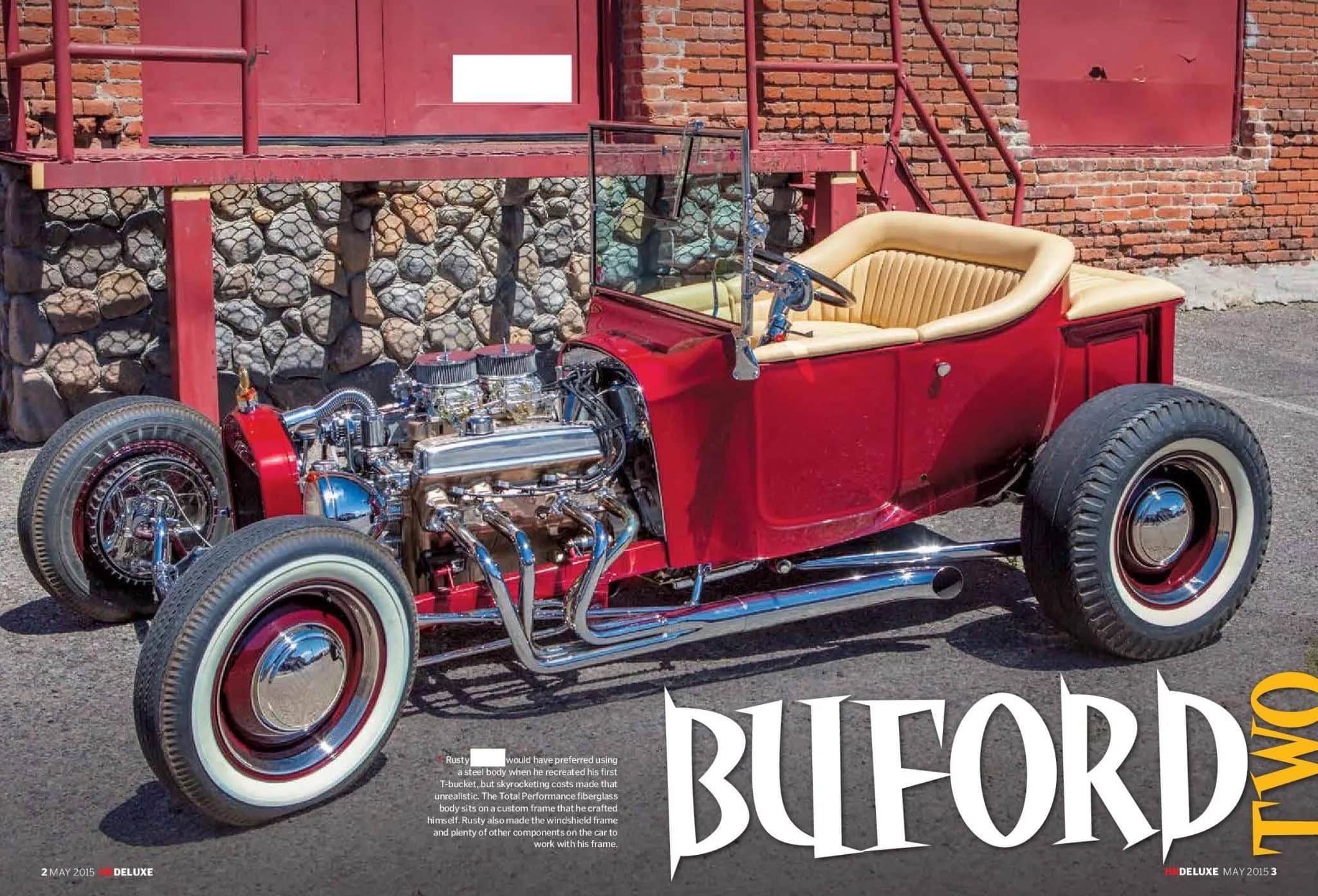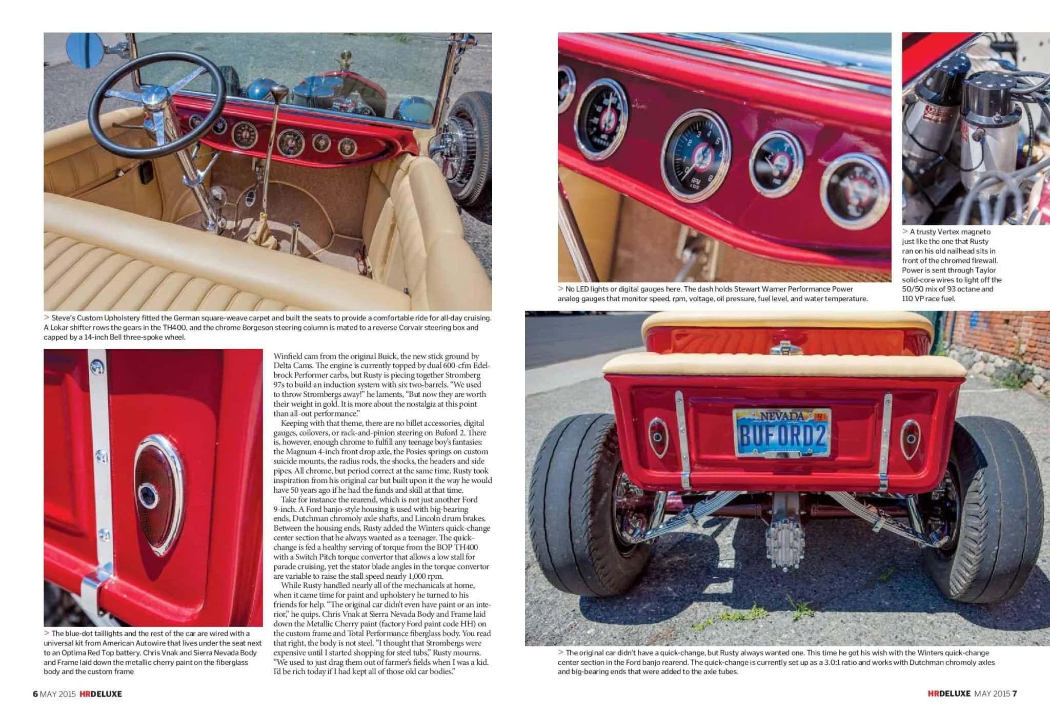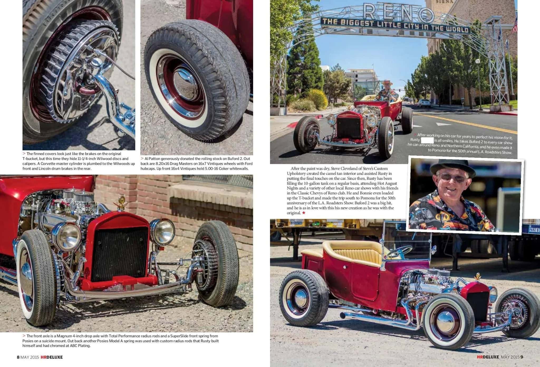 Des décennies plus tard, l’amour de Rusty pour les Hot Rods a été ravivé lors d’une visite à Hot August Nights après sa retraite à Reno. Soudeur “à la main”, il s’est rendu à son atelier et a commencé à recréer son T’Bucket Ford à moteur Buick V8. Il a trouvé un moteur utilisable dans les montagnes de Sierraville, en Californie, et l’arrière d’un banjo Ford près de Bend, dans l’Oregon. Ces pièces ont été utilisées dans le châssis qu’il a construit sur mesure à partir de tubes en caisson 2×3 pour créer Buford 2. Le nom “tête de clou” a été donné aux moteurs BuickV8 en raison des petites soupapes verticales dans les têtes.