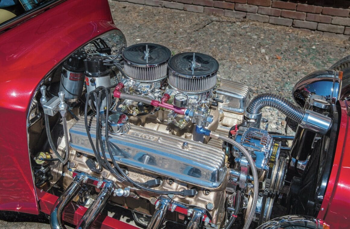 Il s’est tourné vers ses amis pour obtenir de l’aide. “La voiture d’origine n’avait même pas de peinture ni d’intérieur”, plaisante-t-il. Chris Vnak de Sierra Nevada Body and Frame a posé la peinture Metallic Cherry (code de peinture Ford HH) sur le châssis personnalisé et la carrosserie en fibre de verre Total Performance. “Je pensais que les Stromberg étaient chers jusqu’à ce que je commence à acheter des baignoires en acier”, se lamente Rusty. “Quand j’étais enfant, nous les traînions hors des champs des agriculteurs. Je serais riche aujourd’hui si j’avais gardé toutes ces vieilles carrosseries de voitures”.