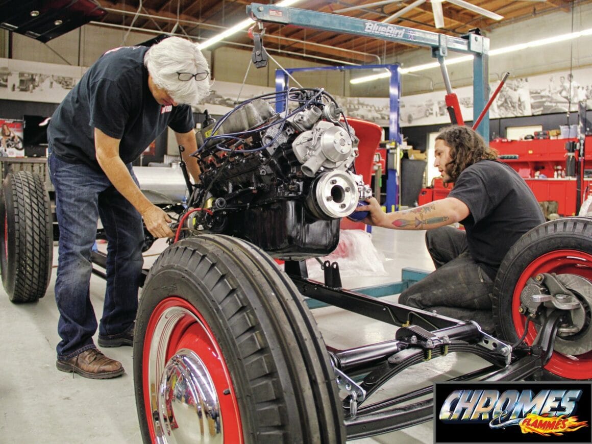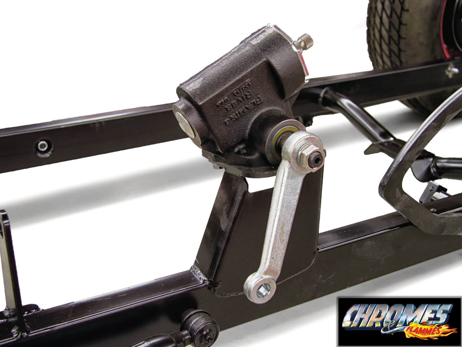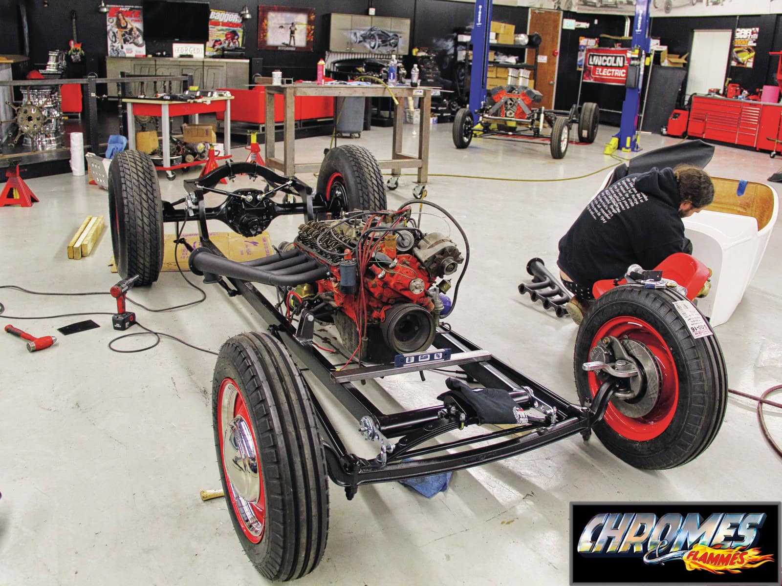 Pendant que la carrosserie est en peinture, il faut préparer le châssis. La suspension avant utilise un ressort à lames transversal comme sur une Ford ancienne, mais monté dans un style suicide (devant la traverse plutôt qu’en dessous, et avec le ressort derrière l’essieu), ainsi qu’un essieu à poutre en I de 4 pouces abaissé avec des triangles. Le support de ressort est monté sur le châssis Speedway, tout comme les supports de direction et de pédale de frein et le coussin pour le boîtier de direction inversé de la Corvair (la norme pour les T depuis que les Corvair’s).