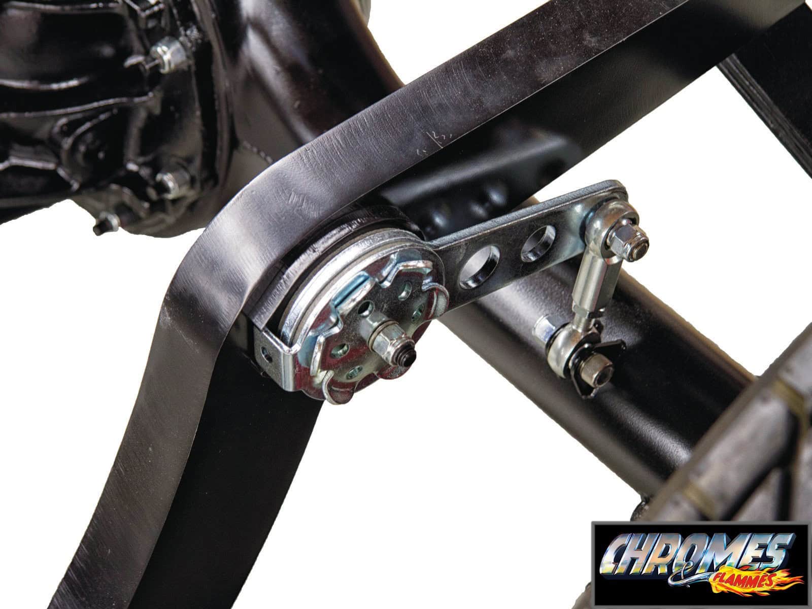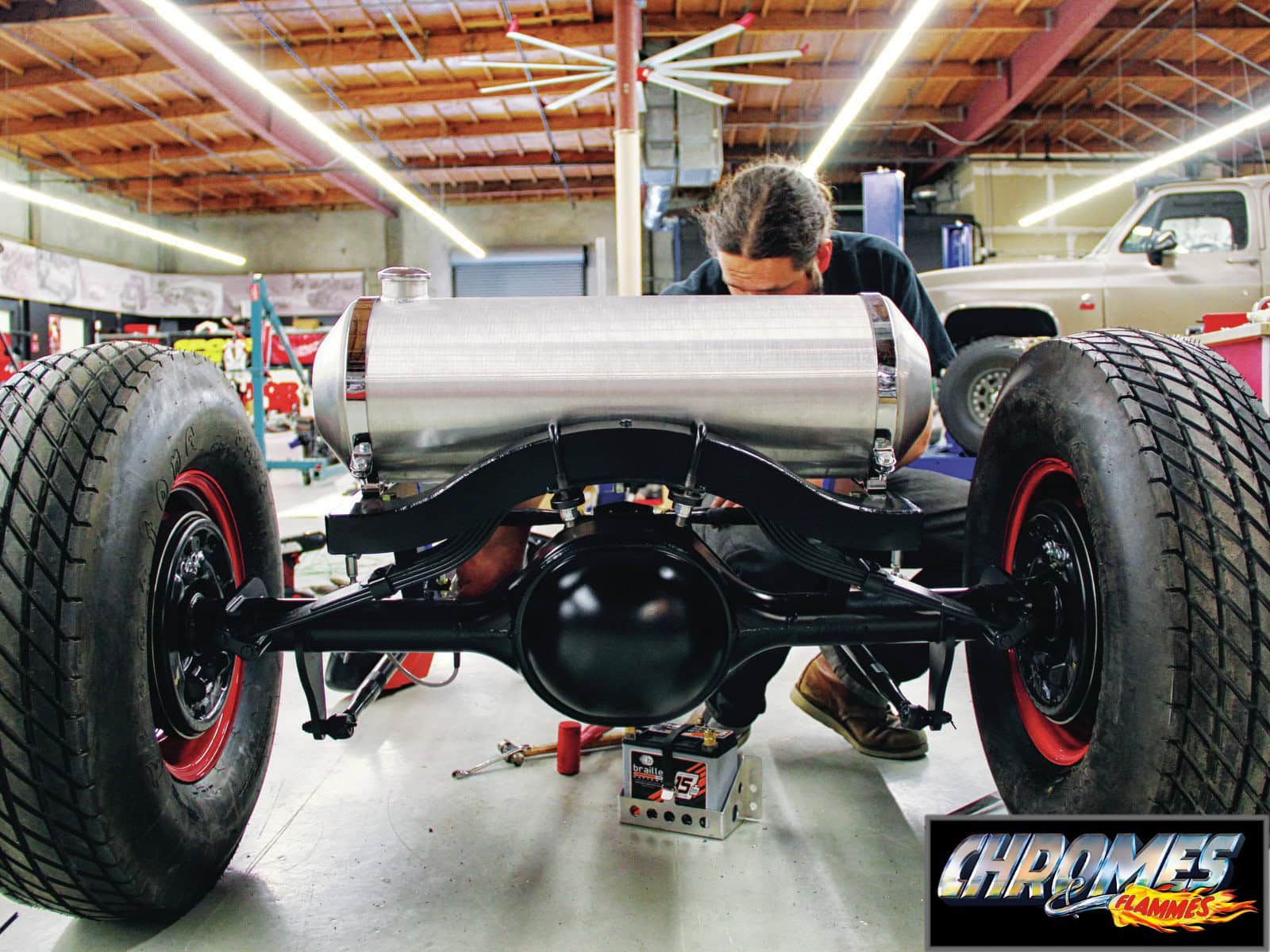 L’essieu avant abaissé Magnum de 4 pouces, les ressorts Posies sur des supports suicides personnalisés, les tiges de rayon, les amortisseurs, les collecteurs et les tuyaux latéraux, tout est chromé, mais correct en même temps. Rusty a construit son Rod comme il l’aurait fait il y a 50 ans s’il avait eu les fonds et les compétences nécessaires à l’époque. Prenez par exemple l’arrière, qui n’est pas simplement celui d’une autre Ford 9po, car un boîtier de style banjo Ford est utilisé avec de grandes extrémités de roulement avec des arbres d’essieu en chromoly Dutchman et des freins à tambour Lincoln.