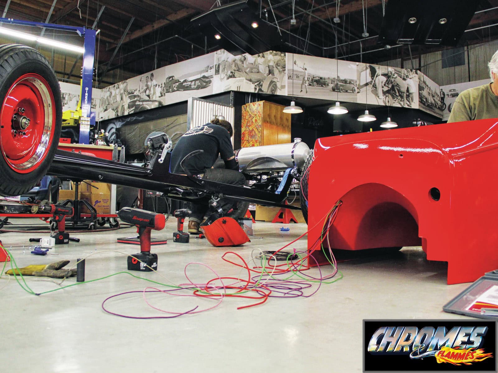 N’est-ce pas là l’essence même du Hot Rodding ? Tout un Hot Rod peut être monté en trois jours, et bien qu’il se soit passé beaucoup de choses au cours de ces 72 heures, il a faudra encore trois semaines de bricolage ici et là pour le terminer. Dans le but de rester à l’écart les uns des autres pour ne pas perdre leur temps en papotages, chaque membre du personnel à en charge une partie différente de la construction d’un Hot Rod qui représente fondamentalement le même job à effectuer pour n’importe quelle taille voulue… Ils expliquent aux clients qu’il leur faudra d’abord poncer et peindre des pièces…