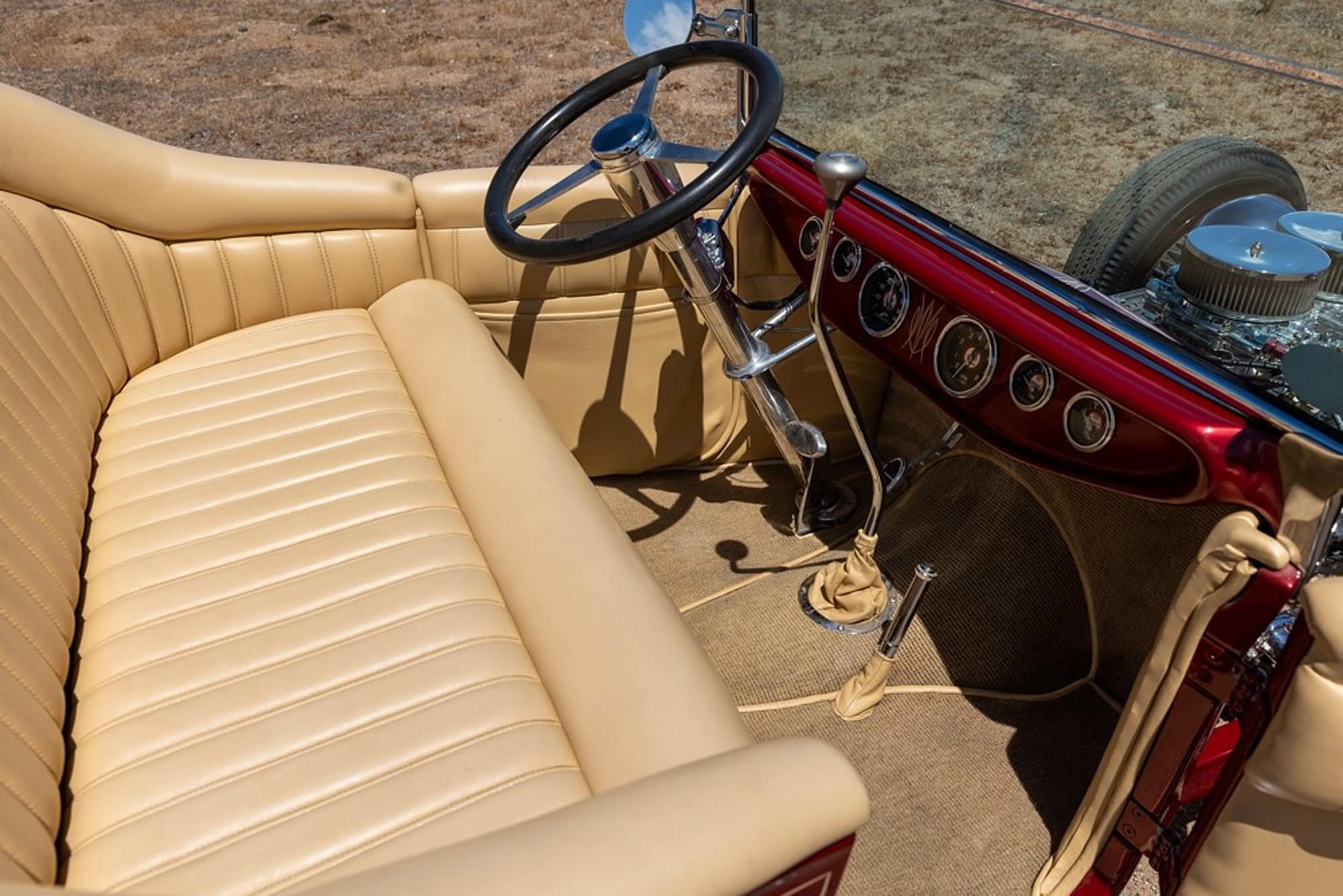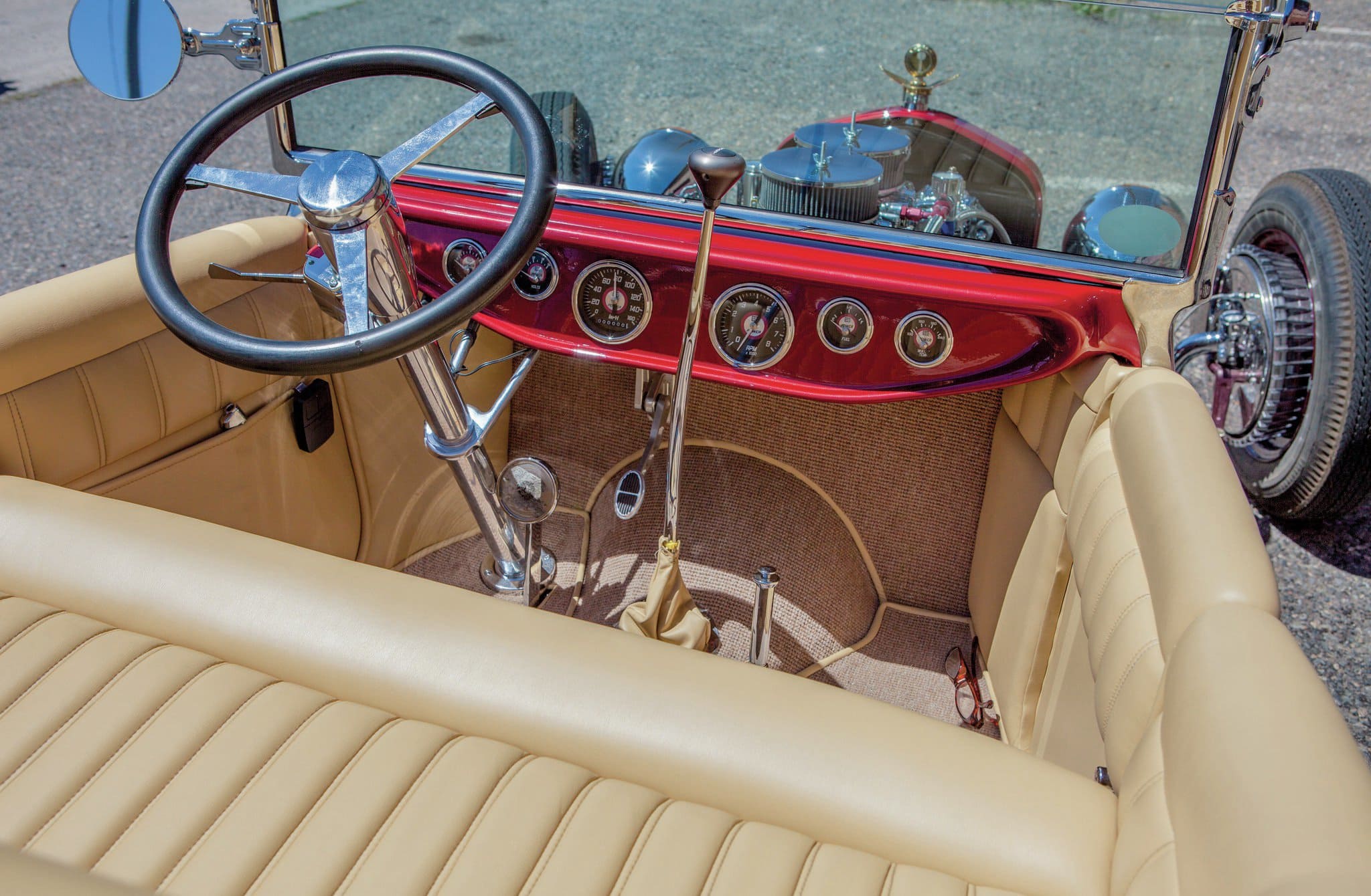Bien que les soupapes puissent être aussi petites qu’un clou de 10 sous, ces moteurs ont la réputation de produire un couple de torréfaction des pneus, et la voiture de Rusty est à la hauteur de cette réputation. Il a nettoyé le vilebrequin et les tiges forgées d’origine et a utilisé des roulements Clevite, des fixations ARP et des pistons forgés Ross de plus de 0,030 qui génèrent un taux de compression de 10,5:1 avec des culasses d’usine à orifice. Une magnéto Vertex est exactement comme dans le Bucket’T d’origine, et au plus profond du bloc 441ci perforé se trouve une copie de la came Winfield de la Buick d’origine.