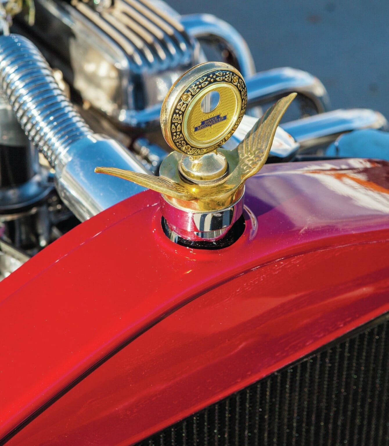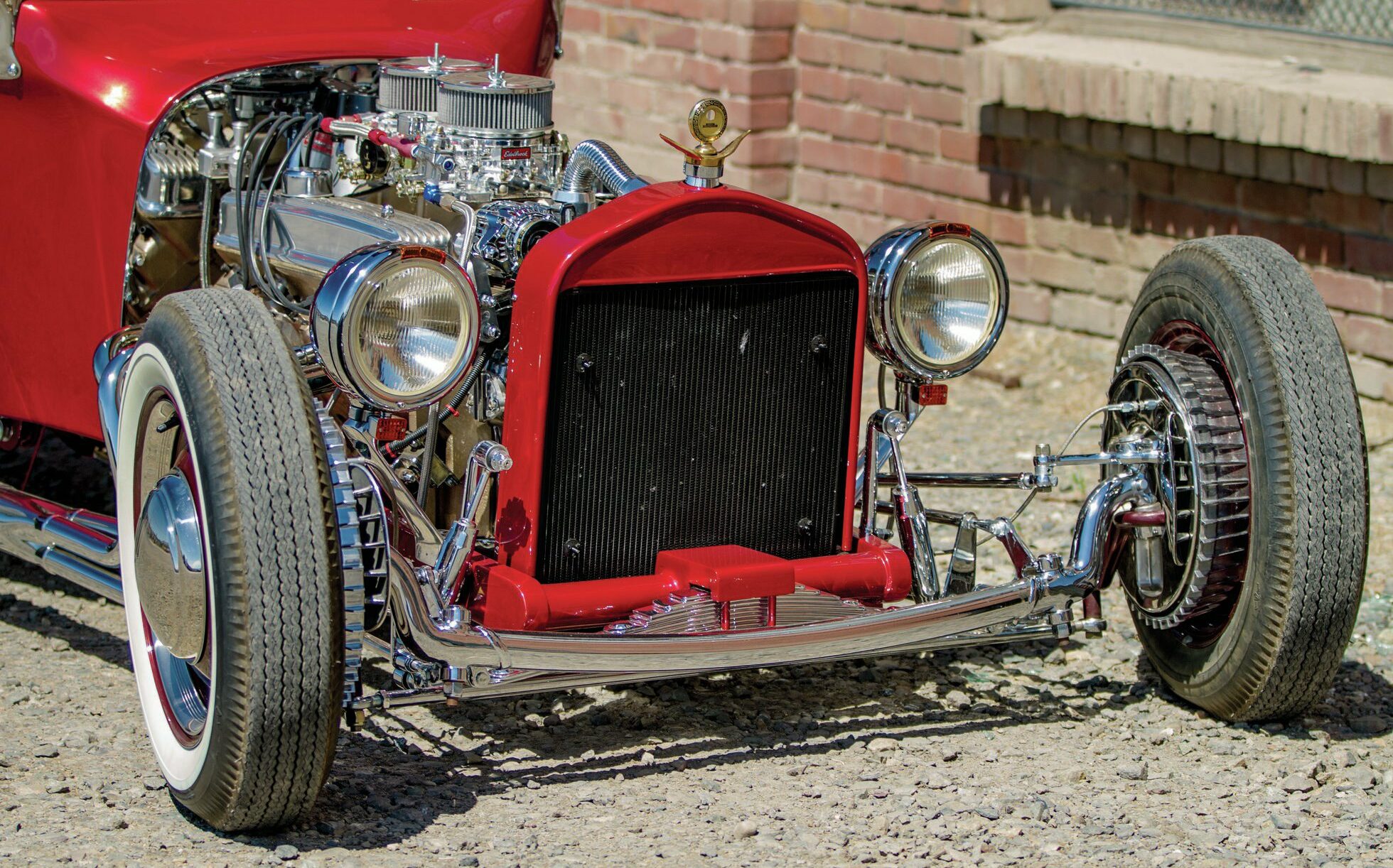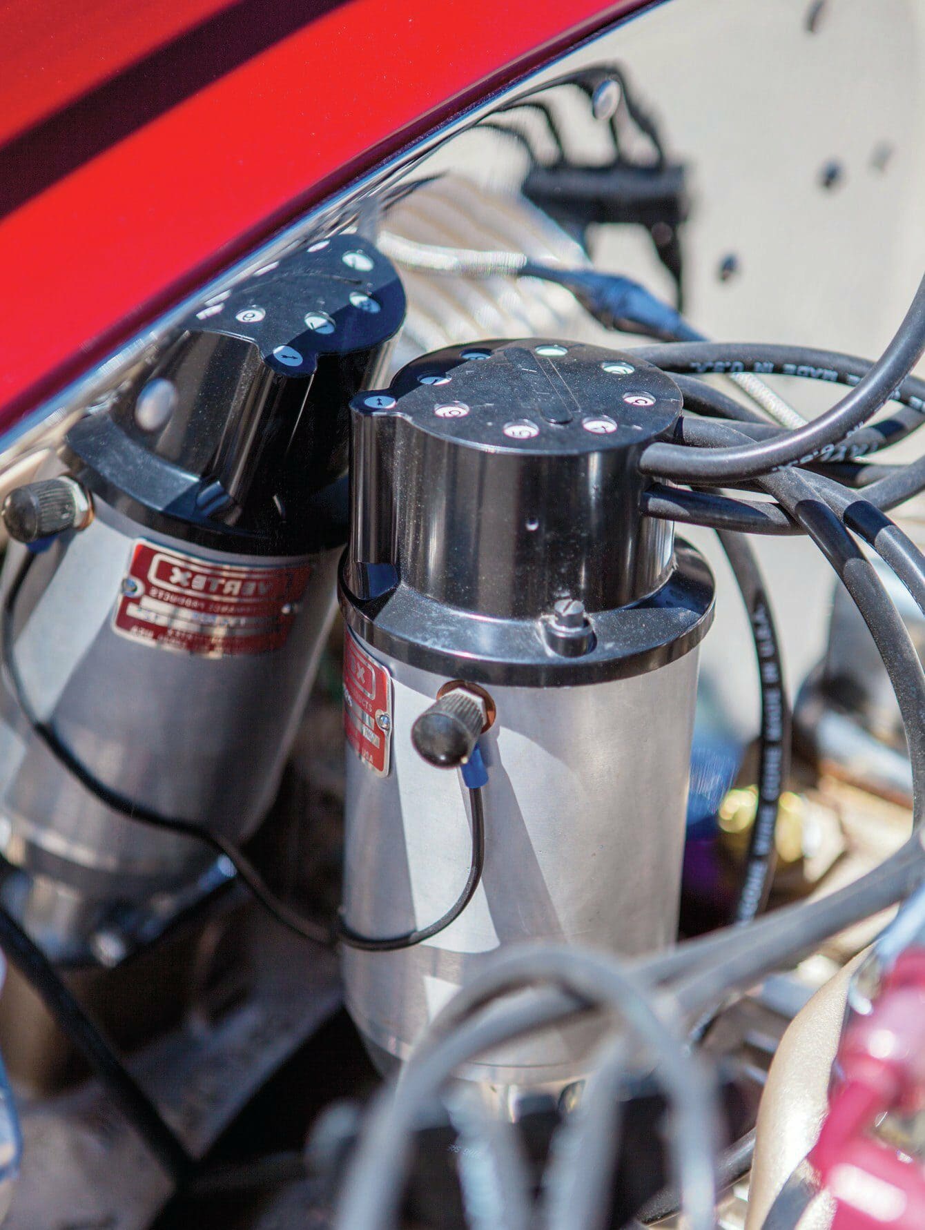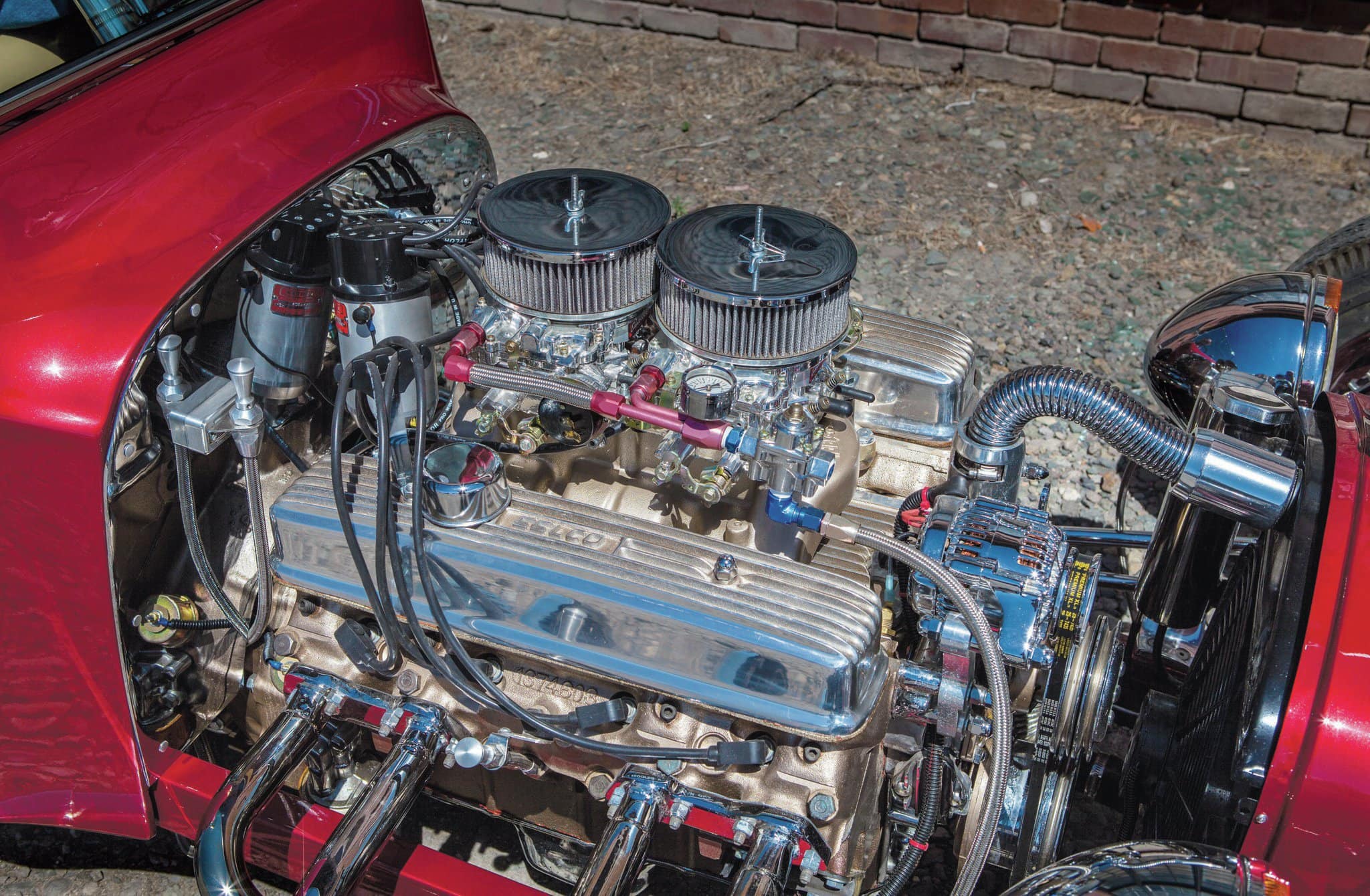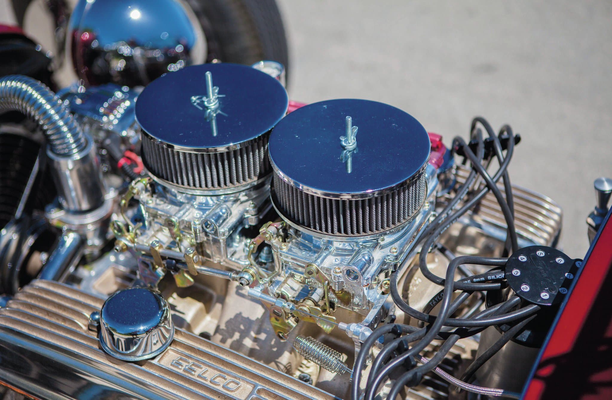 Il s’est tourné vers ses amis pour obtenir de l’aide. “La voiture d’origine n’avait même pas de peinture ni d’intérieur”, plaisante-t-il. Chris Vnak de Sierra Nevada Body and Frame a posé la peinture Metallic Cherry (code de peinture Ford HH) sur le châssis personnalisé et la carrosserie en fibre de verre Total Performance. “Je pensais que les Stromberg étaient chers jusqu’à ce que je commence à acheter des baignoires en acier”, se lamente Rusty. “Quand j’étais enfant, nous les traînions hors des champs des agriculteurs. Je serais riche aujourd’hui si j’avais gardé toutes ces vieilles carrosseries de voitures”.