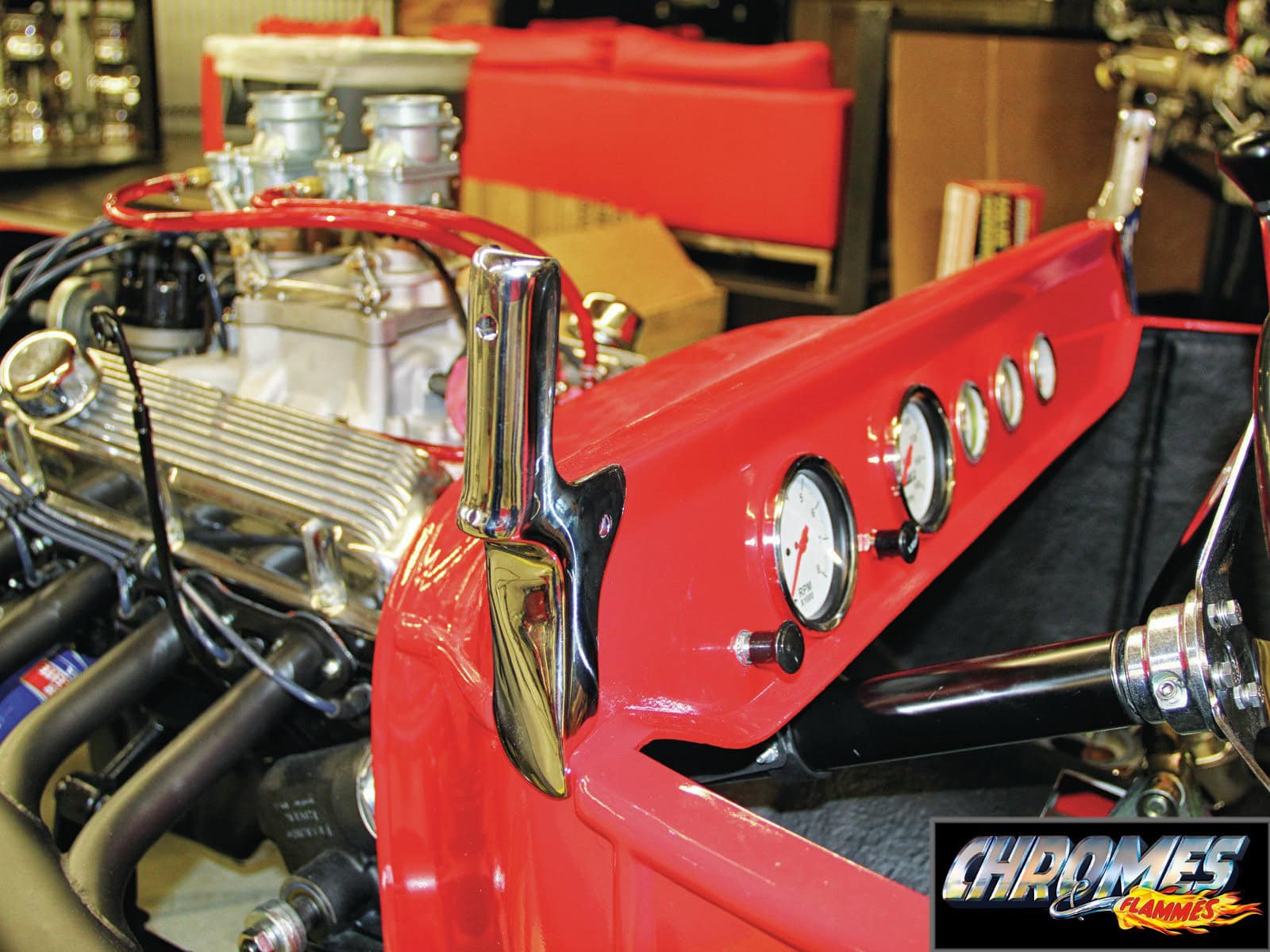 Le moteur est actuellement surmonté de deux carburateurs Edelbrock Performer de 600 cfm, mais Rusty assemble des Stromberg 97 pour construire un système d’admission avec six double canons. “Avant, nous jetions les Stromberg !”, se lamente-t-il, “mais aujourd’hui, ils valent leur pesant d’or. C’est plus une question de nostalgie à ce stade-ci que de performance totale”... Pour rester dans ce thème, il n’y a pas d’accessoires de billettes, de compteurs numériques, de combinés filetés ou de direction à crémaillère sur son Buford 2. Il y a cependant assez de chrome pour satisfaire les fantasmes de n’importe quel adolescent.
