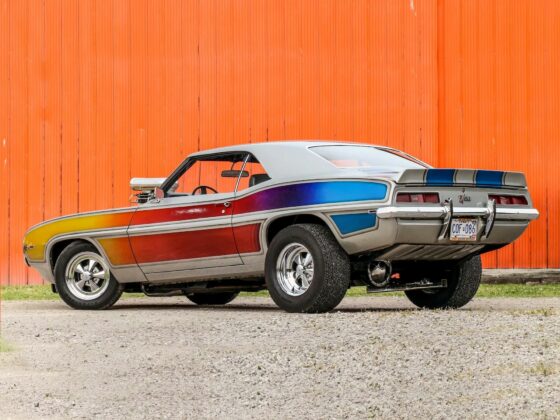 Le moteur V8 383ci Stroker Sbc à l’appui inconditionnel d’une boite automatique th350 trans, tous deux construits par Ron Grose Racing avec un Blower Littlefield 6-71 et une injection quadruple Fitech. La suspension AR à 4 bras dispose d’un Airlift. Il n’y a pas de silencieux (ce n’est que du plaisir de créer un vacarme hallucinant). Les collecteurs sont en acier inoxydable réalisés sur mesure.