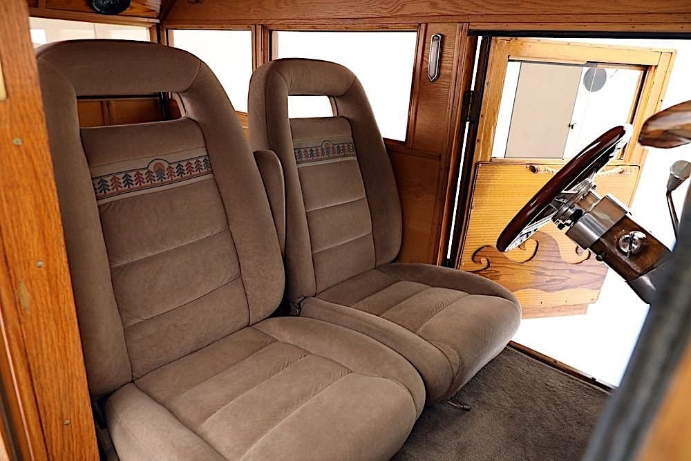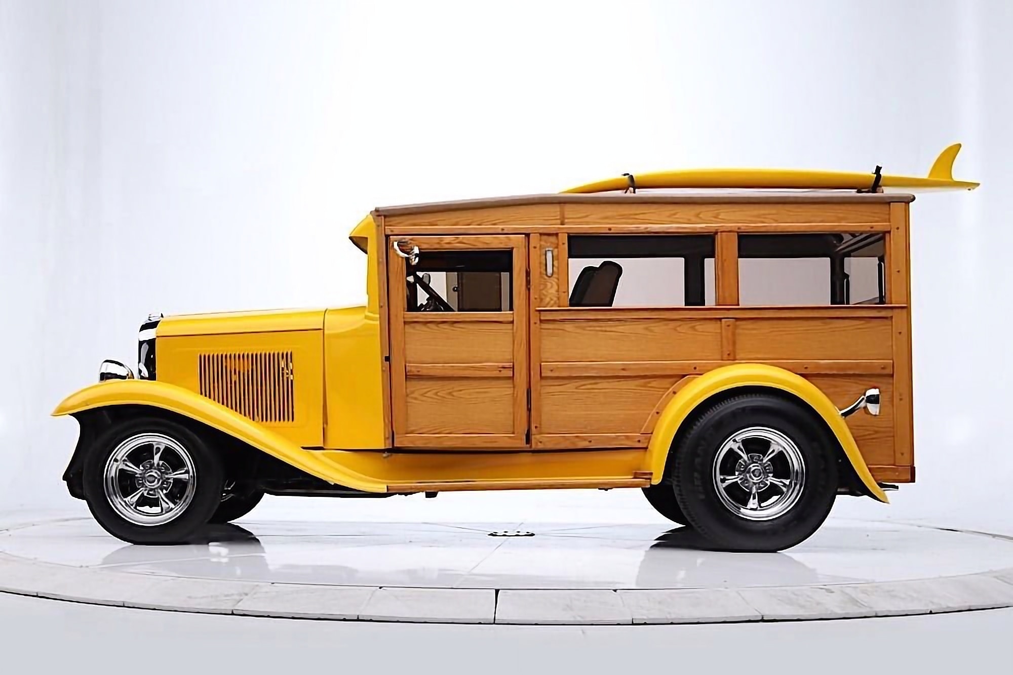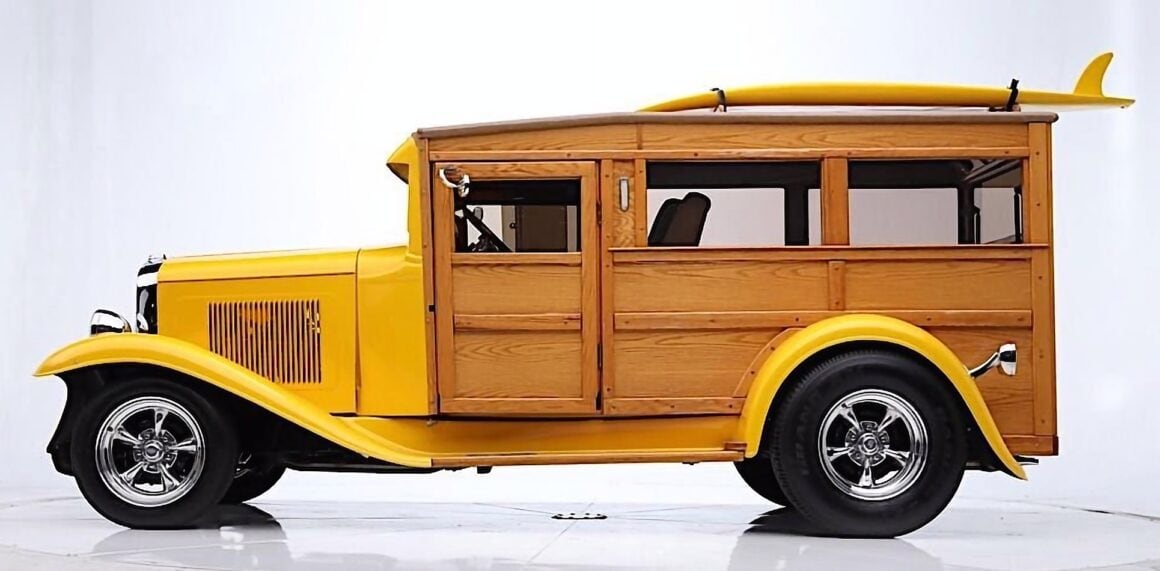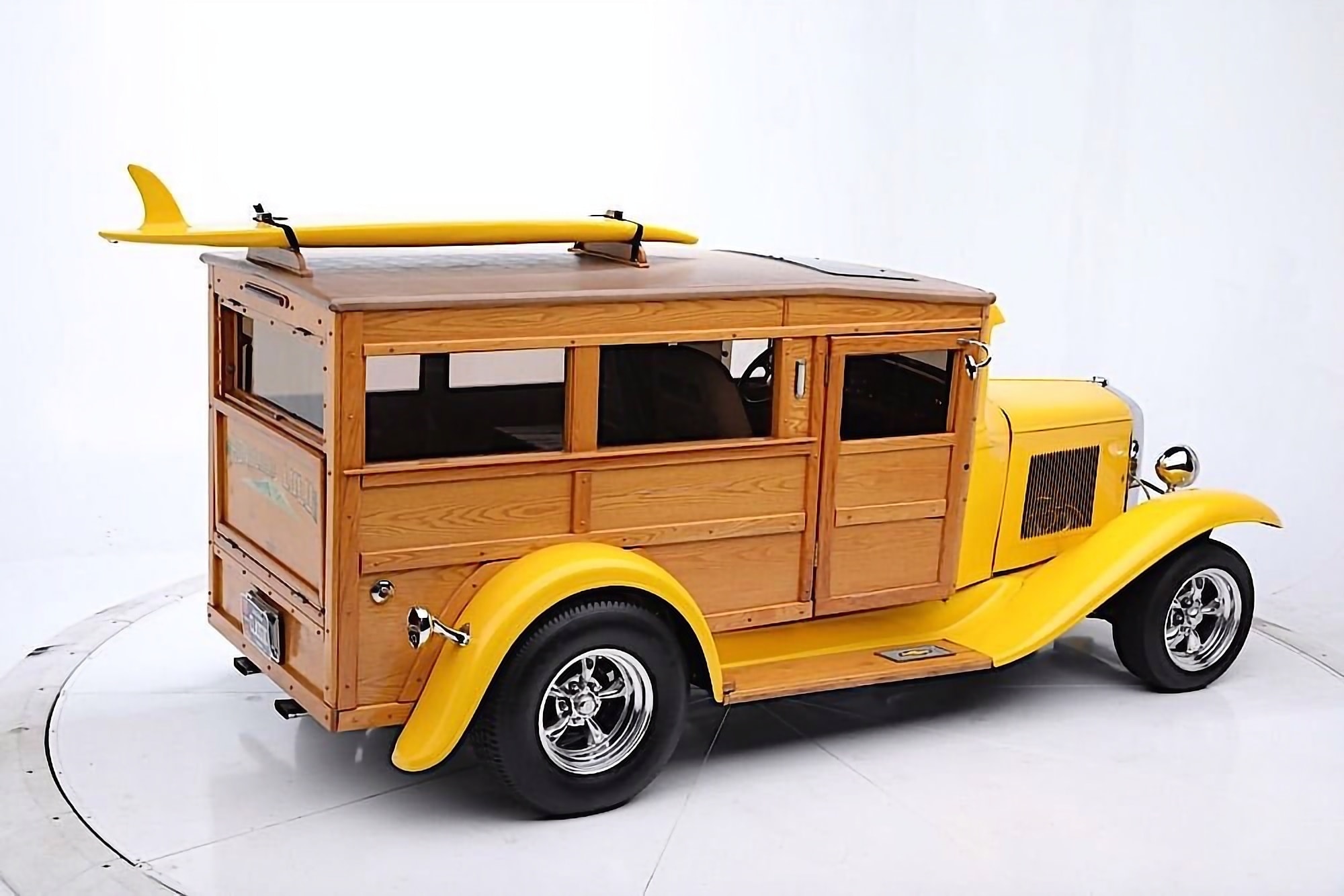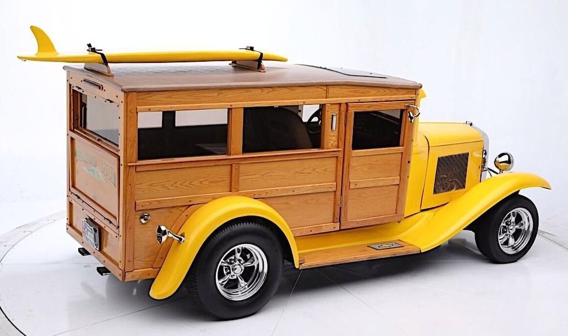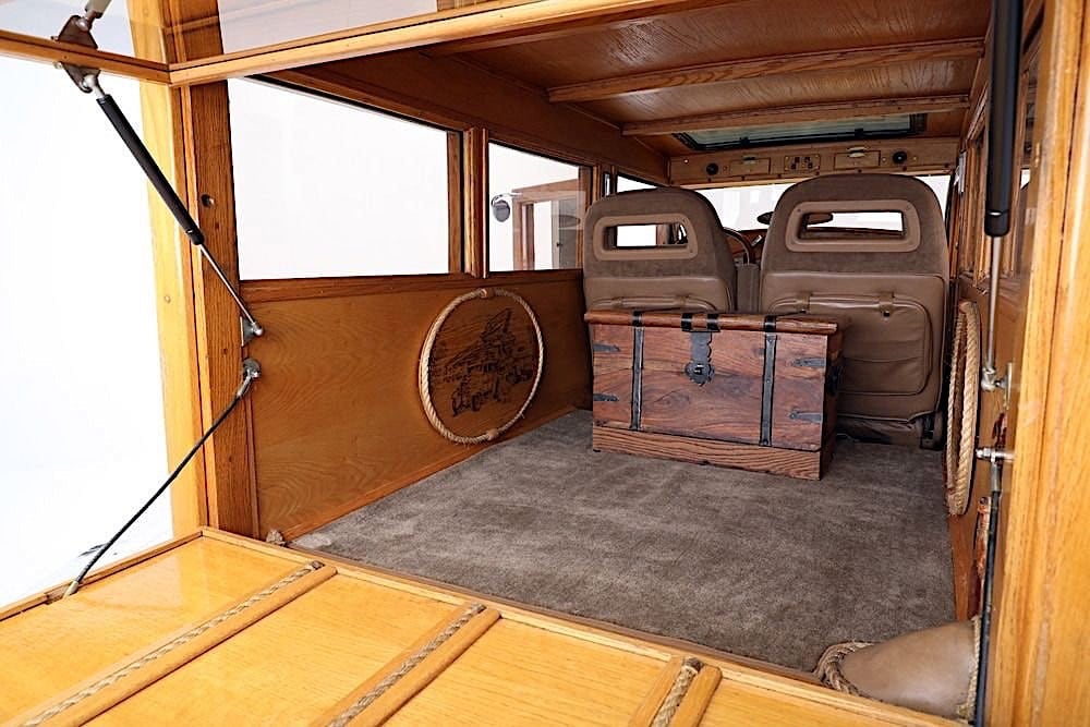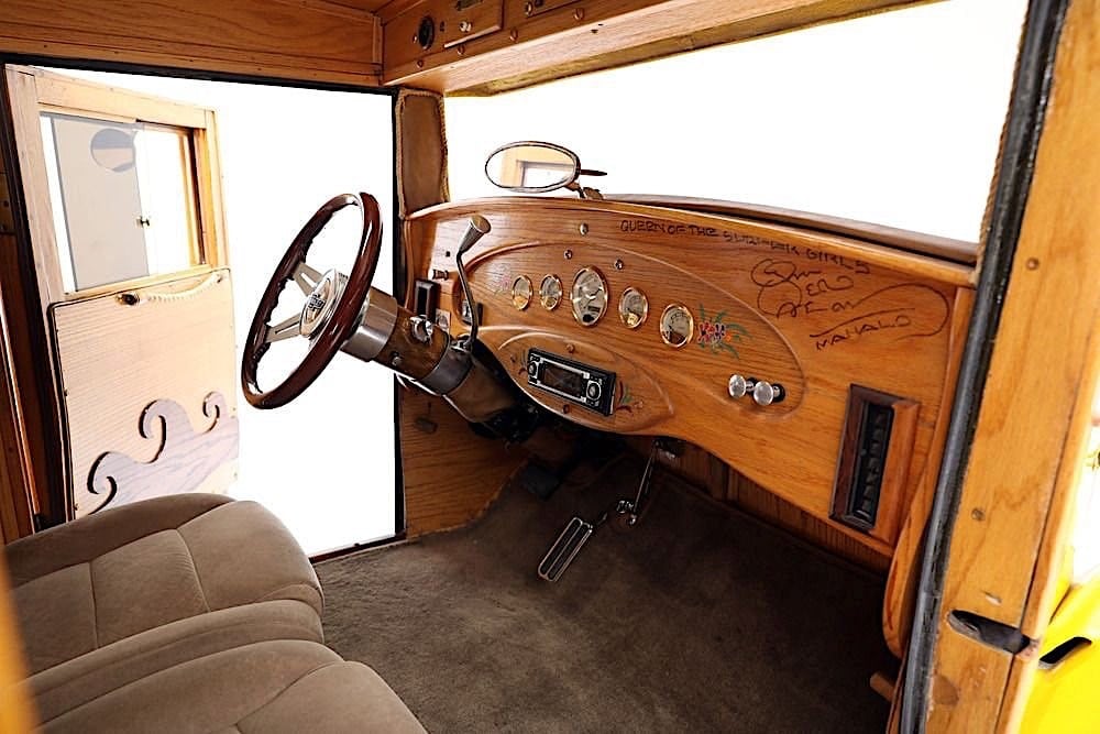 Vous suivez ? Pas trop compliqué ? Vous pouvez reprendre la lecture depuis la première ligne… Prenez votre temps… Pour ma part, j’ai déjà tout écrit et relu quatre fois, donc je m’en tape les coucougnettes… La peinture Yellow Pearl complète parfaitement les panneaux de bois qui forment la création de la caisse arrière du Hot-Rod-Mini-Van-Woody… La cabine est donc devenue “Wagon”, ou si vous préférez les descriptions des années ’80, c’est un “Delivery” disposant d’un toit ouvrant manuel. L’arrière a un hayon qui s’ouvre (gag !) pour permettre l’accès au grand espace à l’intérieur qui n’accueille que deux sièges avant, mais il y a suffisamment d’espace à l’arrière pour accueillir des nananas couchées… et, si nécessaire, du matériel de plage. Le V8 Chevrolet Small block 355ci s’est allié à une transmission Turbo350 pour “faire le job”… Concernant les bagages, la remorque Lil’Lulu fait également le job….