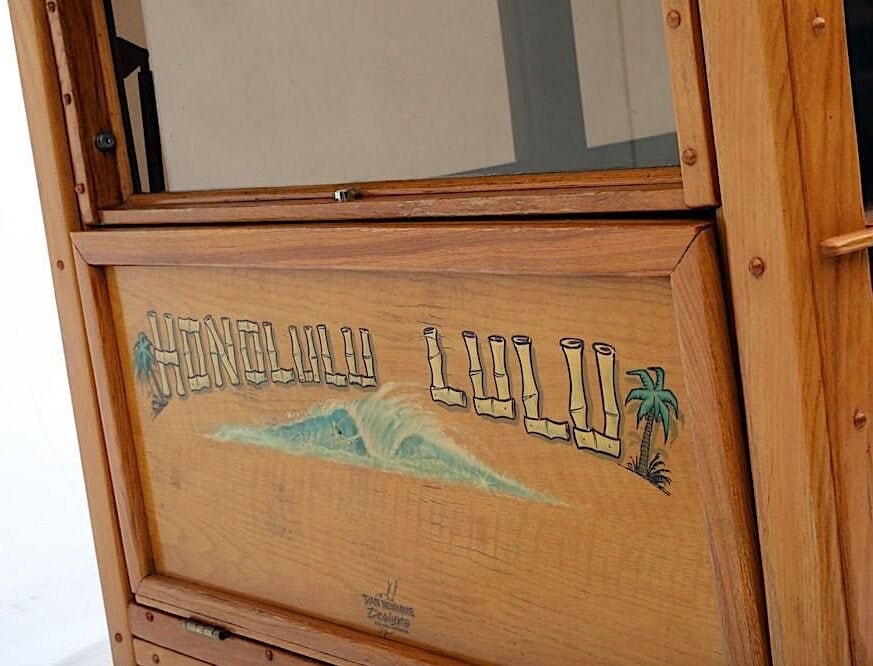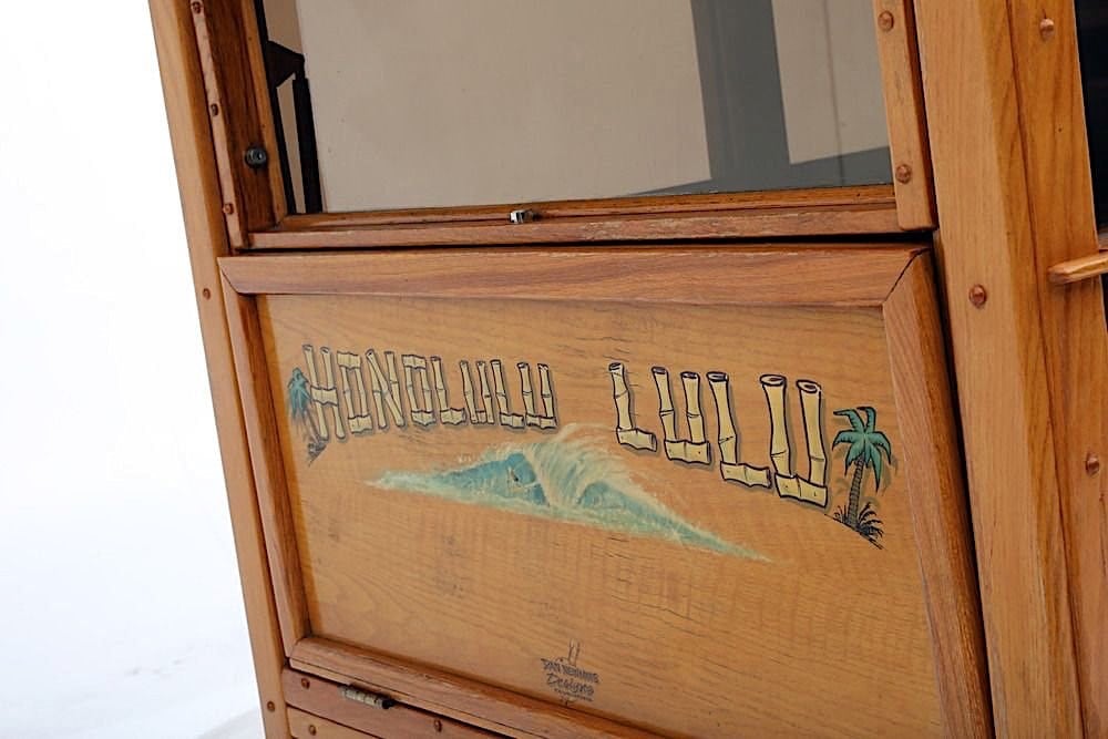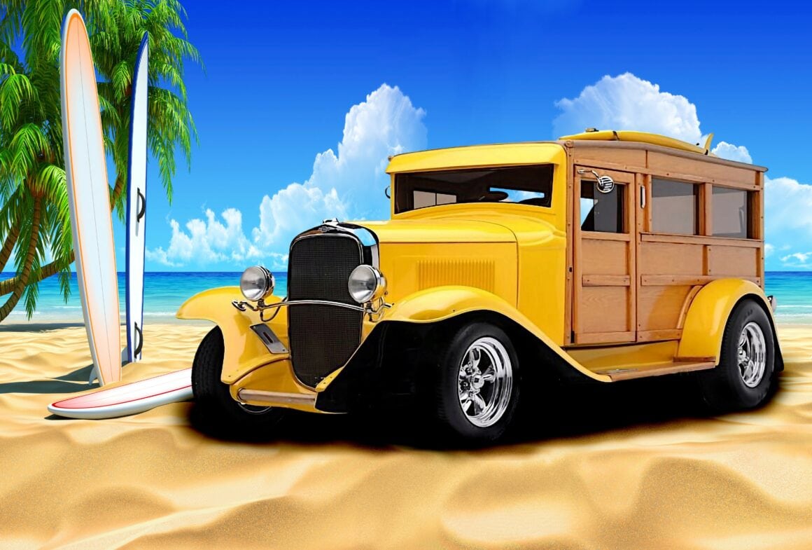Ce Hot Rod Delivery jaune avec ses panneaux de bois tout autour, ainsi qu’une planche de surf sur le dessus, constitue une image toute aussi : “Parfaite”... que l’image de l’escroquerie re-évoquée ci-avant… Parfaite pour aller sur une plage isolée pour surfer, baiser, surfer, baiser… et imaginer que c’est à nouveau l’été des temps d’avant… Ca vous plait, tout ça, ces aventures au mitan de l’océan Pacifique, mais est-ce pour une chasse aux trésors ?… Imaginez-vous avec la carte qu’une vieille sorcière (une demie Cougar sexuellement baisable) vous a refilé en sus d’une maladie rare, en même temps que 2 belles putes payables à l’heure d’utilisation. Wapuuhhh ! Vous voilà lancés sur la piste du Singe d’or à Honolulu. Zêtes refaits, la ville est un cauchemar puant, sans parler des arnaqueurs et arnaqueuses, des peaux de banane, des pirates et des fléchettes empoisonnées.