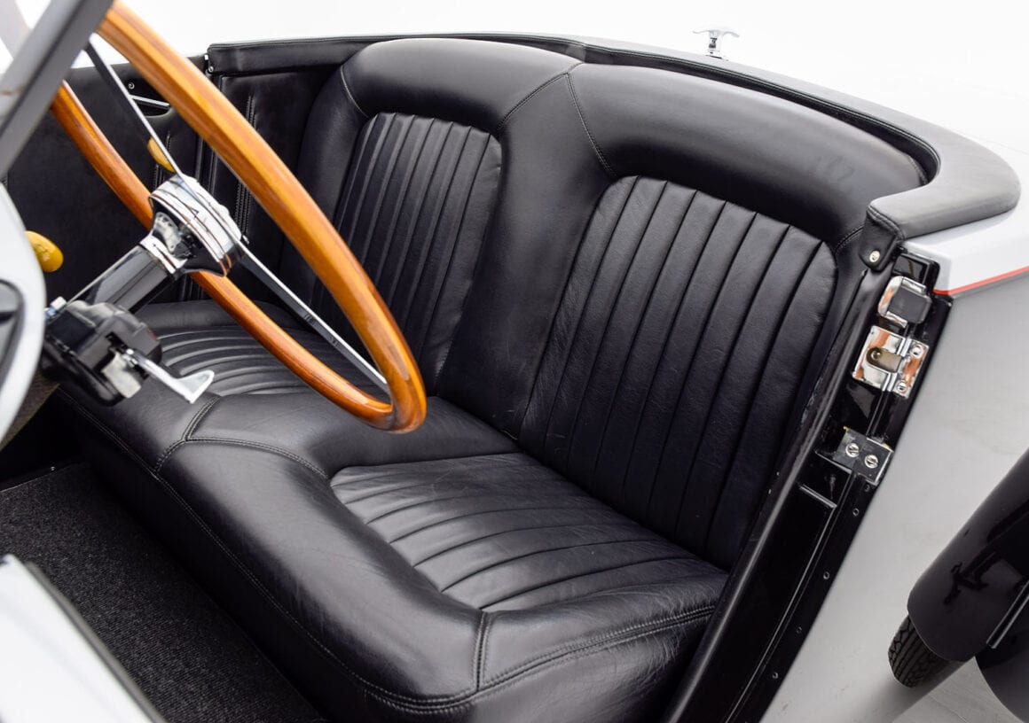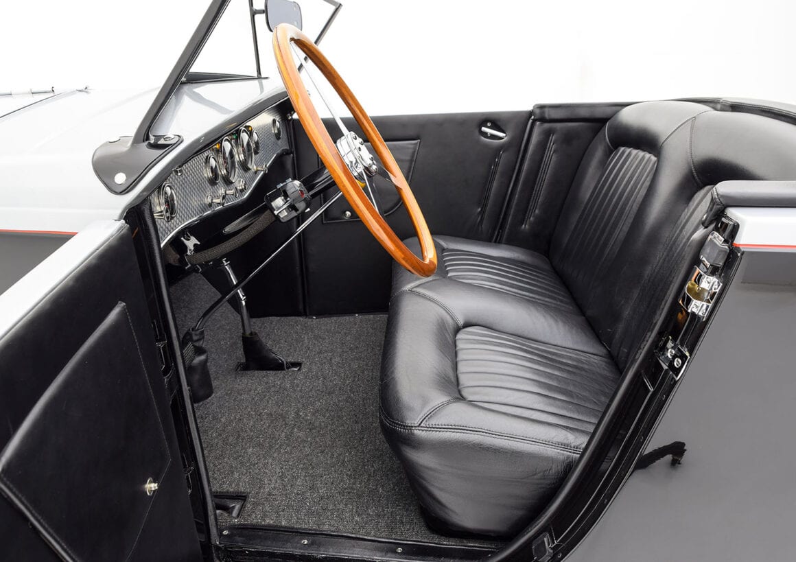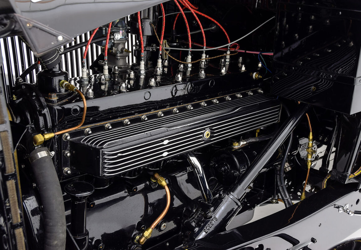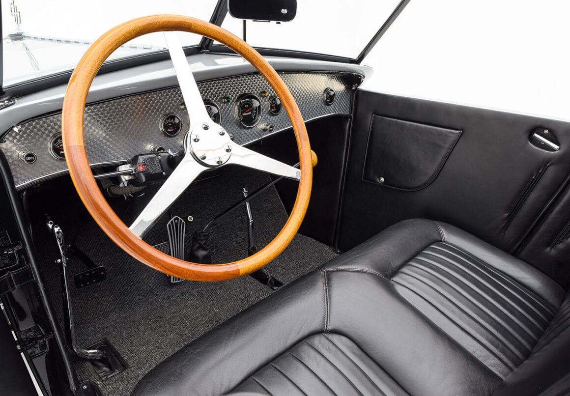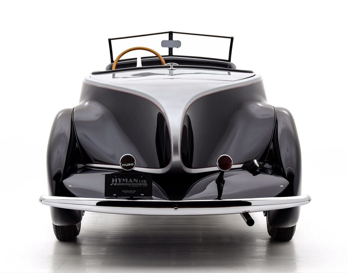 La “Bonneville’Hupp” a ensuite été vendue à Rick Blomquist, qui, avec son fils Cord, a commencé une restauration complète. Achevé en 2017, le fascinant speedster est maintenant dans une spécification très proche de la dernière fois qu’il a couru à “Bonneville Salt Flats”. Peut-être tout aussi impressionnant que la restauration de haute qualité est l’étonnant dossier historique, avec le titre original du Colorado de 1932, et des dizaines de lettres entre le Dr Knoch, la Hupp Motor Company et les fournisseurs. Sont également inclus des lettres de Mme Knoch rappelant leurs expériences à Bonneville, des photos de la voiture (dont une avec le chien d’August Duesenberg dans la voiture !), et de nombreux articles documentant l’histoire de la voiture, étroitement liée aux réalisations de Russ Snowberger à Indy. Maintenant restaurée avec amour par l’atelier White Glove Collection de la famille Blomquist, la “Bonneville Hupp Speedster” intrigante, se présente dans une peinture proche de la palette de couleurs noir et argent originale. Un 8 cylindres Hupp Model H d’époque se trouve actuellement sous le capot, magnifiquement détaillé et alimenté par un seul carburateur Stromberg surdimensionné. La restauration est très fraîche, n’ayant eu guère plus que le kilométrage de shakedown. La peinture et les détails sont excellents, et la voiture a une présence indéniable, avec la carrosserie unique en queue de bateau, les garde-boues aérodynamiques et la calandre et le carénage décontractés. Les rares phares de torpille E&J Model 20 sont un ajout ultérieur mais en ligne avec l’objectif et le caractère de la voiture.