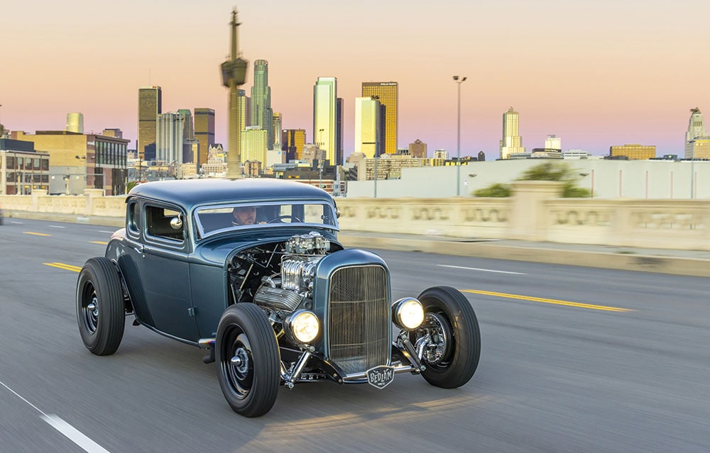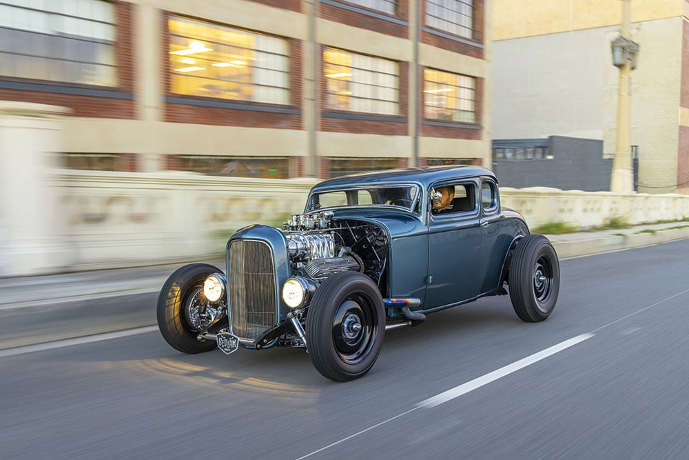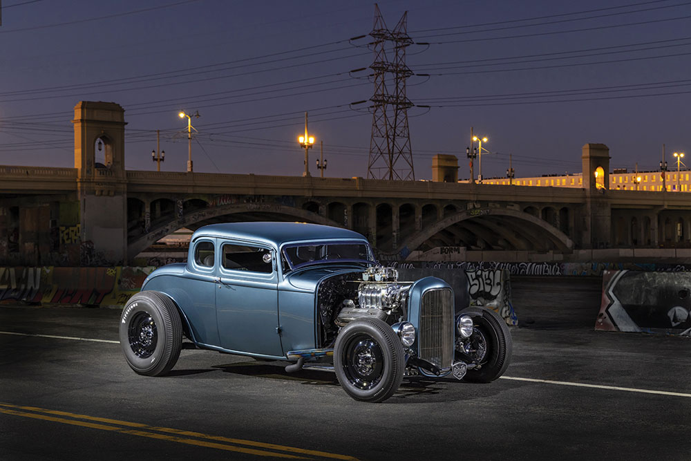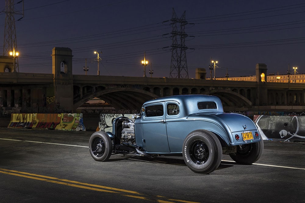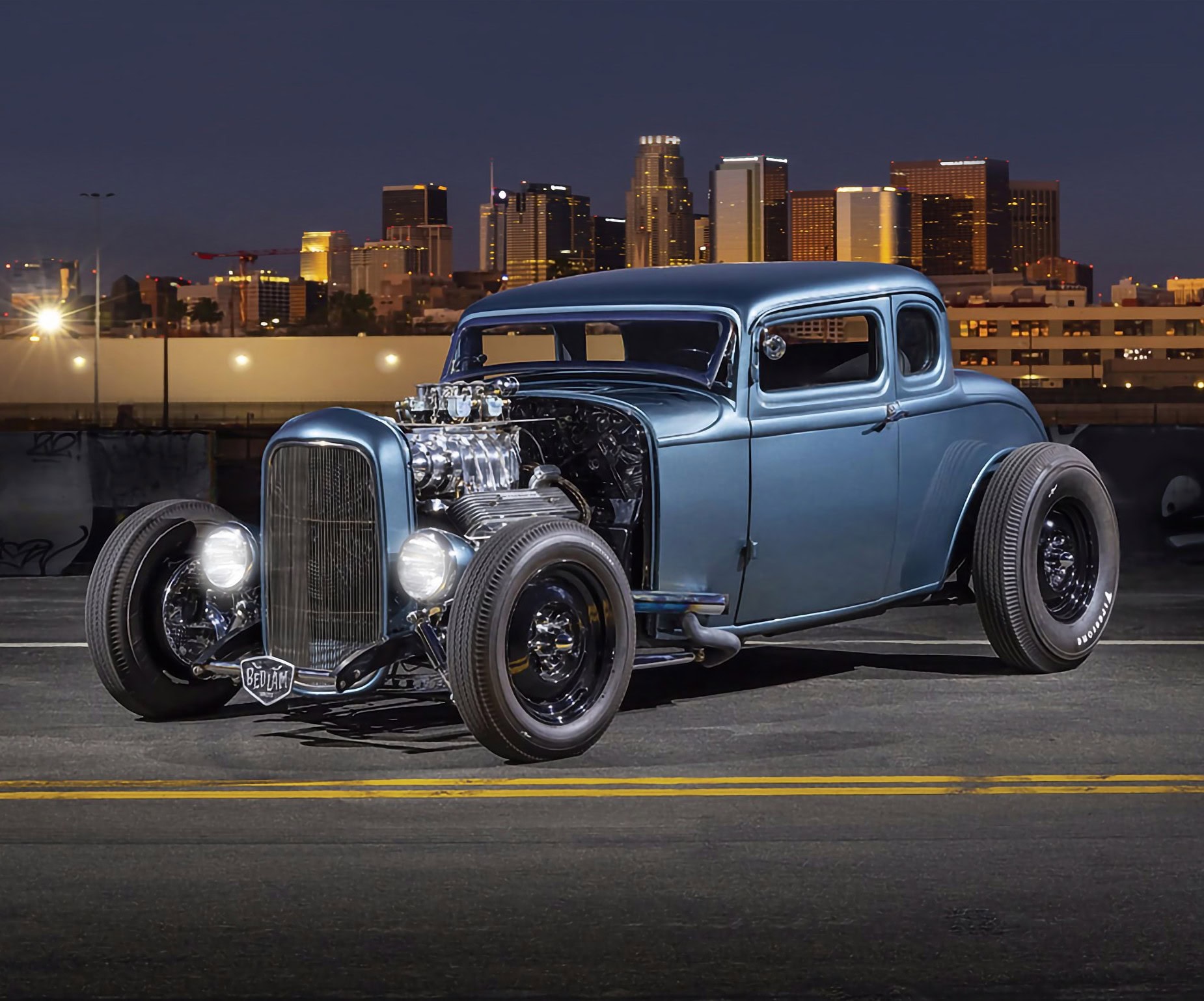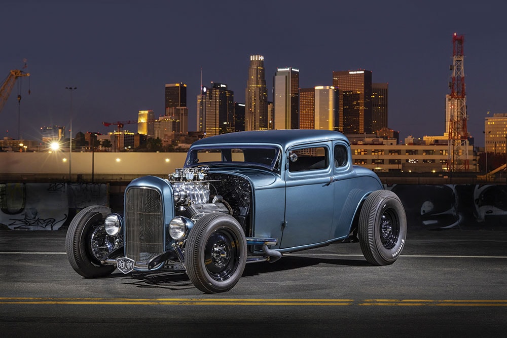 Simon a pu ramener le coupé Ford 1932 à Jim Aust qui a géré sa part du processus avec un mélange personnalisé proposant une teinte bleu glacier. Jim Aust et son équipe ont fait un travail incroyable en transformant ce vilain petit canard en cygne. Le travail de tôlerie sur mesure a été effectué chez Hollywood Hot Rods. Le Deuce tout en acier a été coupée de 5po et canalisée de 6po au-dessus du châssis. De là, le toit a été rempli et une cage de sécurité a été ajoutée. Une calandre Deuce sans capot et des phares Guide 682 C et des feux arrière Pontiac 50 ont été utilisés. Le châssis est un 32 sur mesure qui comporte une traverse avant modèle A (il a fallu abaisser l’avant d’un po supplémentaire) et une traverse arrière pour accueillir le QwickChange.