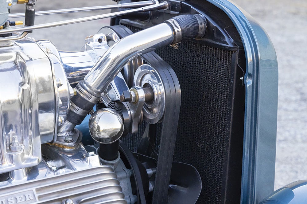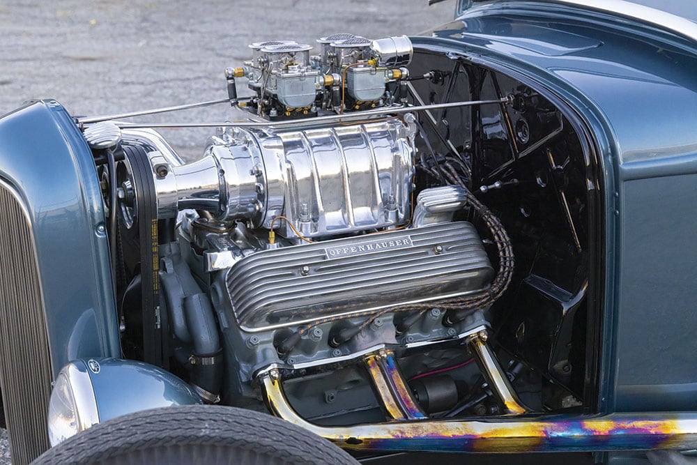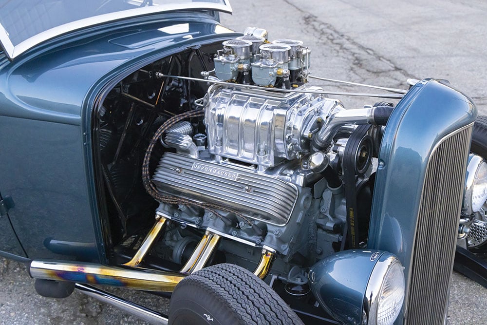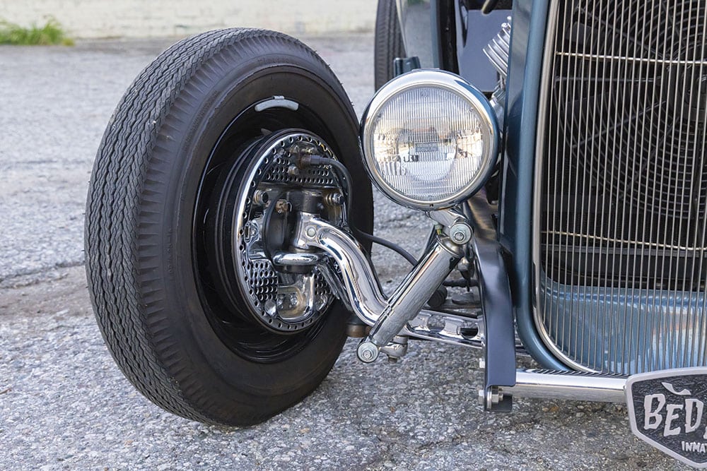 Un boîtier de direction de style Vega dirige les premiers axes Ford, qui se concentrent sur les freins à tambour Ford équipés de plaques de support percées Ford. Le Deuce roule sur des jantes aciers Wheelsmith Ford de 16 pouces en noir brillant avec des capuchons Spider les pneus étant des Firestone/Coker à plis diagonaux 5,00-5,25×16 à l’avant et 7,50×16 à l’arrière. L’utilisation d’un moteur Olds 324ci de 1956 et un Blower d’époque, permet de garder le look vintage. L’Olds arbore une compression de 9,5:1 avec un compresseur/blower de style roots poli de Ross Racing en 4,71. Un distributeur incurvé Olds de Kent Weaver (utilisant des fils enveloppés de tissu) est utilisé avec quatre carburateurs Stromberg 97 reposant sur une admission Hollywood Hot Rods.