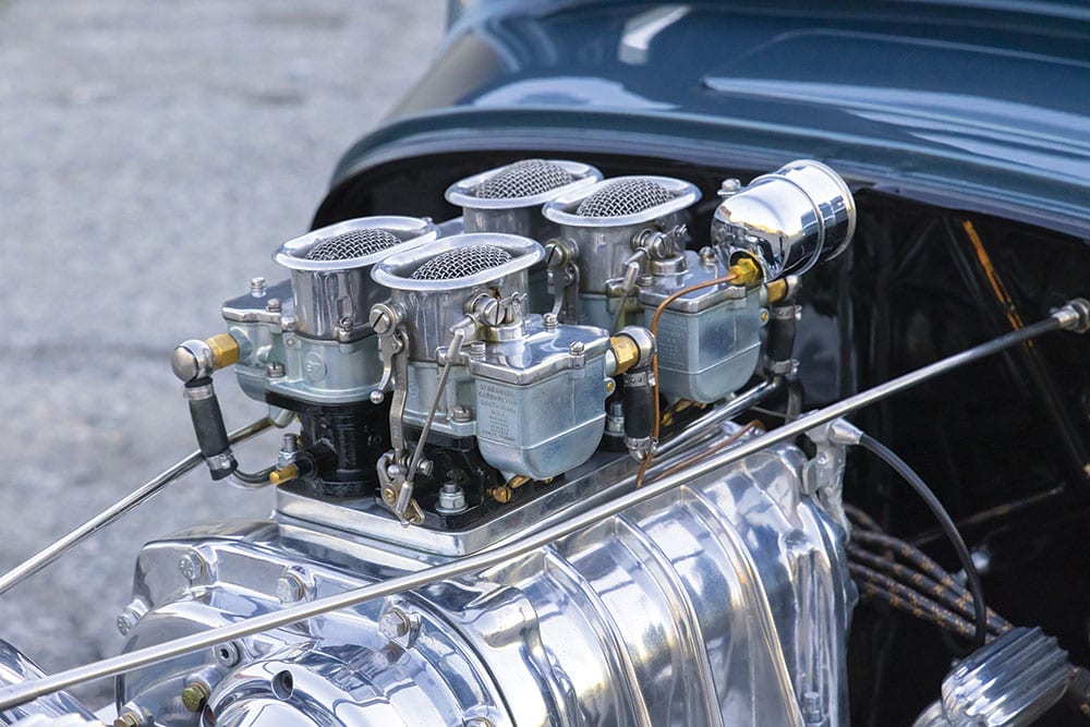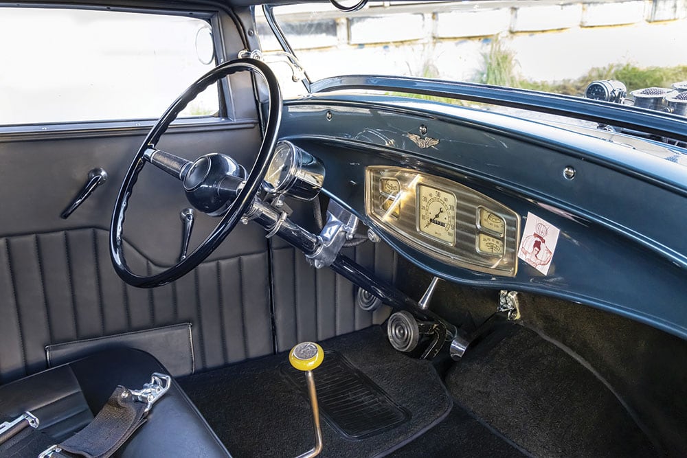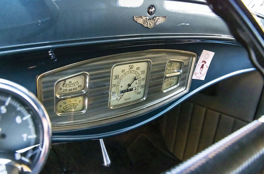 Ils ont également fabriqué l’échappement personnalisé allant des collecteurs aux découpes jusqu’au tube qui retourne à une paire de silencieux et se déverse ensuite près de l’arrière. Les couvercles de soupapes et les reniflards Offenhauser vintage sont également utilisés pour ajouter un peu de distinction. Sous le toit du coupé, vous trouverez un tableau de bord Ford 1932, mais il est maintenant habillé d’instruments Dodge de 1933, ainsi que d’un tachymètre à 8 grands. Le faisceau de câbles du Centech a été positionné grâce aux efforts de Hollywood Hot Rods qui s’est occupé de tout le câblage. La colonne de direction à tube droit met de plus en valeur un volant Ford 40 et un clignotant monté sur la colonne.