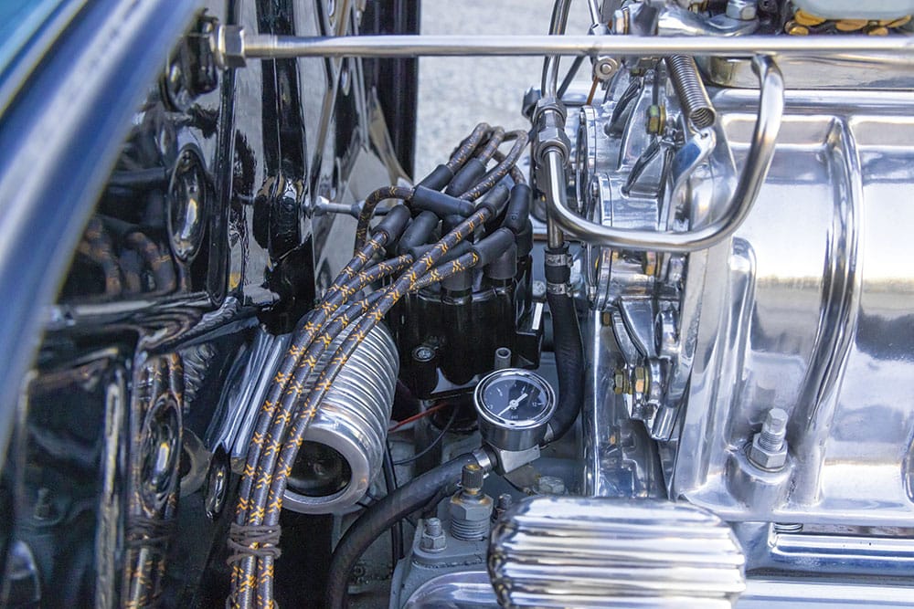 Speedway Engineering a exécuté un combo 3,78/4,34 qui est maintenu en position avec un ressort transversal modèle A, des amortisseurs Pete et Jakes, une paire de barres d’échelle. Le train de roulement poursuit le thème avec une peinture noire mate et un boîtier en métal brut. L’arbre de transmission en aluminium relie le changement rapide et la transmission Muncie à quatre vitesses, un clin d’œil aux pièces de la vieille école. Le volant moteur est un Olds avec un embrayage Performance Racing. À l’avant, l’essieu chromé percé de la poutre en I a été livré par l’intermédiaire de SO CAL Speed Shop avec une paire d’amortisseurs à tube chromé SO-CAL, un ressort à lames transversal modèle A et des triangles Ford ’32 fendus chromés.