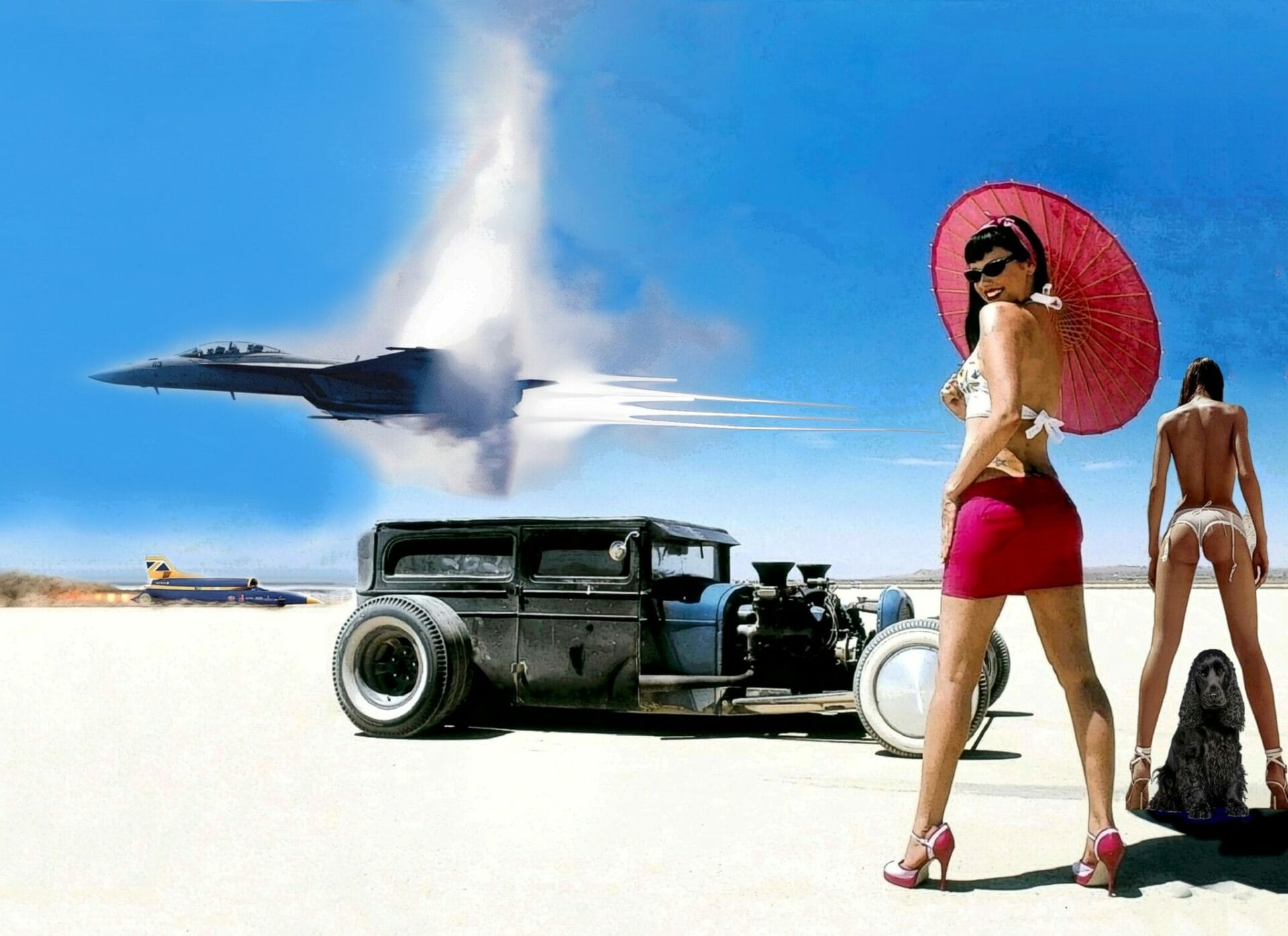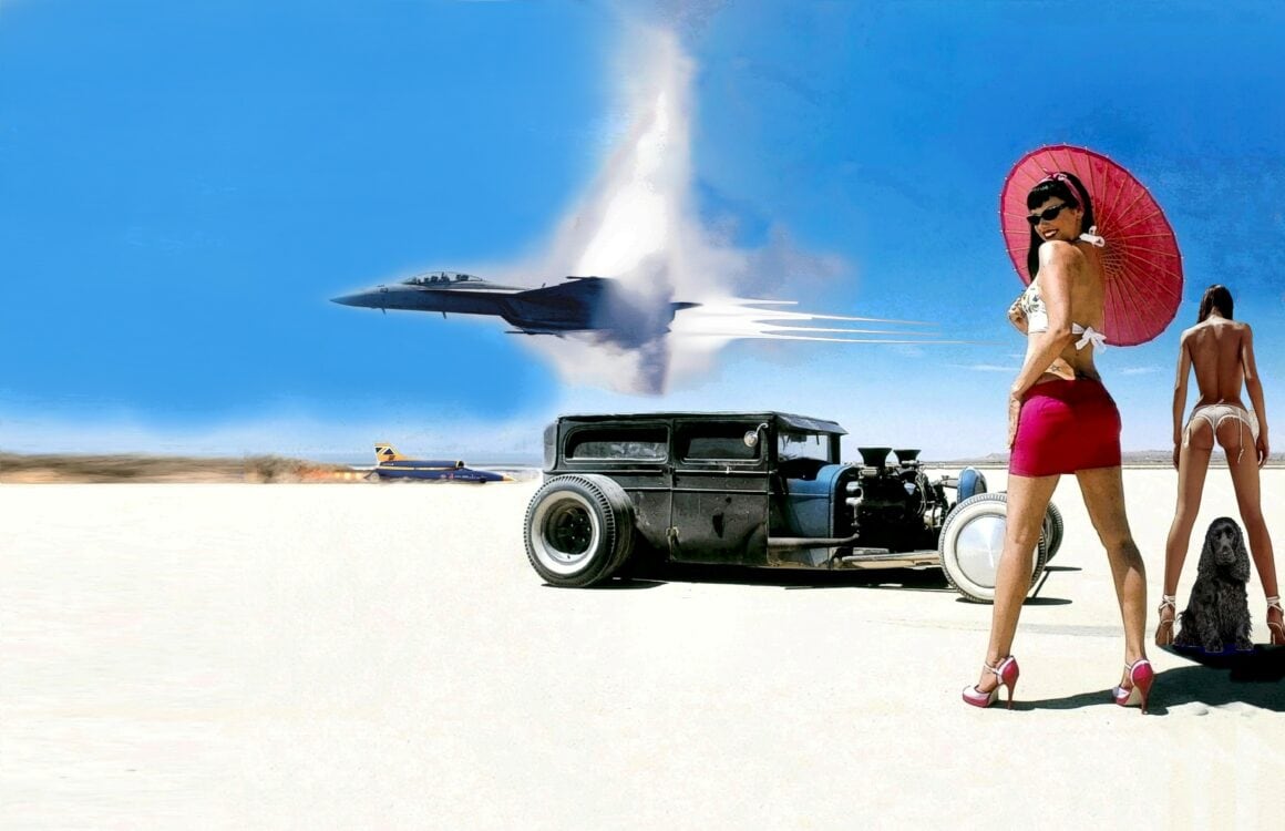 J’ai couru presque hors de mon Roadster, heureuse d’échapper enfin aux histoires décousues de cette chère invitée avec laquelle je m’étais imaginée jouissantes toutes deux dans une extase orgasmique ininterrompue… pour me retrouver d’un coup devant un décor déconcertant au premier abord. Aprés un voyage fabuleux ou Vanessa n’a pas cessé de babiller de manière ininterrompue concernant ses anciennes amours torrides avec Anamary, nous sommes arrivées enfin à destination, un petit meeting de Hot-Rod’s et Custom-cars dans l’esprit “kéké”… Imaginez un désert de béton ; des rues à l’asphalte brûlant, des voitures américaines flashy et débiles, décorées “à-la-kéké”… et une multitude de Hot-Rods basiques, “Kékékisés” eux-aussi…, semblant provenir d’un film d’horreur du début des années cinquante…, mettant en scène des monstruosités roulantes ! Sans compter les shops couleur locale : en l’occurrence couleur Mexicanos des bidonvilles…