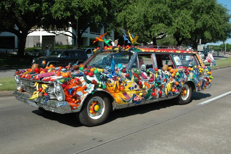 Même mes amantes (ainsi que le grand videur aussi loquace qu’un cactus), semblaient abasourdies (mais était-ce exceptionnel chez eux ?) de voir que derrière certaines petites constructions de briques et de tôles ondulées se cachaient en fait des shops bien fournis de vêtements et accessoires divers des plus branchés. Une sorte de “kamasutra” en somme. Après avoir “dévalisé” les shops, notre petit groupe, aussi discret qu’une meute de paparazzi flairant une piste paillettée, se retrouva dans la rue principale, où passaient, en cortège, des voitures entièrement modifiées dans le plus pur style Kéké…, la plus débile de tout ces tableaux roulants étant une Caddy Break colorée et “décorée” de fruits…, cauchemar d’une artiste qui proposait d’autre-part une intéressante série d’œuvres pornographiques dont certaines avaient été faites conjointement avec un autre artiste (sexuellement mélangées apparemment). Le panneau placé devant le-dit bâtiment ne laissait aucun doute : c’était là que se déroulait le rendez vous des Super-Kékés……