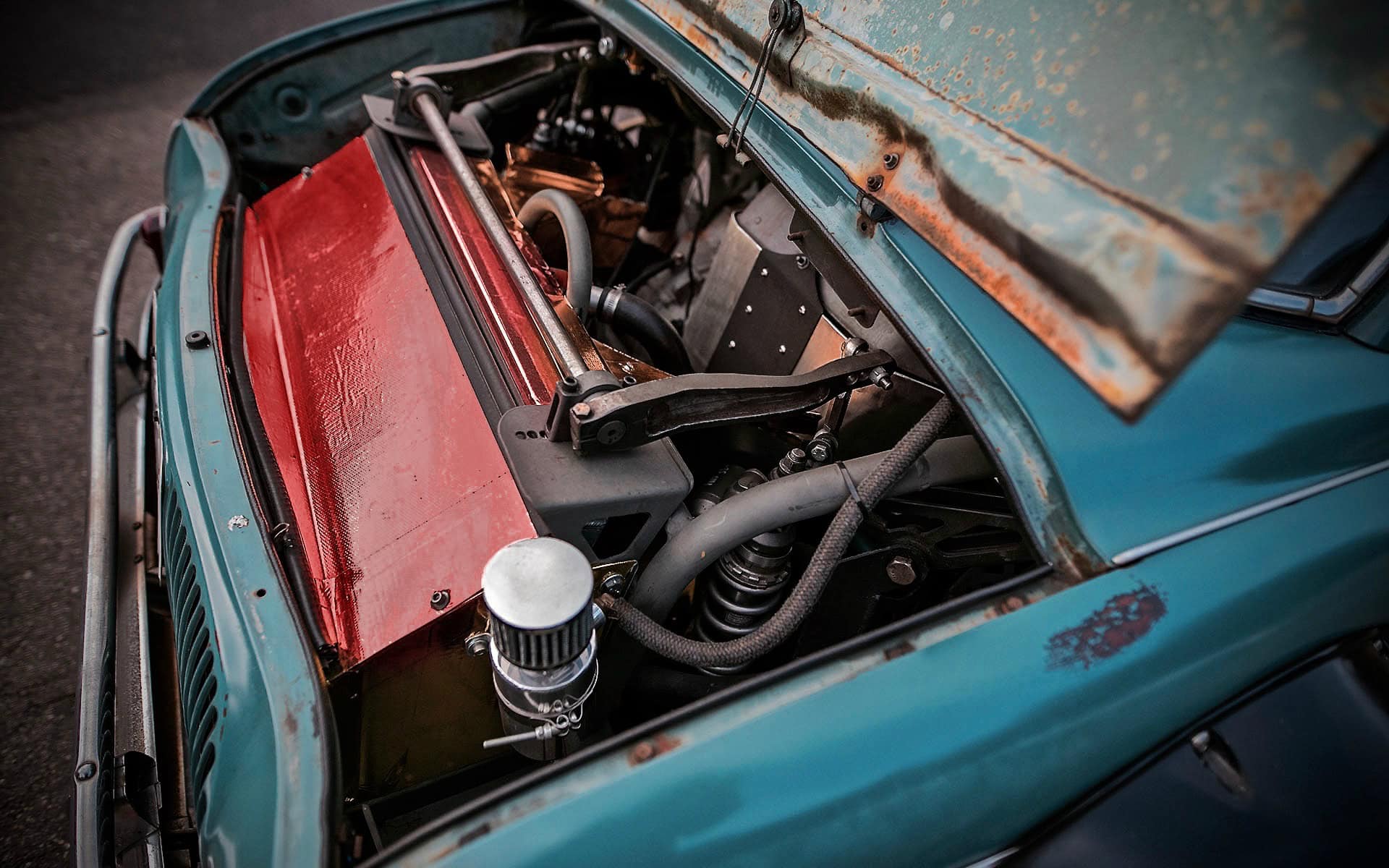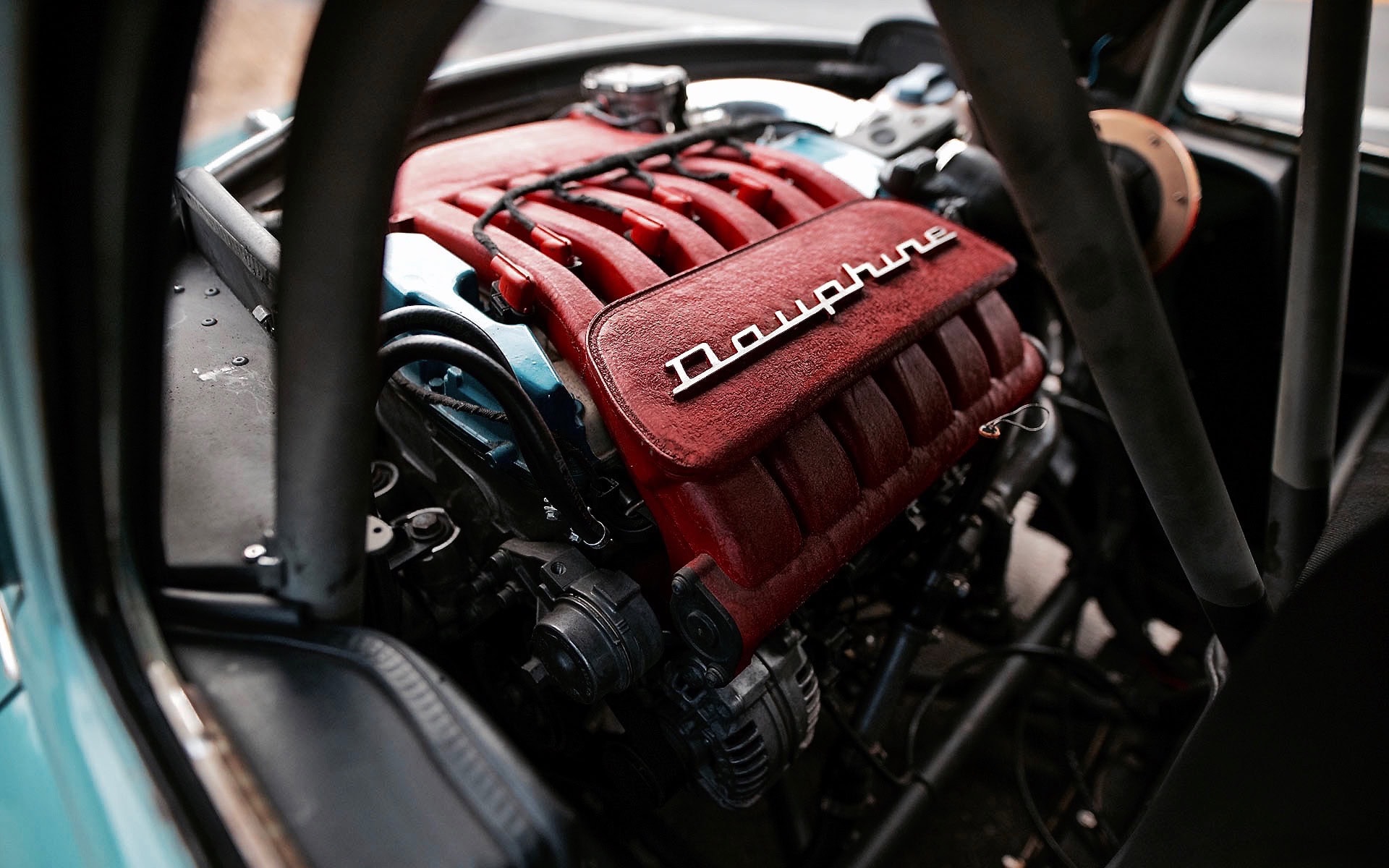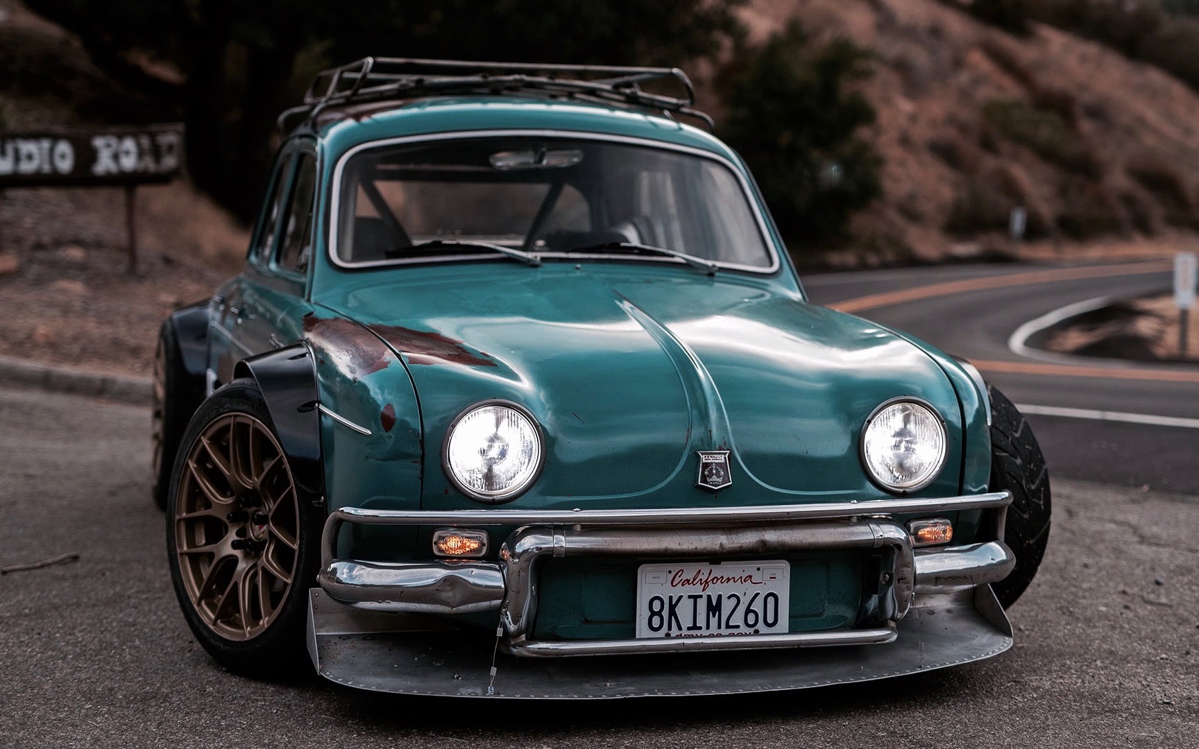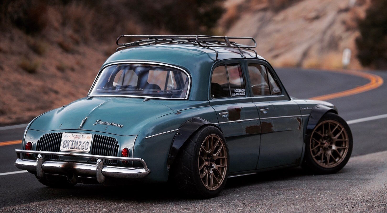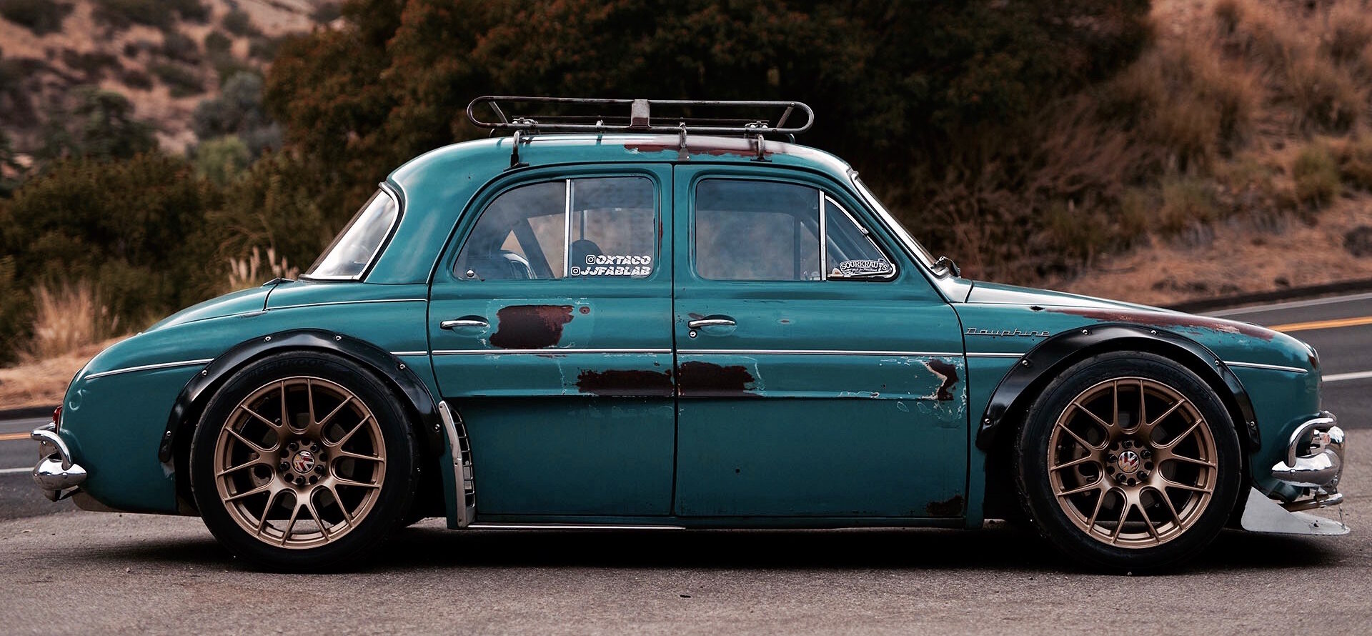 Elles porte en elles de l’acier rouillé brûlé par le soleil : parfaitement orange en contraste avec la couleur qui orne la voiture elle-même. Une galerie de toit MK1 Rabbit a été modifiée et pliée à la forme du toit de la Dauphine (pour un peu de rangement, car l’intérieur est largement consommé par un moteur 6 cylindres et une cloison pare-feu résistante à la chaleur). Un séparateur et un diffuseur en aluminium personnalisés, construits à la main par Justin, donnent bien sûr une touche d’attitude virile à l’extérieur autrement timide de la voiture, à l’exception des grandes arches noires à chaque coin.