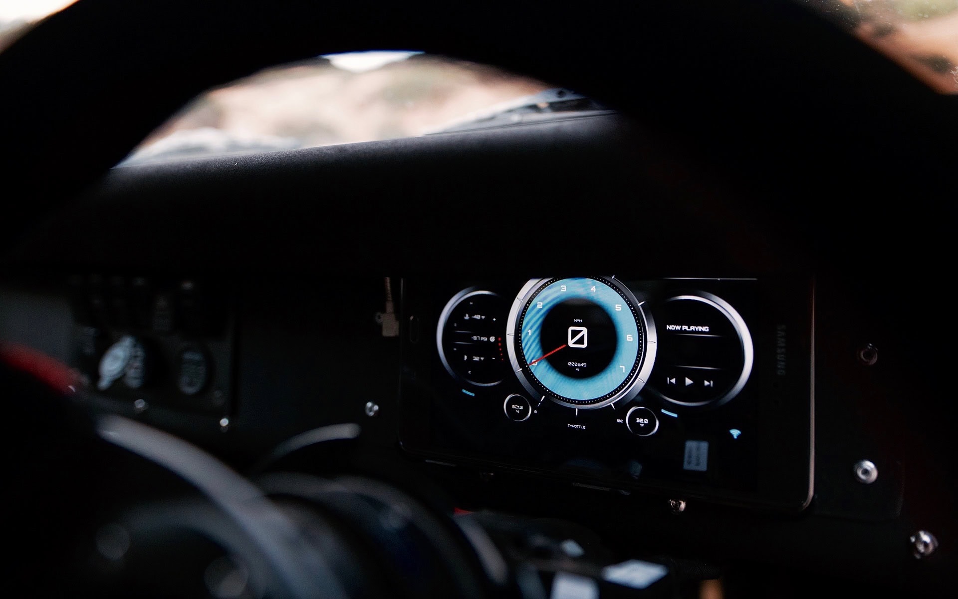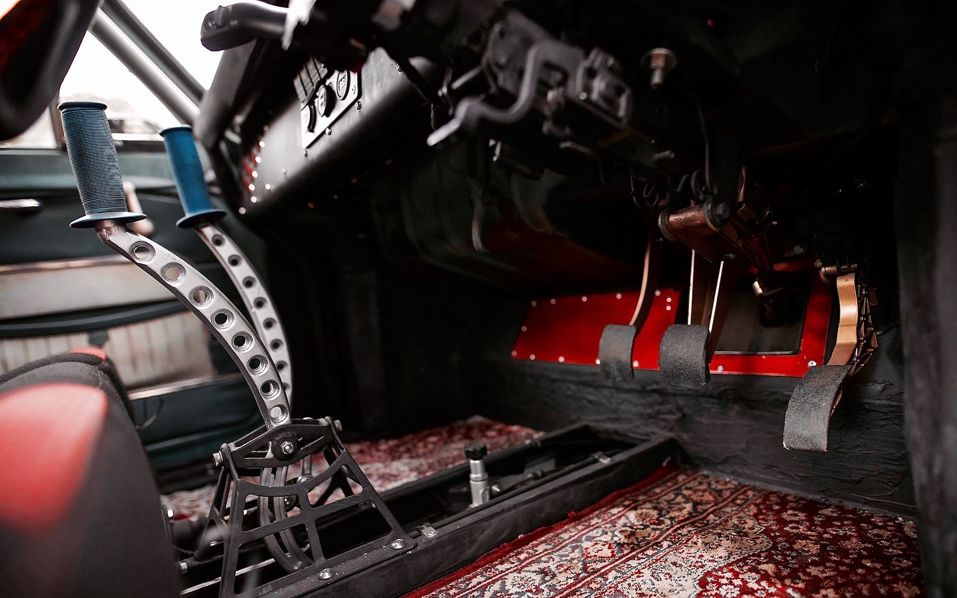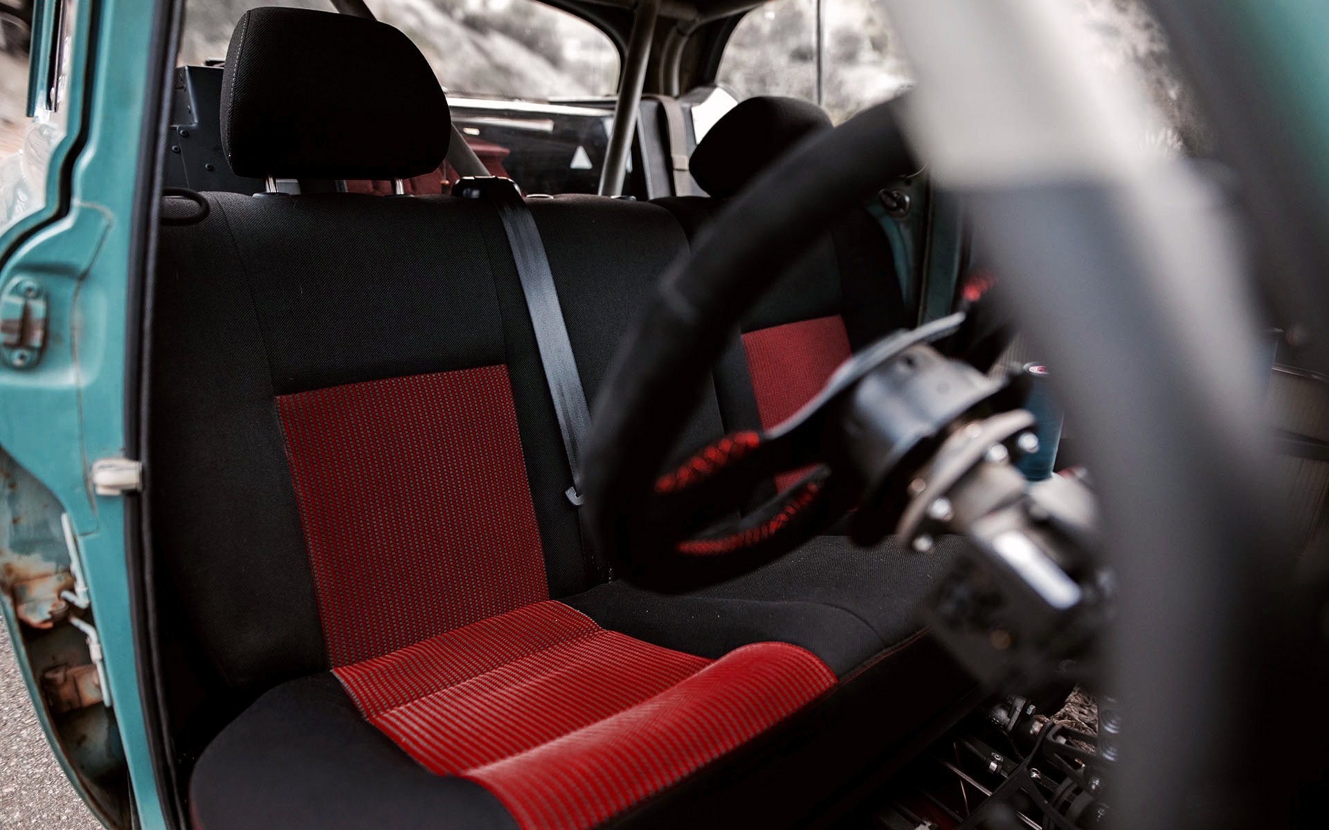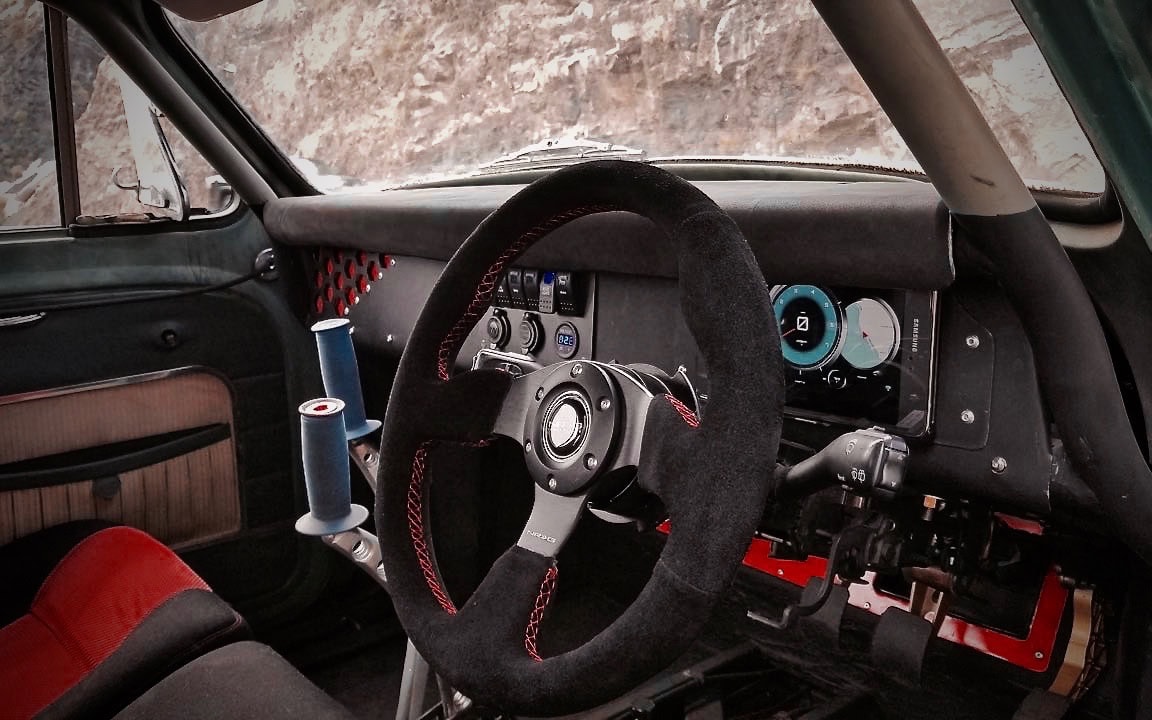 Un lecteur Wifi OBD2 et une tablette Android en guise de tableau de bord, qui communique à la volée avec un calculateur de Rallye (un sport automobile personnalisé mais controversé)… Un volant Renault moderne et des sièges Status personnalisés apportent un peu de modernité à l’intérieur, et une paire de leviers sur mesure pour le seul levier de vitesses et le frein électronique hydraulique se dressent au-dessus de la console centrale uniquement dans le but de tout compliquer volontairement… Une cage de sécurité se fraye également un chemin à travers l’intérieur, offrant une sécurité douteuse au conducteur…
