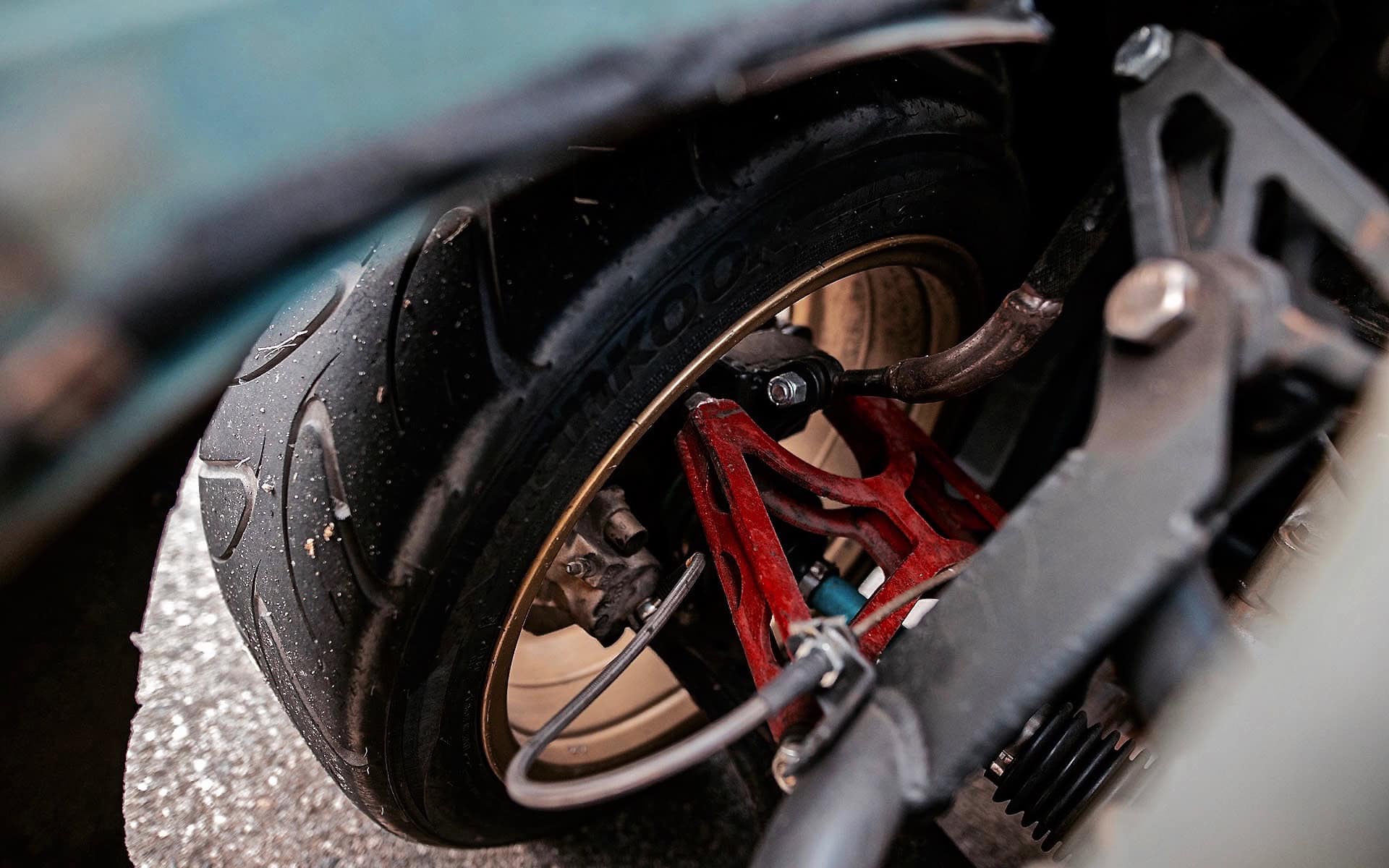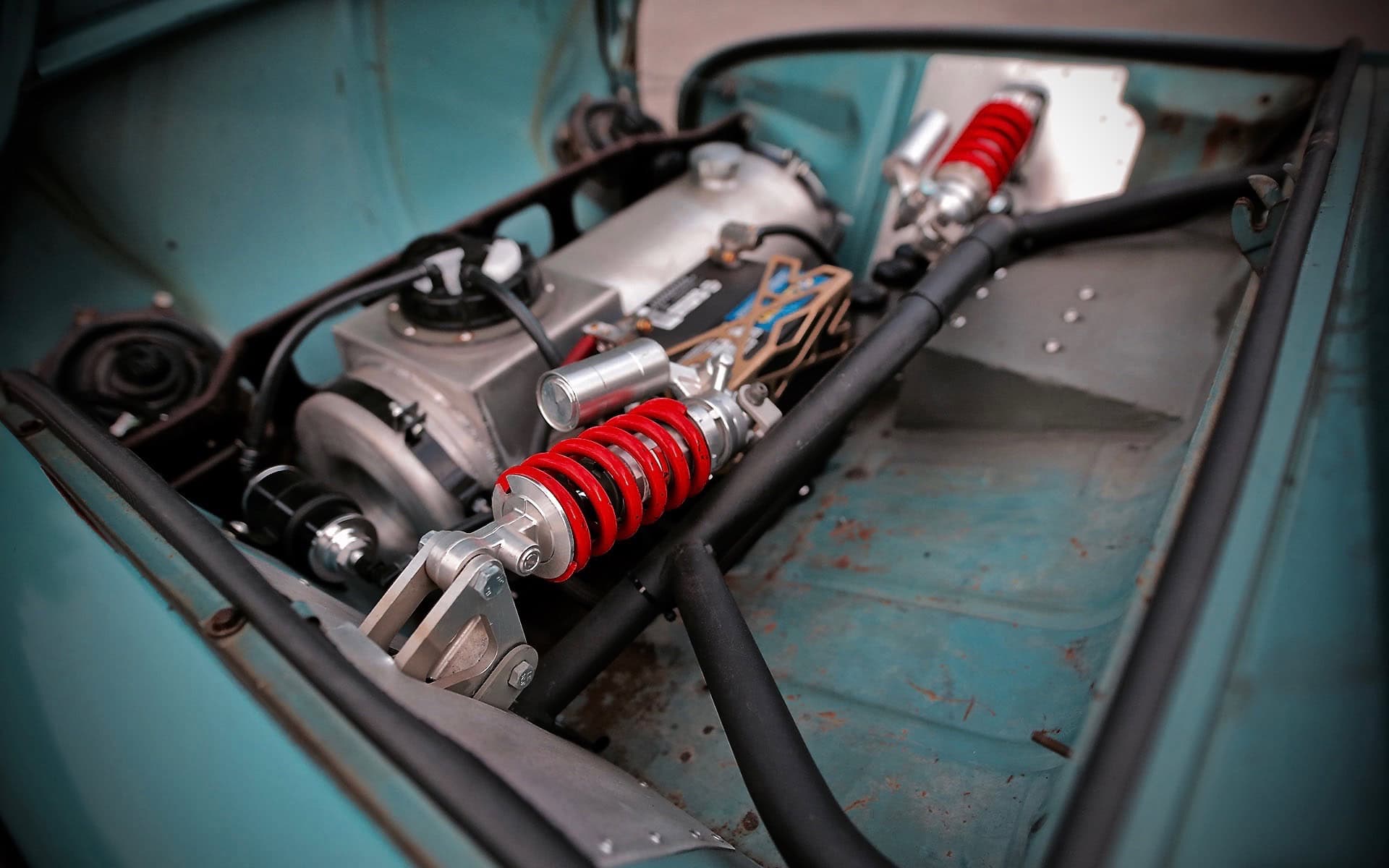 Pour y parvenir, Justin a utilisé les conduits de porte d’origine comme alimentation en air, à l’appui d’un tunnel de transmission supplémentaire qui agit comme un conduit massif pour que l’air s’écoule sous la voiture. Cependant, le changement de moteur seul était loin d’être suffisant pour atteindre l’orgasme absolu…et, par la suite, Justin a entrepris de redessiner complètement le cul ET la suspension à partir de zéro. Vaguement basée sur la géométrie MK4 Volkswagen, la largeur de voie est identique à celle de son donneur, ce qui souligne à quel point la Dauphine est petite sous sa forme d’usine.