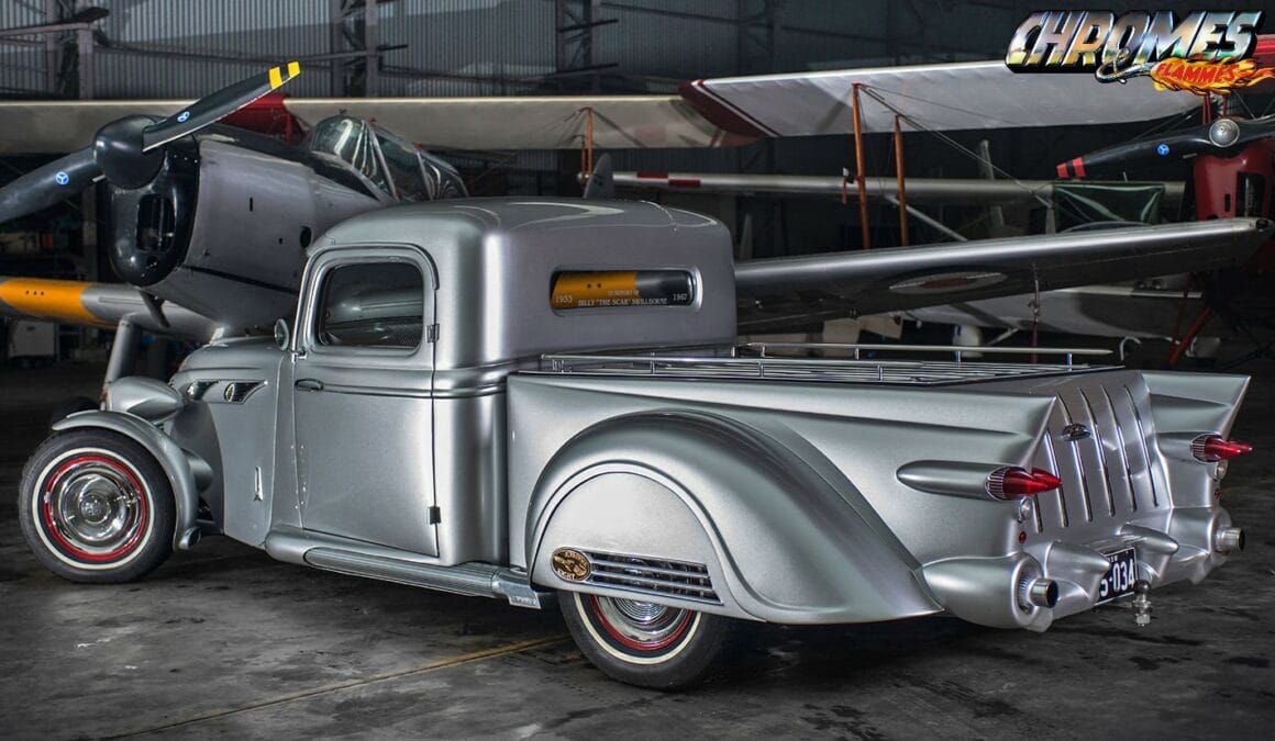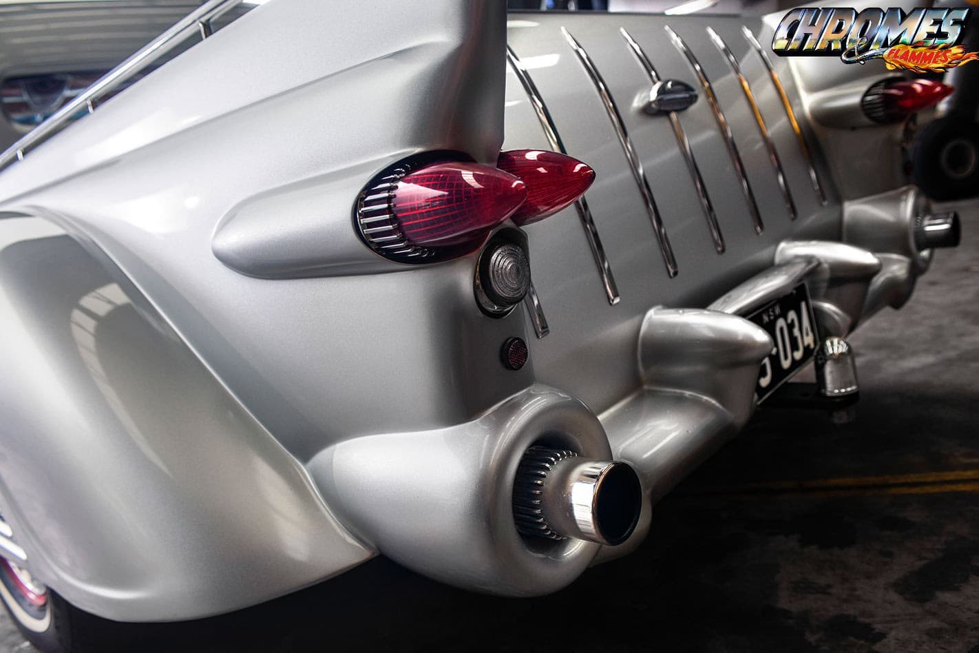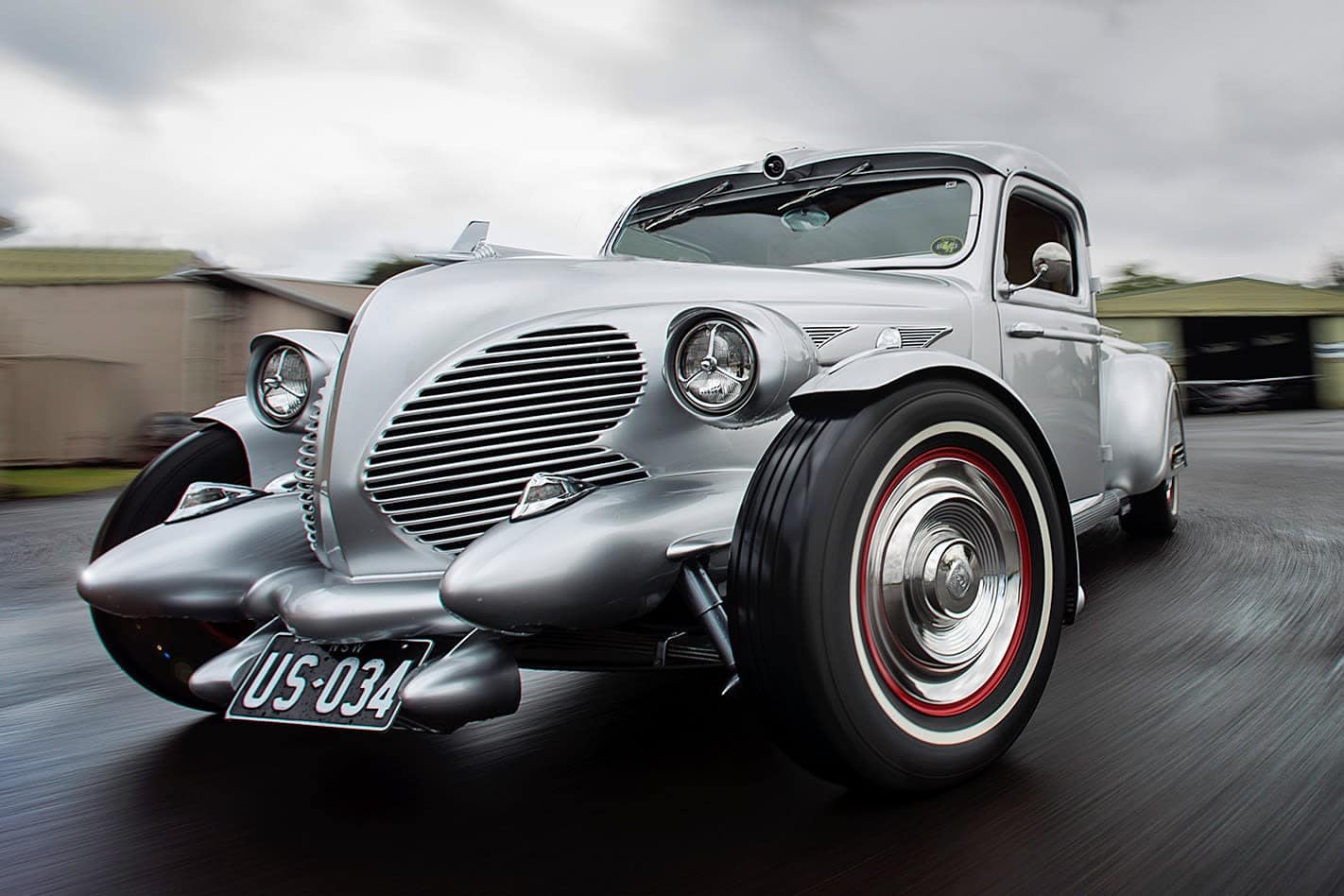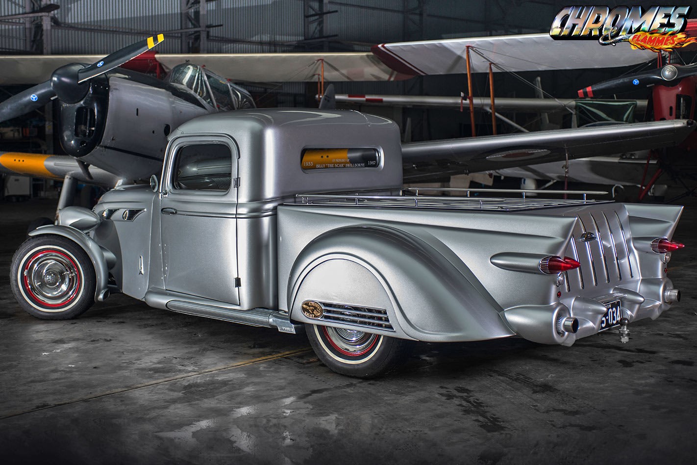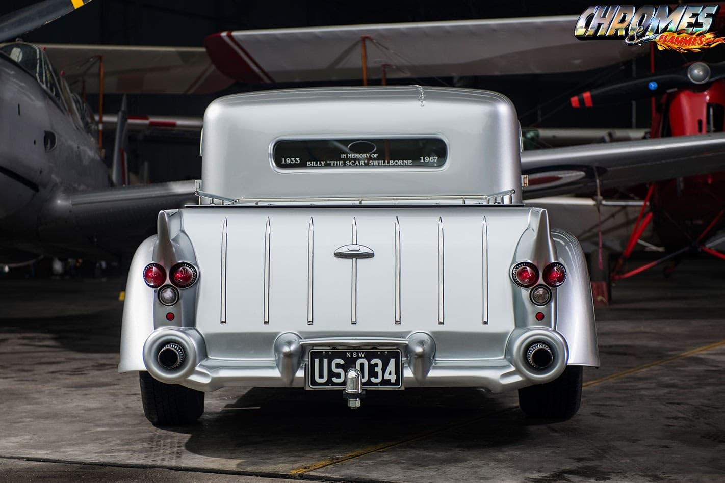 Avec l’Airborne Eight équipé d’un V8 Ford 1935, une nouvelle ère devait s’ouvrir, mais c’est un tombeau qui s’est ouvert qui a engloutit la société qui construisait cette horreur durant la Grande Dépression. Dieu seul sait comment l’une d’entre-elles s’est retrouvée en Australie ou elle est restée dans un musée local jusqu’en décembre 1983 où un Kustomiseur du cru dénommé Bluey et demeurant à Sydney en est tombé fou d’amour et l’a acquise dans l’idée d’en faire un engin extraordinaire. Il l’a d’ailleurs mise au centre de sa collection d’américaines: Falcon, Torino, Chevy.