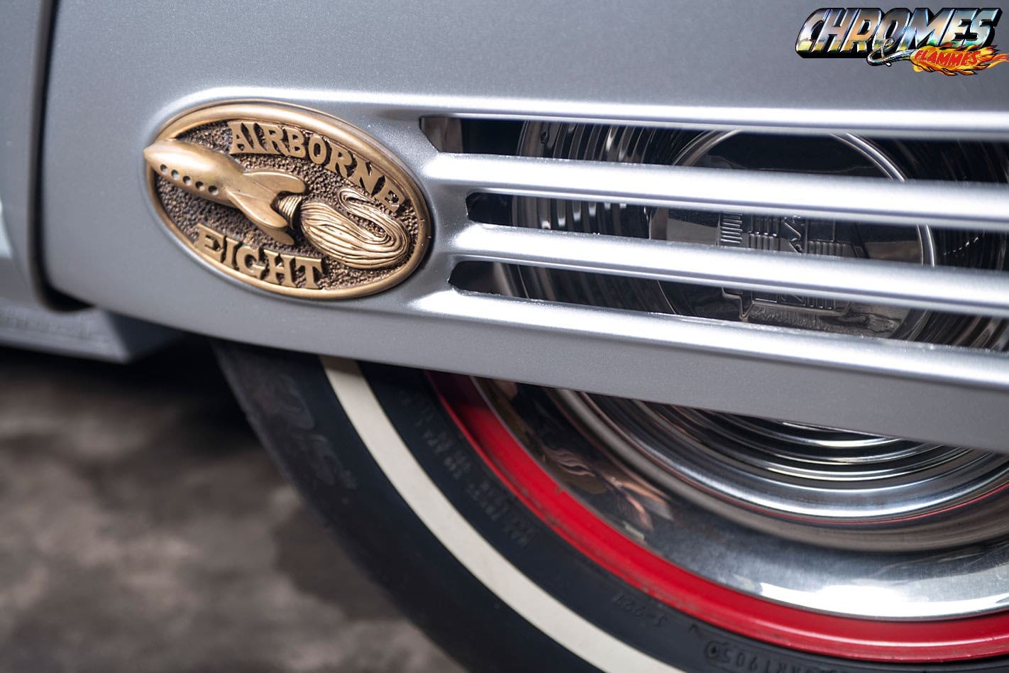 C’est ainsi que j’ai découvert le parfait exemple de ce qu’est un Kustom monstrueux, l’Airborne Eight, un des constructeurs autrefois fiers de l’industrie automobile américaine qui ont maintenant disparu depuis longtemps, tels Cord, Hupmobile, Stutz et Airborne…. Sachez tout d’abord, que l’Airborne Four au début des années’20 a été un échec car ne pouvant pas monter les rues en pentes de San Francisco ainsi que sortir des parkings souterrains. Est alors arrivé l’Airborne Six, surnommé “Pinocchio-Car” en raison du long nez de son capot, nécessaire pour s’adapter à un moteur 6 cylindres en ligne.
