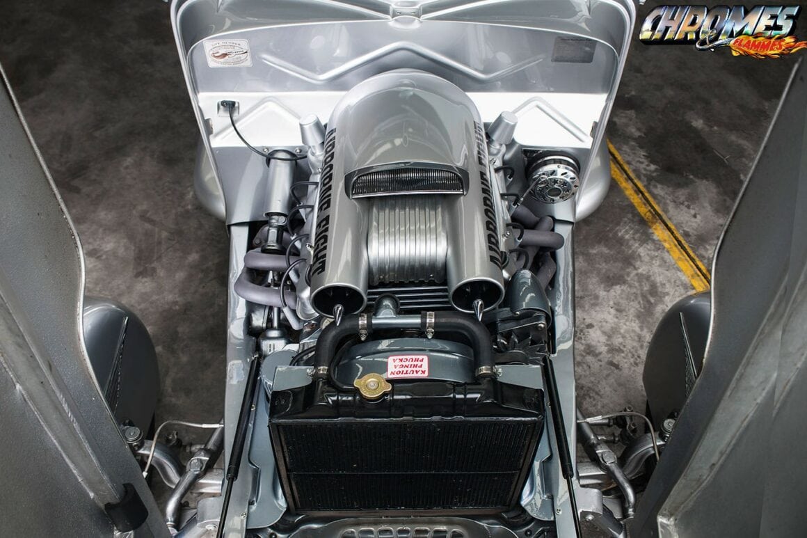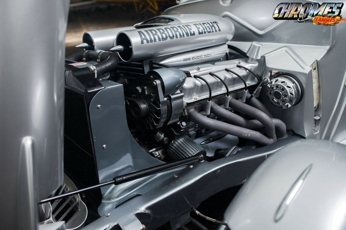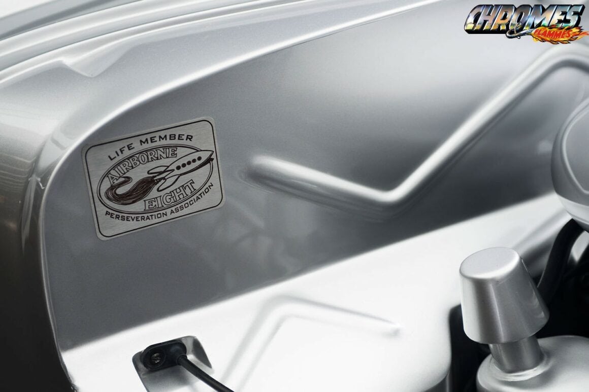 Un démarreur à couple élevé MSD et un arbre à cames Comp Cam de 60 mm complètent ce V8 SRE 727ci équipé d’une injection électronique de carburant ainsi que d’une pompe de direction assistée et même d’un compresseur de climatisation, ce qui le rend idéal pour une application de tramway (gag !), d’ou sa nouvelle vie dans l’Airborne Eight de Bluey. Les prix d’un moteur complet sans aucun des ajouts sont de 57.400 USD. Le moteur acheté date de 2016, il n’a jamais été utilisé ni même monté sur une voiture car le projet pour lequel il a été commandé ne s’est jamais concrétisé. En conséquence, il a été stocké.