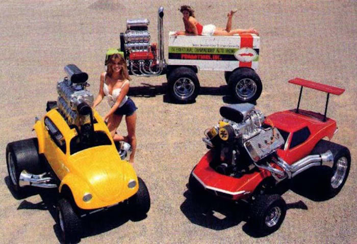 Il a fallu environ deux mois à Chuck Miller, pour construire les quatre premières voitures Zinger, il s’agissait d’une version à quart, tiers voire demi-échelle de vraies voitures, mais avec des moteurs de taille normale qui sortent du capot… La première était une Volkswagen. “Nous avons construit un modèle en argile, comme le ferait le studio d’un constructeur automobile” m’a dit Chuck Miller… Le proto/base en argile a servi pour réaliser un modèle au 1/2 en fibre de verre d’une Volkswagen Hot Rod en fibre de verre. La demi-échelle, a été suivie d’un quart de modèle. De bout en bout, d’un côté à l’autre et de haut en bas, deux Volkswagen Zinger s’insèraient dans l’espace d’une Volkswagen grandeur nature. Avec le moteur paraissant démeusurément énorme, le succès fut hallucinant… Les ventes atteignaient des sommets, l’argent coulait à flors ininterrompus…
