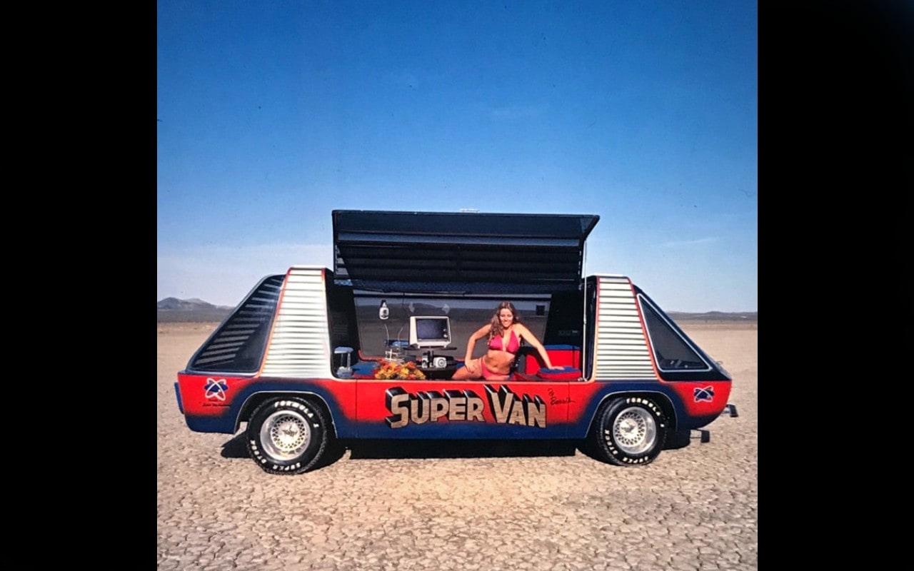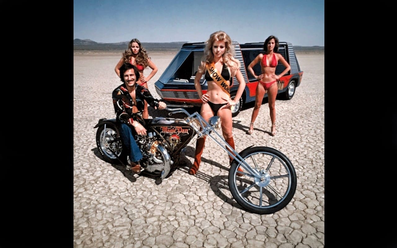 -“L’idée de l’affiche était de créer un visuel accrocheur qui attirerait les geeks du cycle hard-core et les personnalisateurs de camions macho. En outre, Mr De Bruyne, vous devez réaliser que les années ’70 étaient une époque de “têtes de pot”, hippies, radios CB, mauvaise musique, stagflation, fourgonnettes super personnalisées, lits d’eau, sexe ouvert, licornes peintes, fonds de cloche et de chiottes, Corvettes vert pistache et Hot-Rods fluos, la guerre du Vietnam et les tapis shag. J’ai décidé de faire poser quelques Pin-Up’s chaudasses au milieu du désert sur le lit asséché du lac de la base aérienne d’Edwards en Californie, avec la moto la plus célèbre de son époque, la “Magic Pan”, aux côtés d’une création de George Barris appelée à l’origine “Love Machine”, puis rebaptisée “Super Van”.