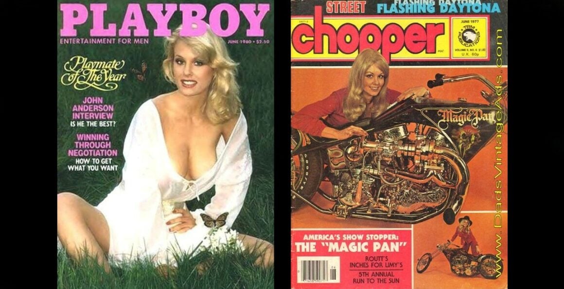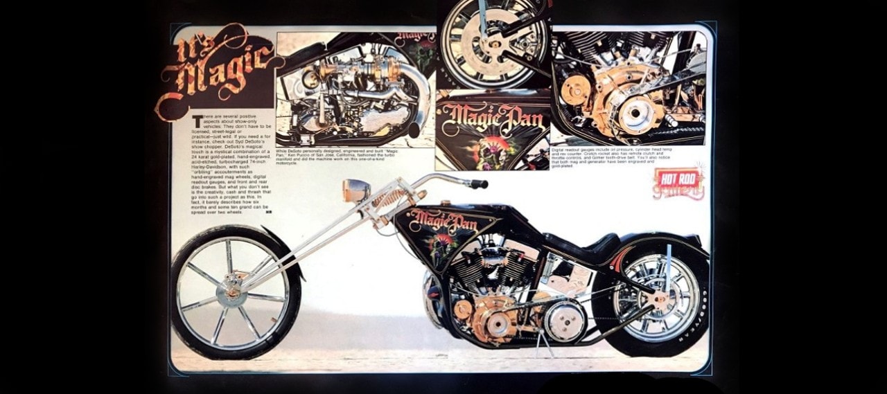 -“Le “Magic Pan” de Syd DeSoto a été transporté par camion dans le désert pour faire son grand spectacle. C’était un véritable coup de théâtre et on disait qu’il s’agissait d’une combinaison mystique d’une Harley-Davidson turbocompressée plaquée or, gravée à la main et à l’acide avec des accessoires “orbitants” tels que des roues en magnésium gravées à la main, des jauges de lecture numériques et des freins à disque avant et arrière. DeSoto avait conçu, et construit la moto tandis que Ken Puccio avait façonné le collecteur turbo et fait le travail de la machine. Ce n’était pas exactement une fusée à l’entrejambe, dotée de commandes d’embrayage et d’accélérateur à distance, d’une courroie d’entraînement à dents Gilmer, ainsi que d’une magnéto et d’un générateur plaqués or. Plus tard, Hot-Rod Magazine a été tellement intrigué par cette lubricité cosmique qu’il a publié une double page dans un numéro de 1977. Avec le “Magic Pan” au premier plan du lit du lac asséché et fissuré, les trois “playmates chaudasses comme des braises” vêtues de bikinis minuscules ont posé derrière la bête avec le Super Van de George Barris de 1966 en arrière plan !
