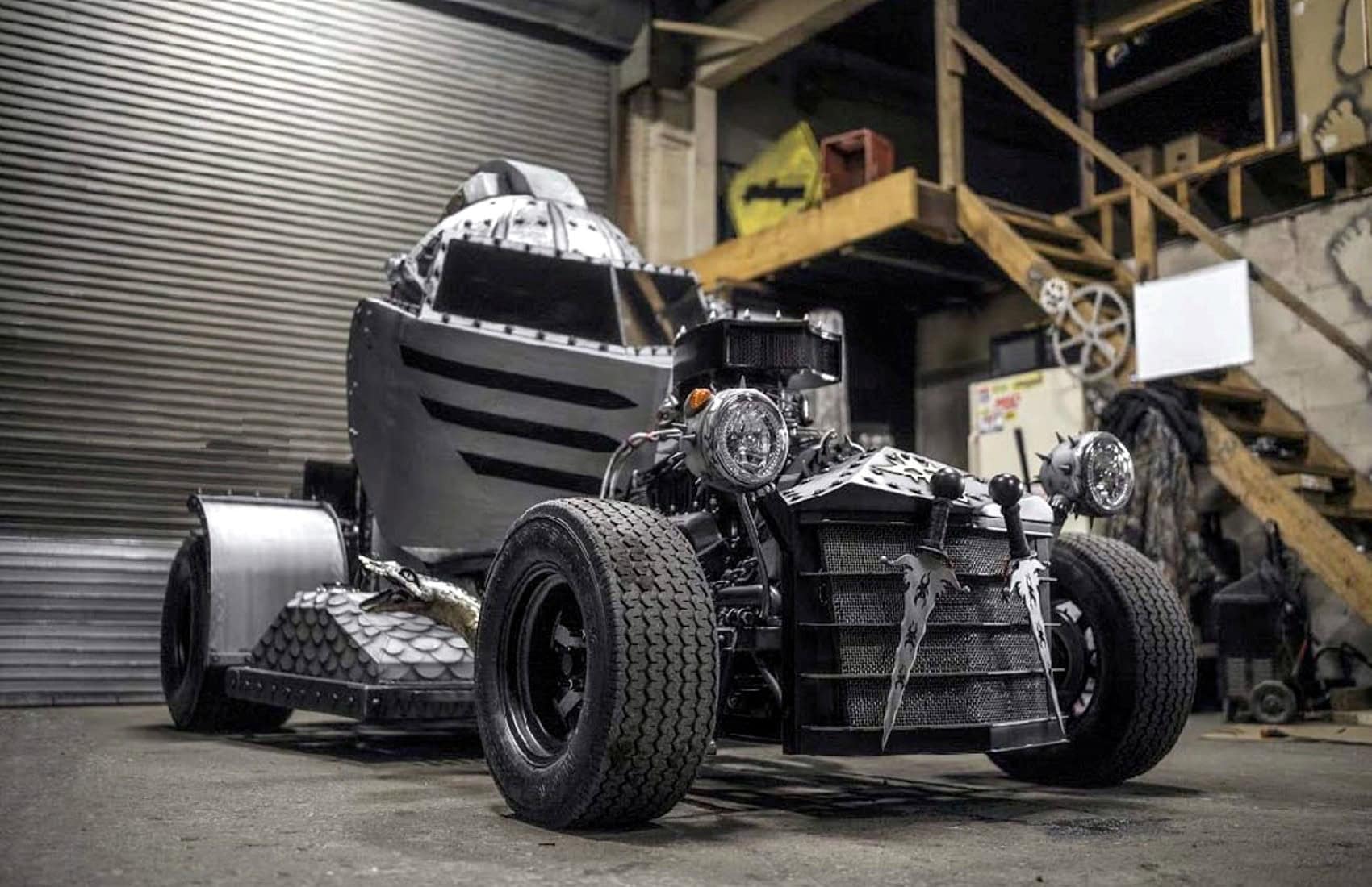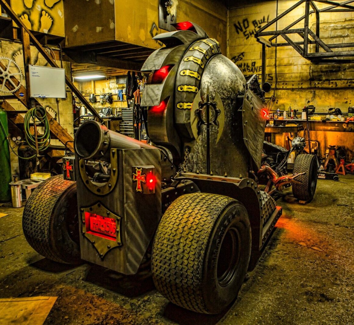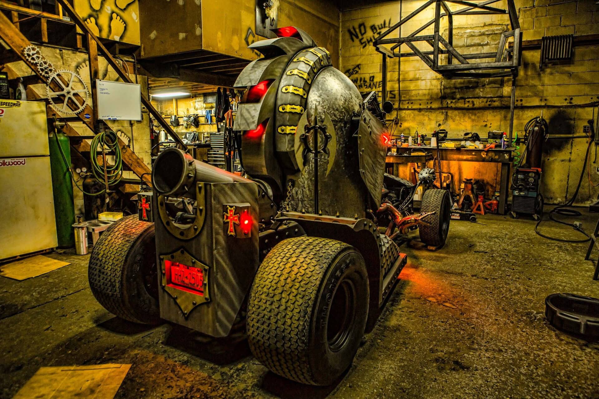 Bohata Design Inc., est un garage installé depuis une dizaine d’années à Long Island, New York, USA qui réalise exclusivement des Hot Rods et autres engins les plus fous et décalés que possible. Ils sont “Steam-Punk à donf” et vivent le Steam-Punk également “à donf”, construisant des Hot Rods et également tout ce qui est Steam-Punk en Déco’s de mobiliers métalliques, Choppers et Hot Rods… AJ Bohata est le Big-Boss, capable de réaliser l’impensable… C’est ce qui en est sorti qui a créé l’évènement d’écrire cet article… Tout a commencé avec une entreprise de gestion des déchets qui voulait “marquer le coup” avec une sculpture roulante… Il leur a construit un mini-camion à ordures unique, radiocommandé, destiné à transporter des barbecues pour les fêtes d’avant-match. Et pour une nouvelle boite de nuit avec restaurant hyper chic et hors de prix style “Old-Castel”, il a créé et réalisé le Hot Rod “Medieval One”…