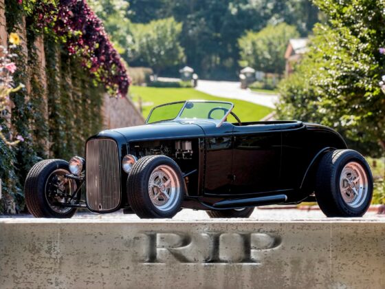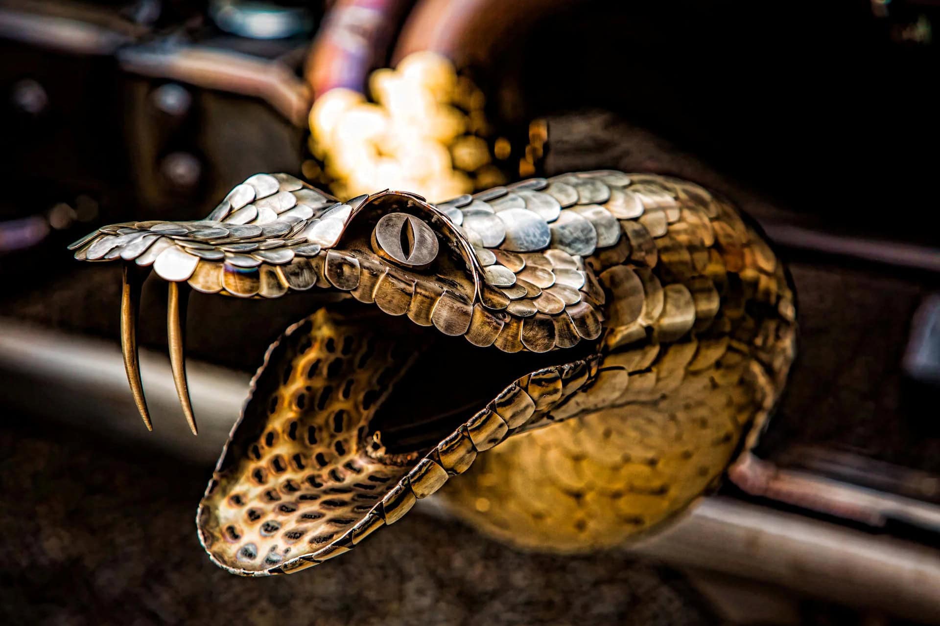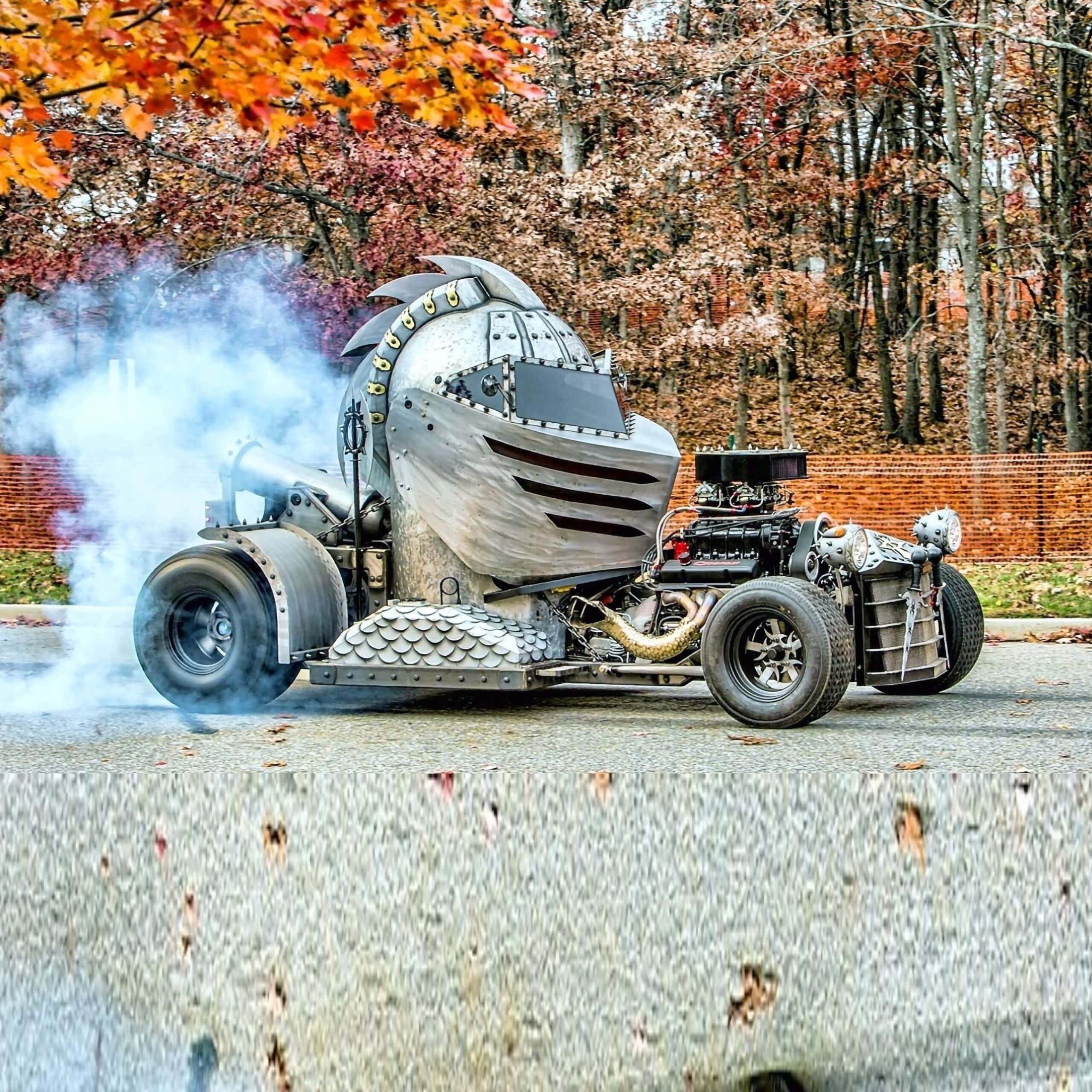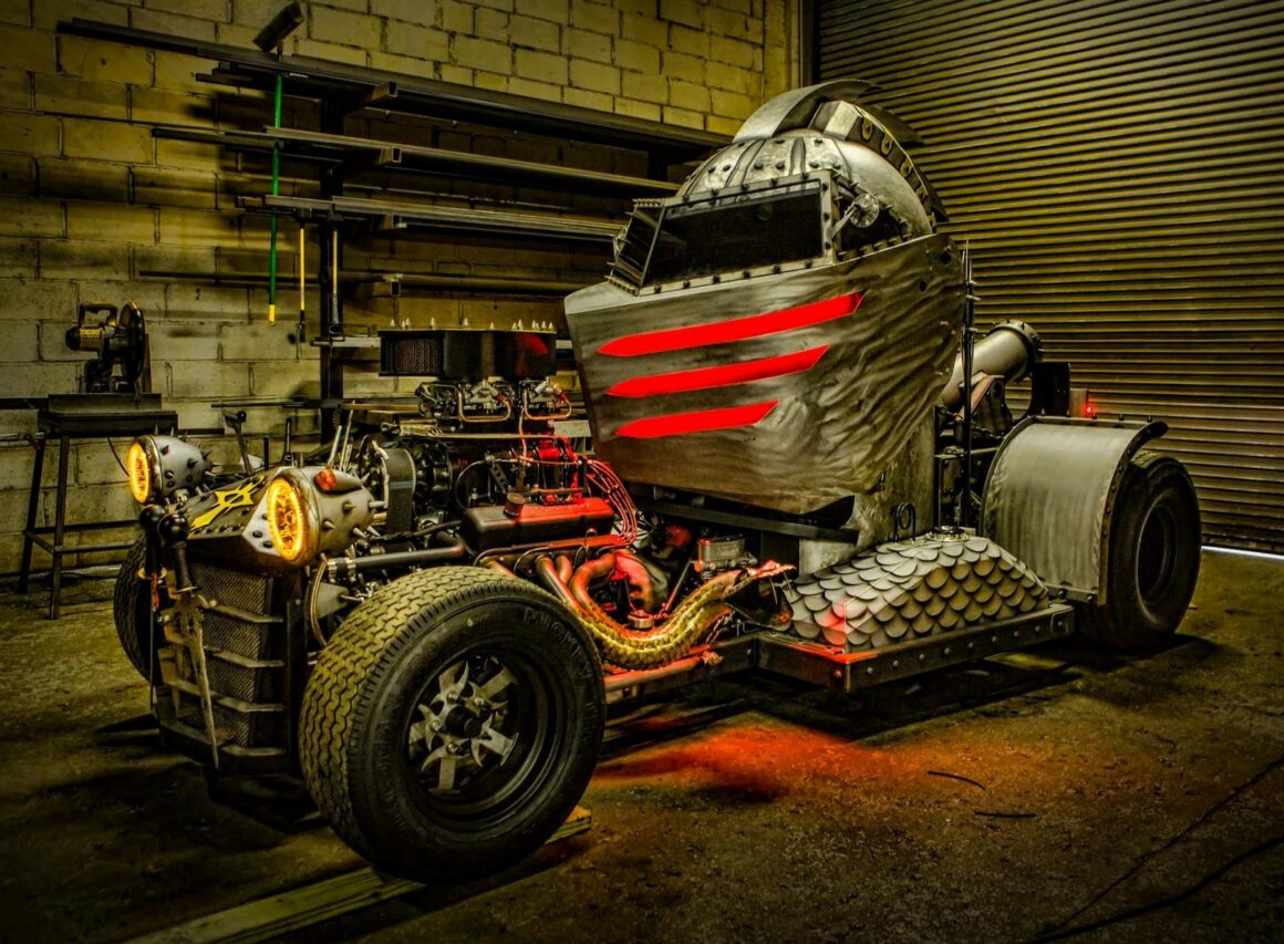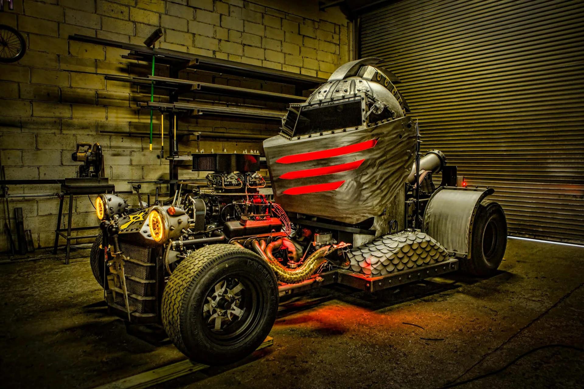 Deux serpents/dragons attirent également et directement l’attention. Ils se composent chacun de 900 écailles en acier, découpées au laser avant d’être façonnées/soudées en masse avec une matrice hyper personnalisée et beaucoup de martelages fastidieux. Une fois les 1.800 écailles formées, rassemblées et soudées, les échappements sont semblables à une paire de serpents crachant du CO2, qui sortent du petit bloc 355ci suralimenté d’un Blower Weiand 6-71 avec Nitrous Oxyde et injection de gaz pour créer des flammes de 2 mètres. AJ Bohata a également créé un ensemble d’accessoires uniques formant la direction assistée, la climatisation et l’alternateur (bas dans le châssis), ce qui permet de mettre en valeur la mécanique qui semble 100% médiévale.